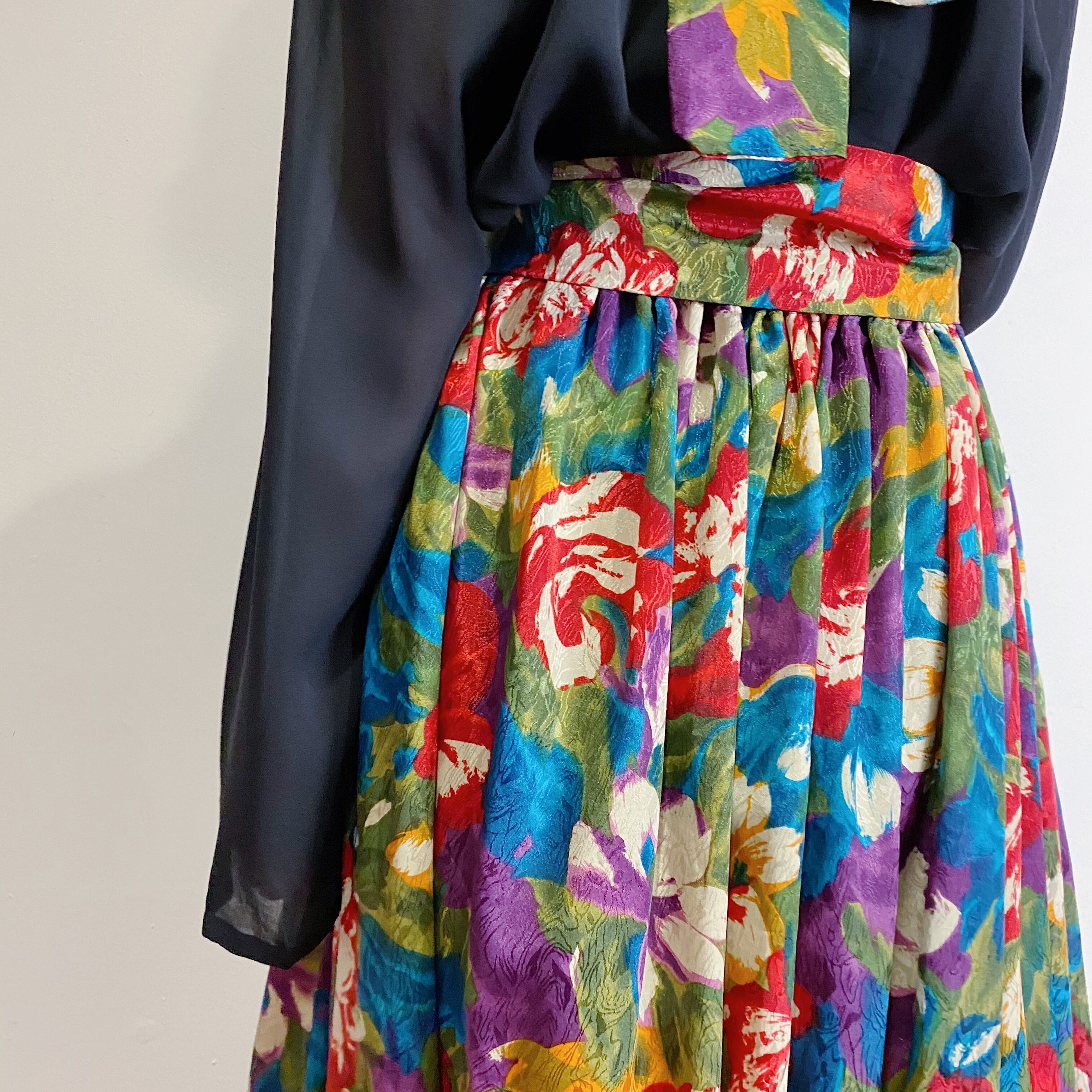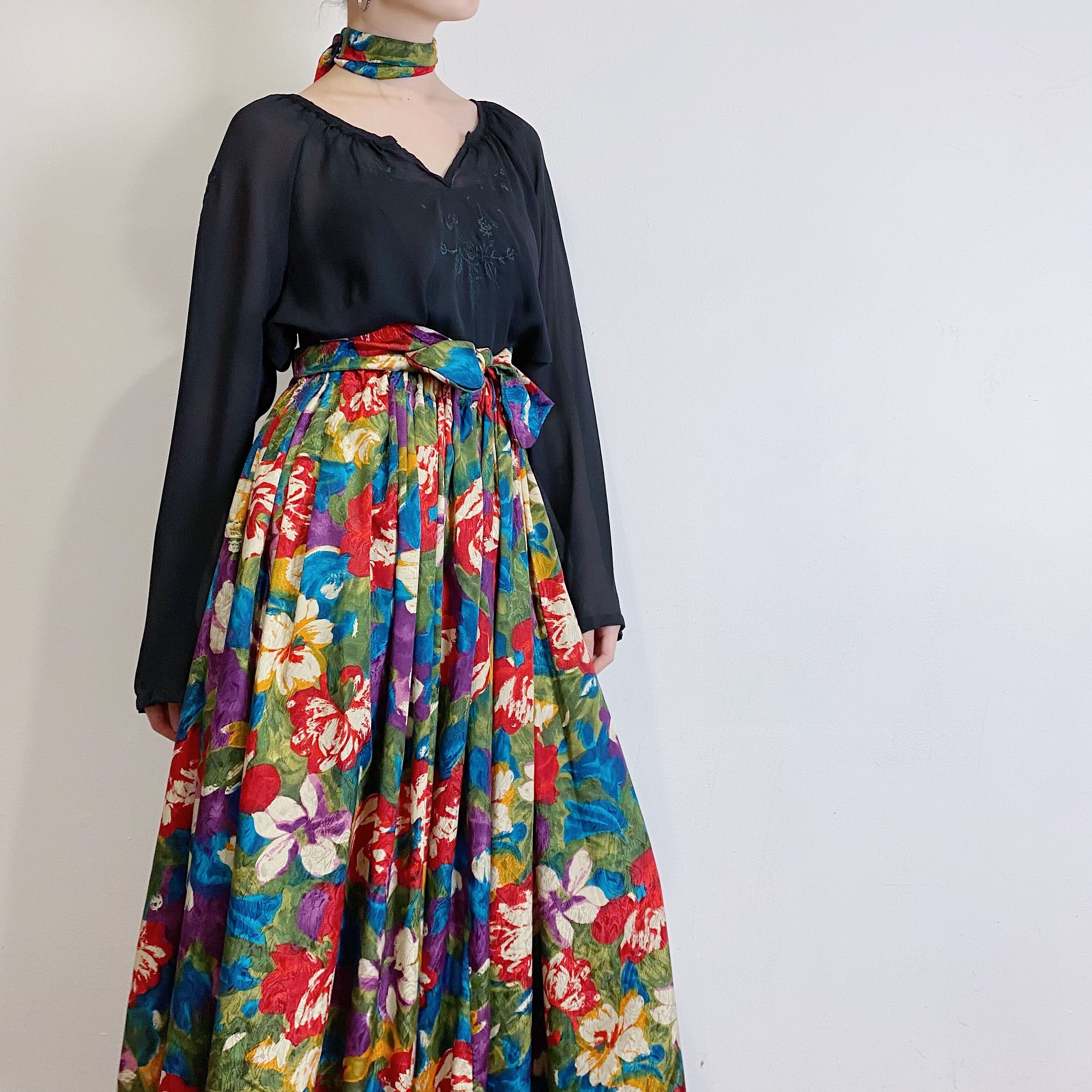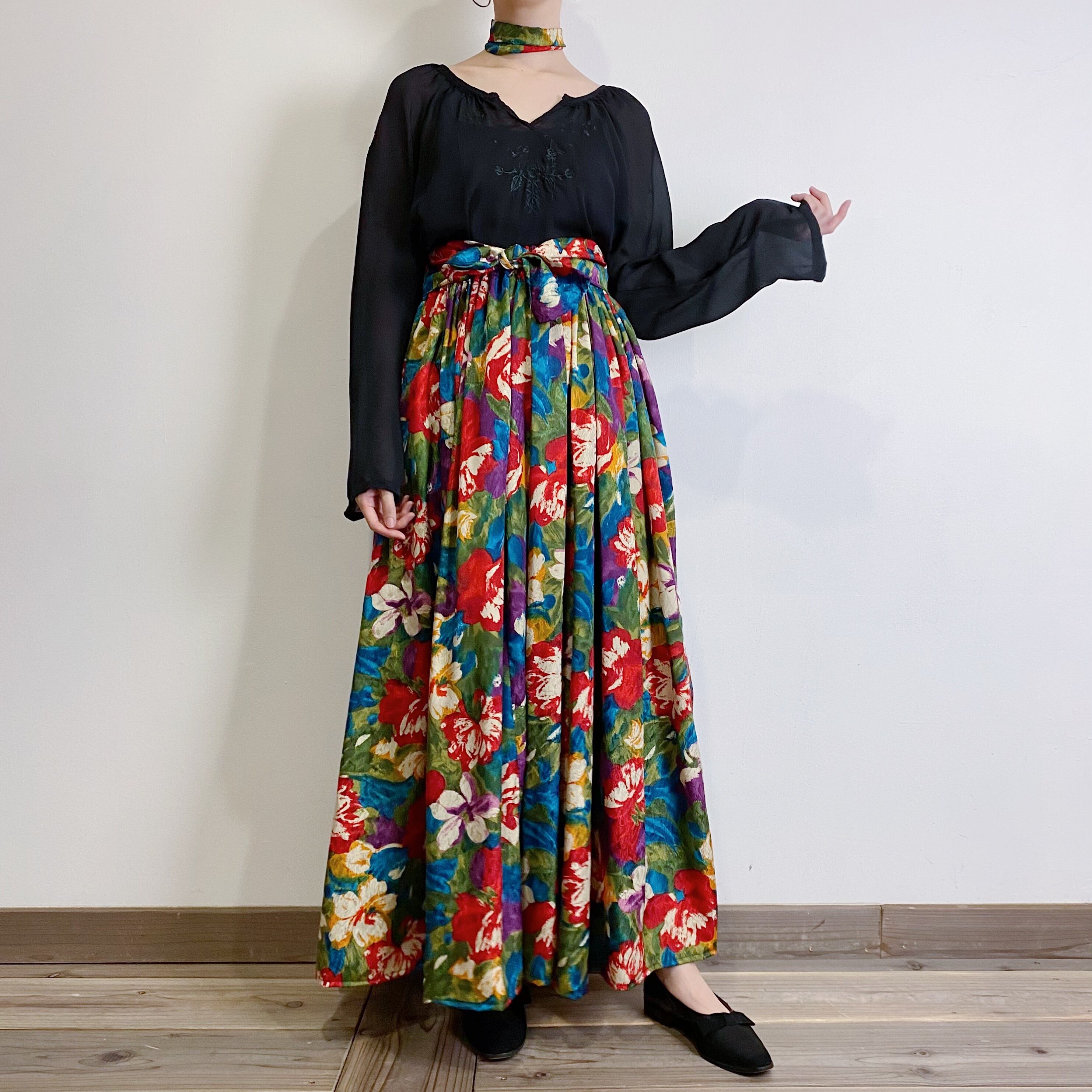 カラフルでアーティスティックな花柄が可愛い、ロングスカートです。