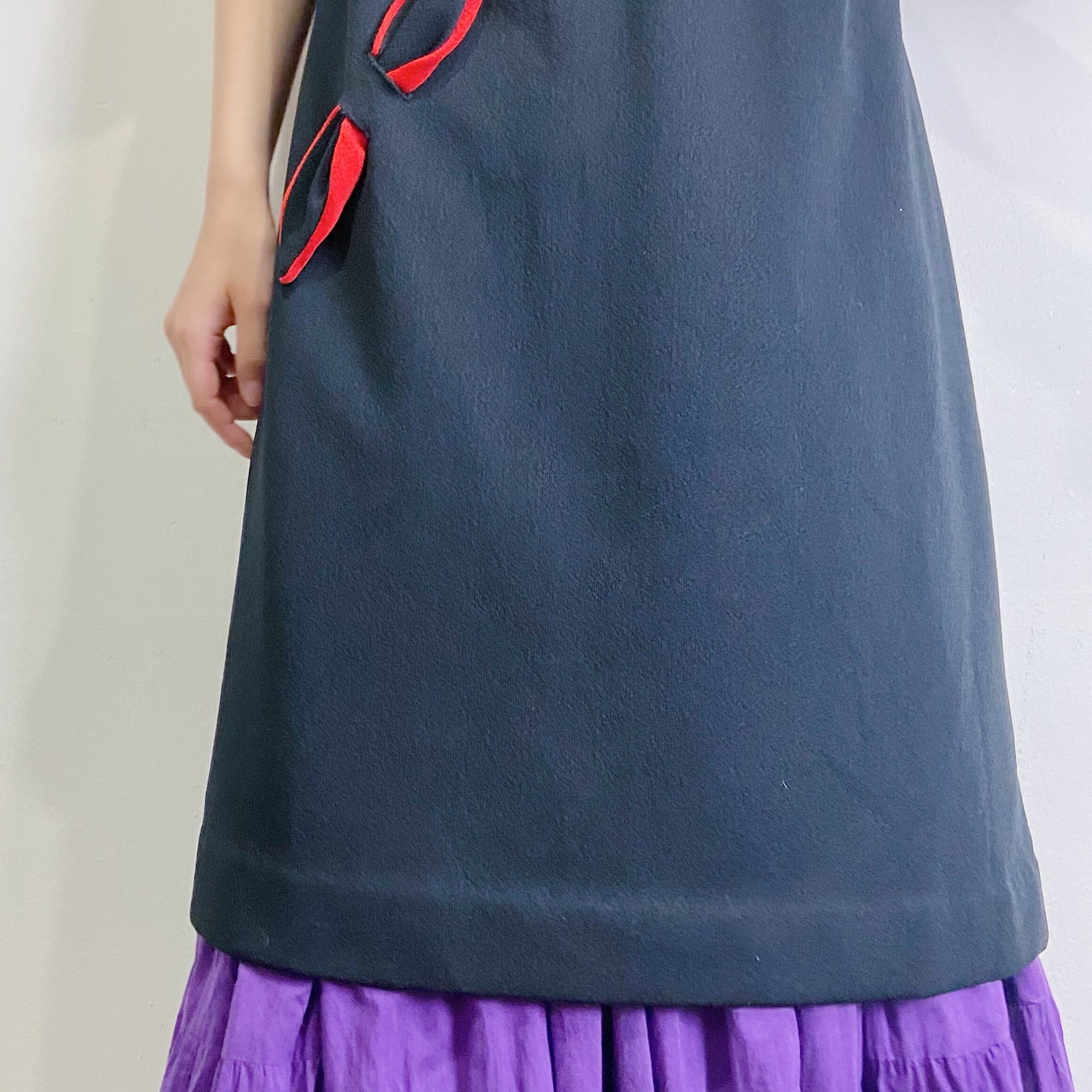 黒地に赤い立体的な葉っぱのようなモチーフがユニークな、ヴィンテージワンピースです。