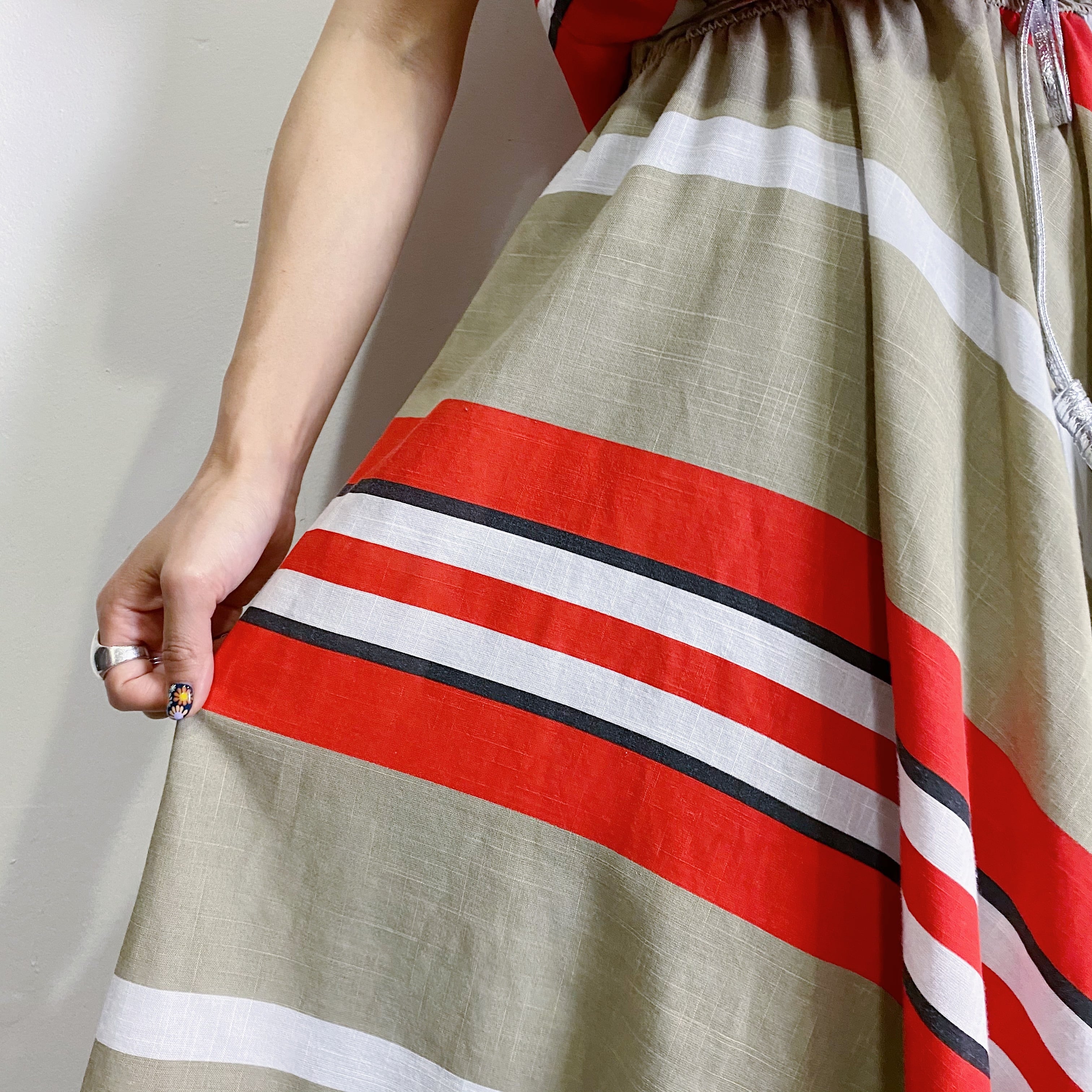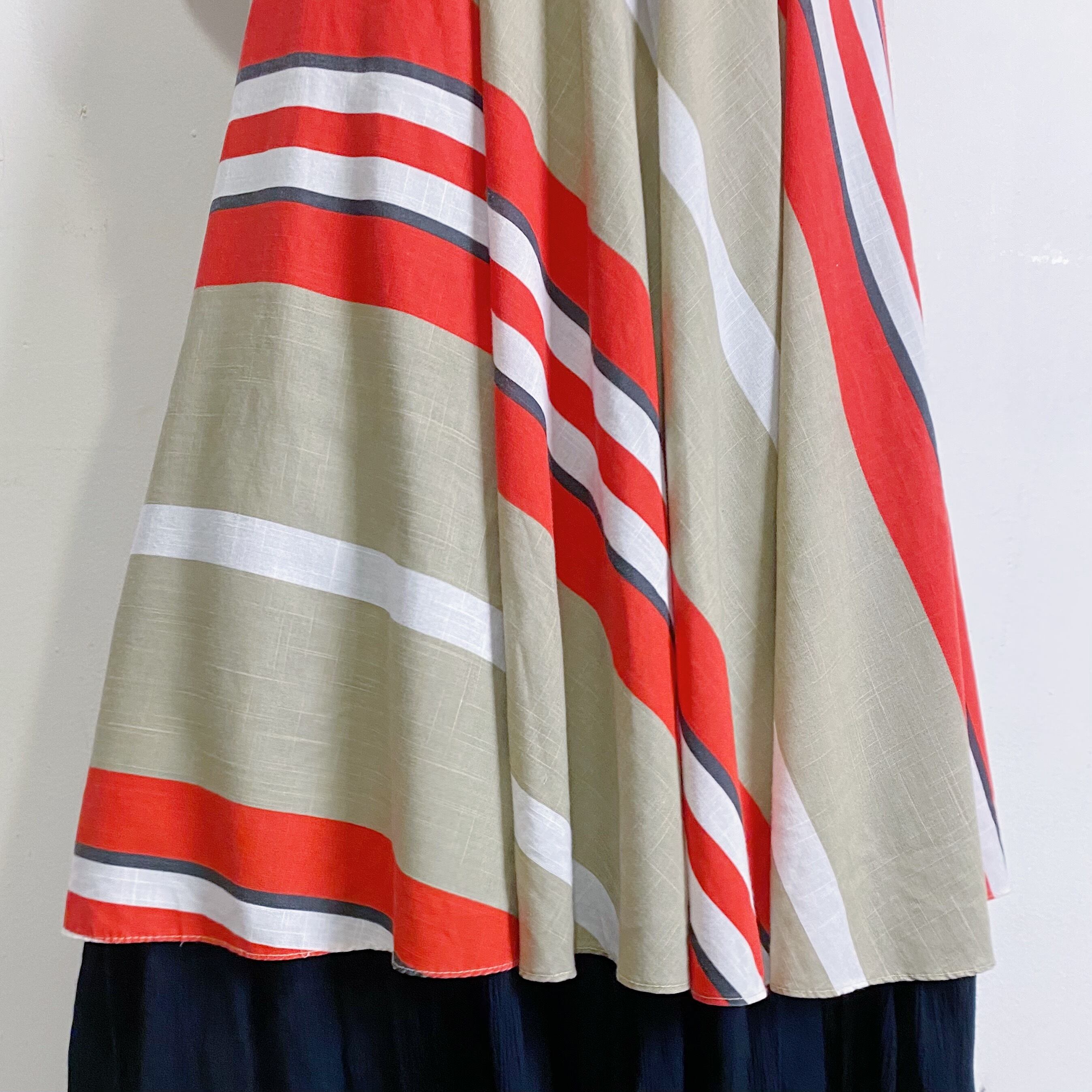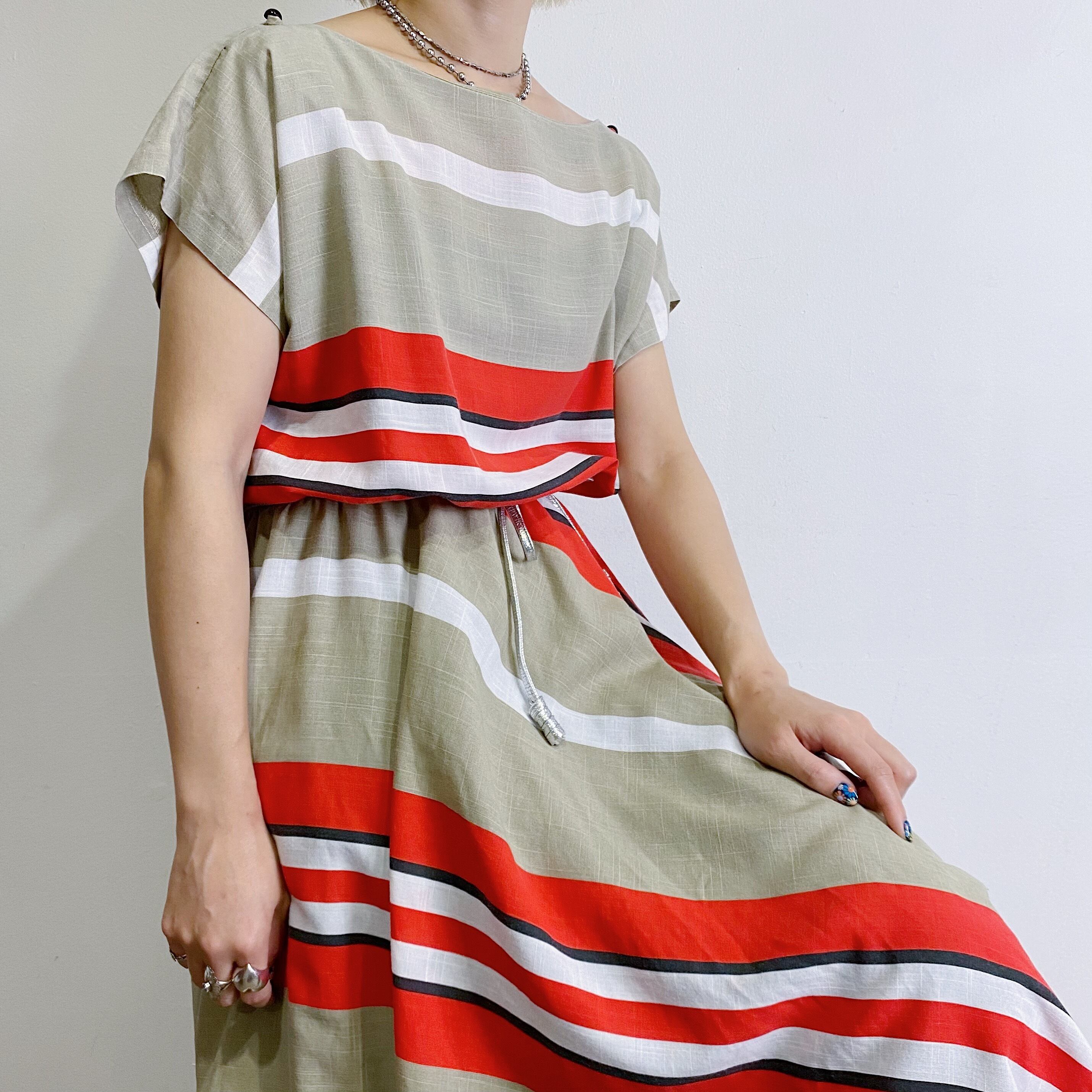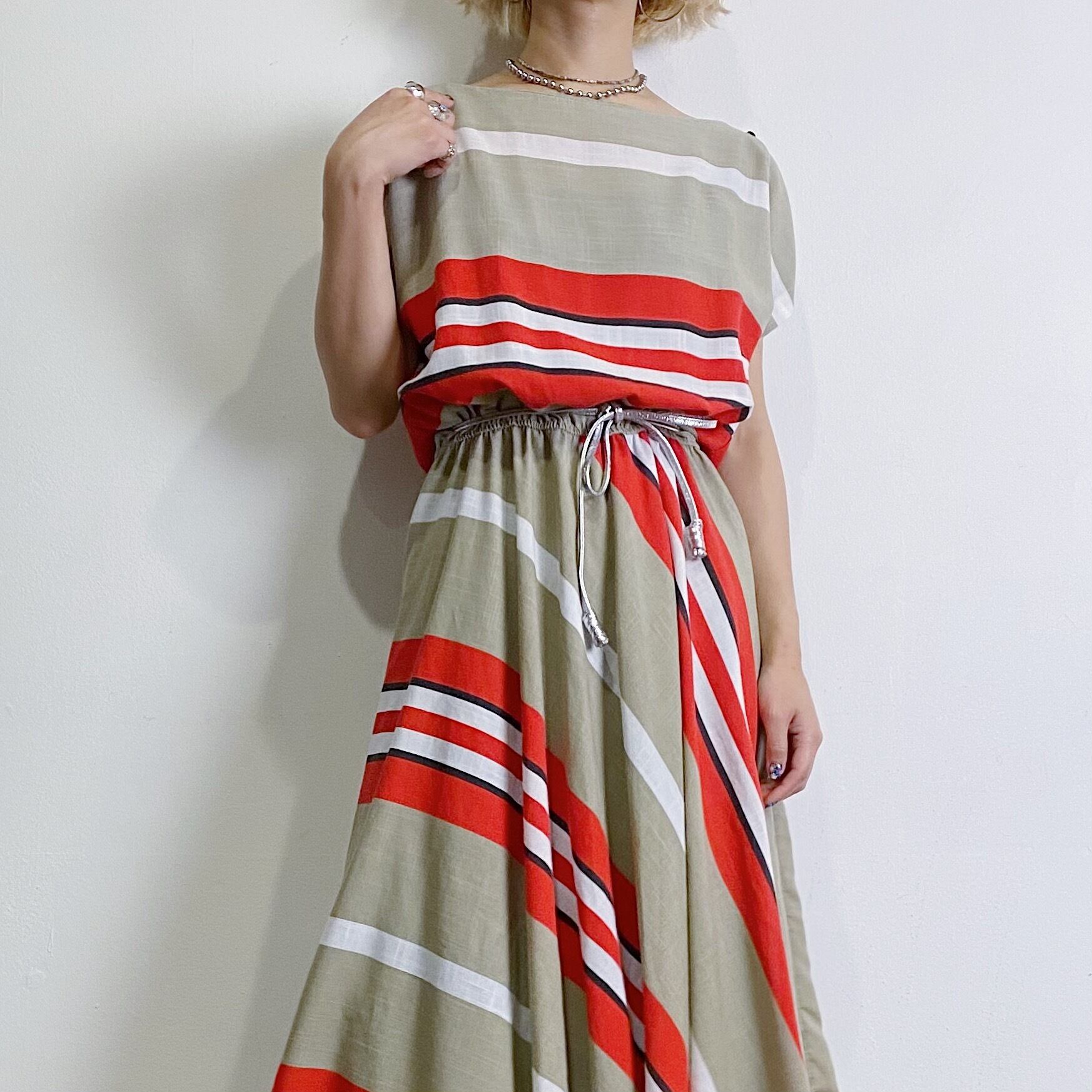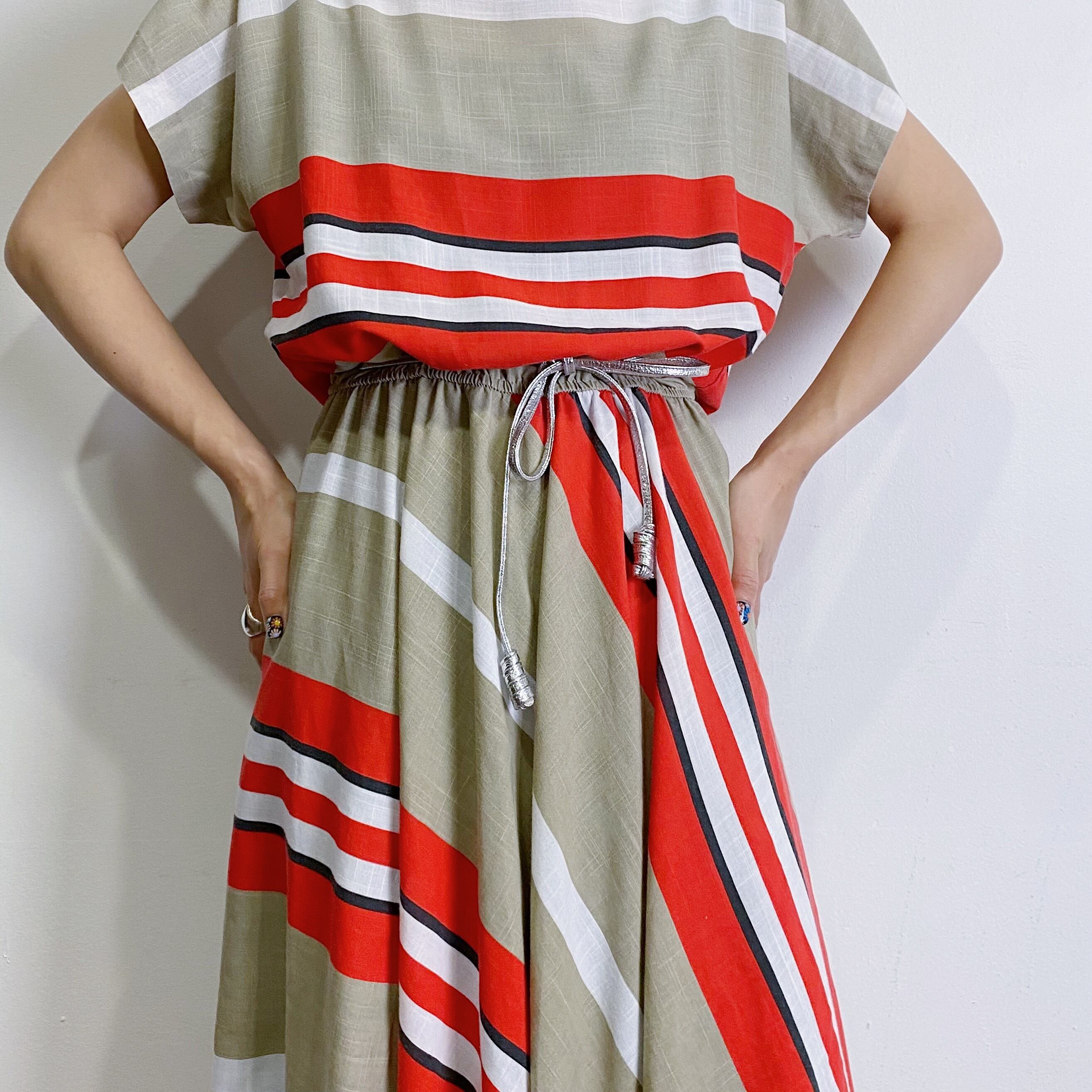 ベージュとレッドの色合いが可愛い、斜めストライプの80年代ワンピースです。