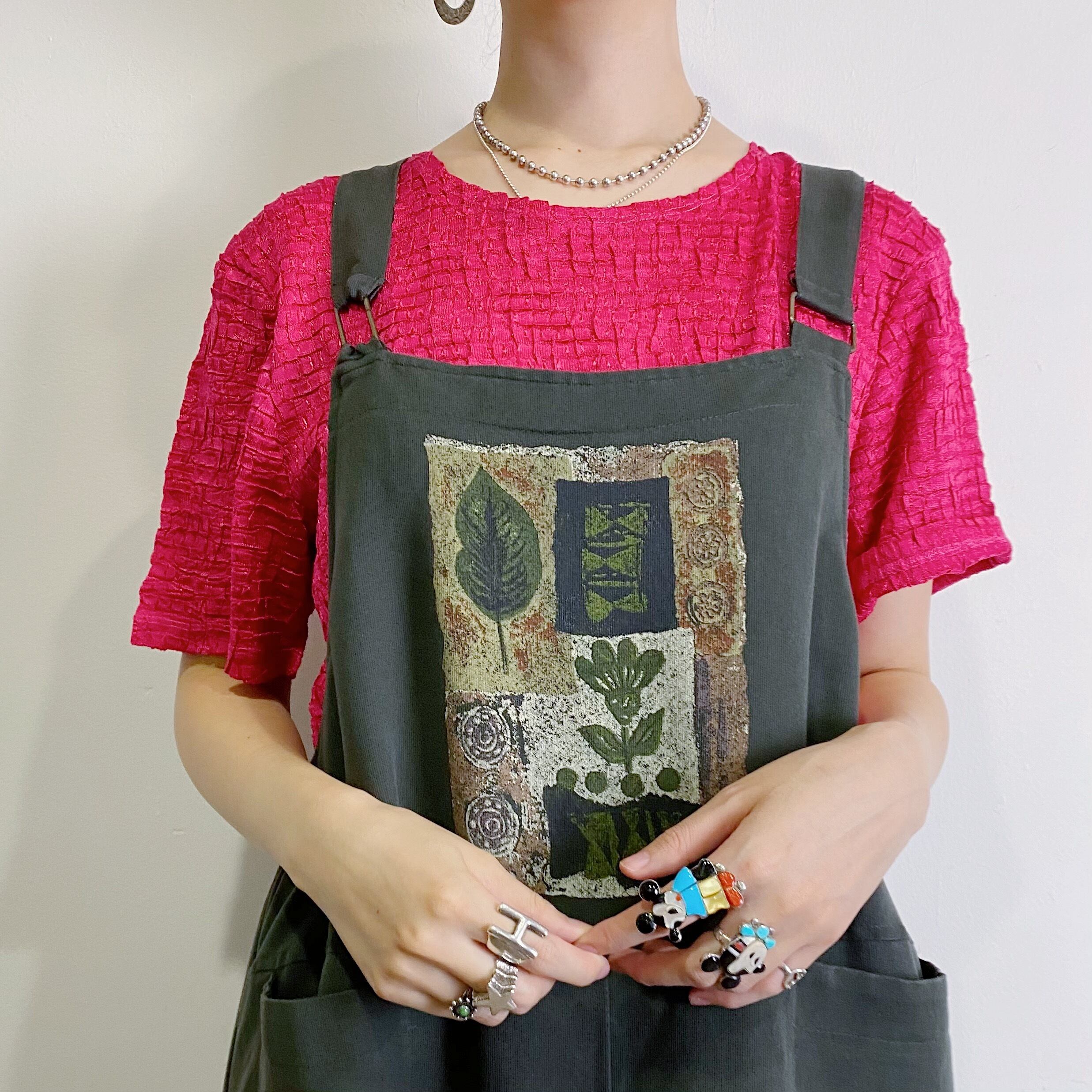 フロントのお花などの絵が可愛い、カーキ色のジャンパーワンピースです。