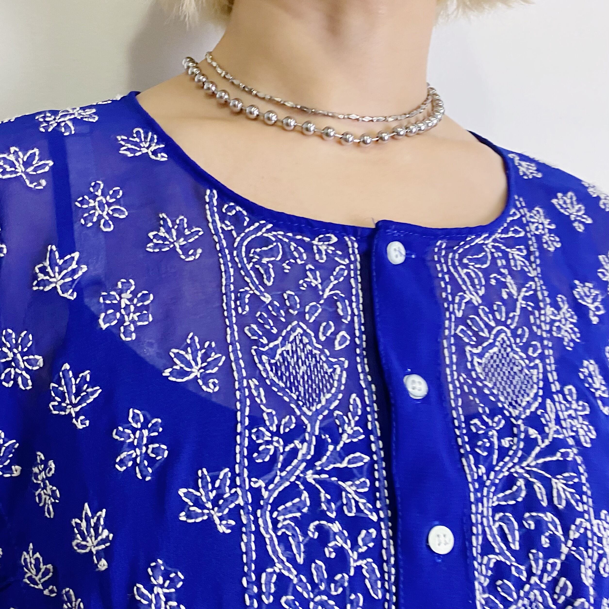 深いマリンブルーの色合いが可愛く、繊細な手仕事が感じられる一枚。
