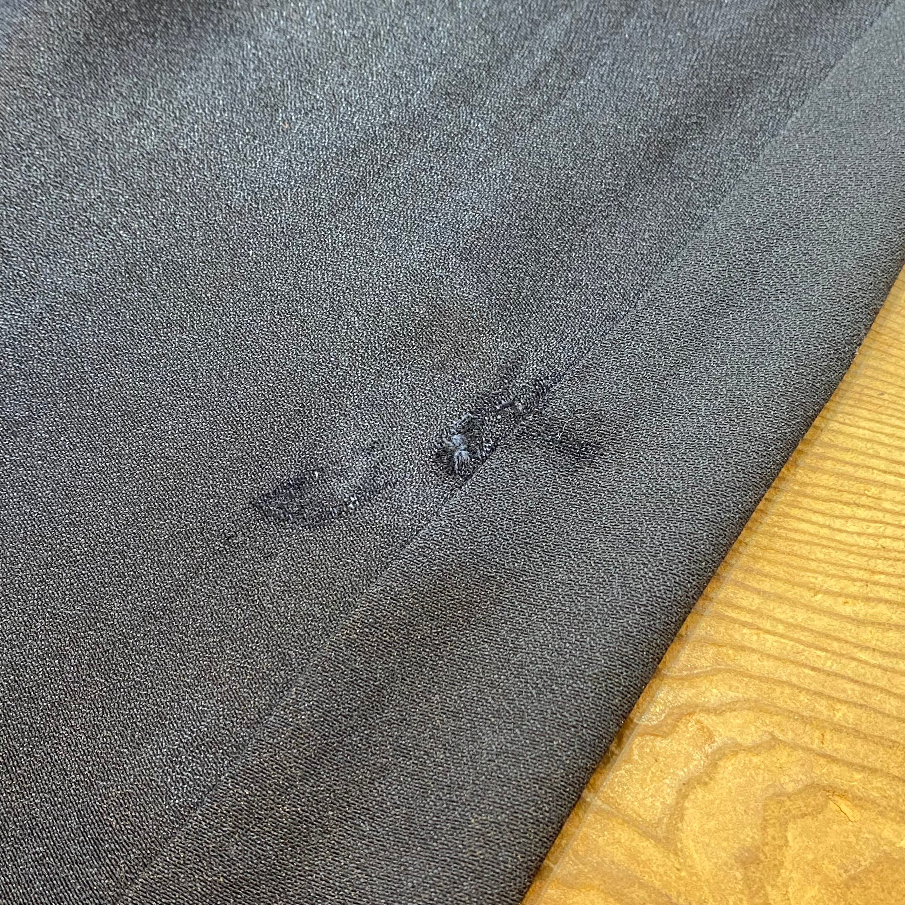 裾付近や背中に軽いダメージを裏から接着芯でお直しした跡が見受けられます。