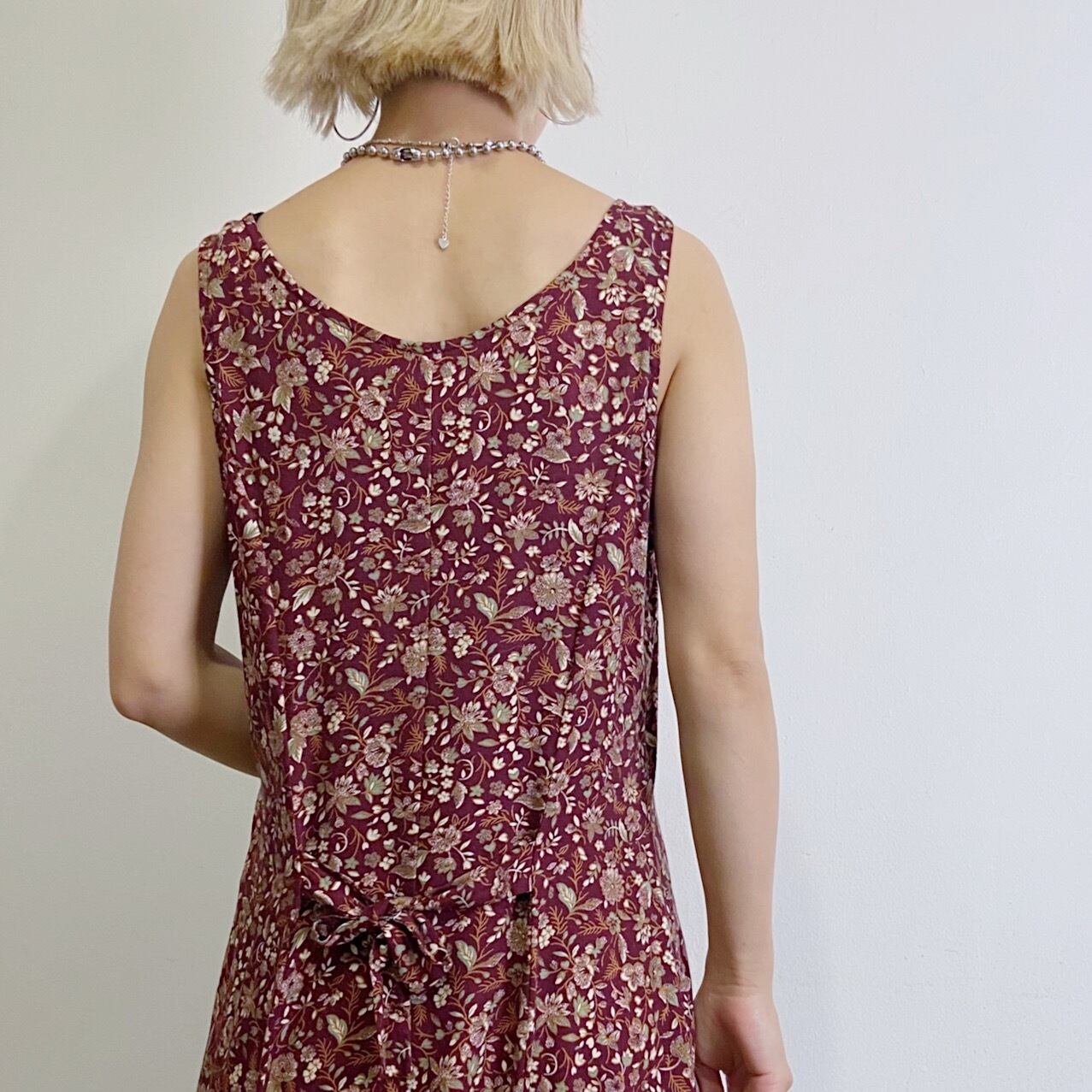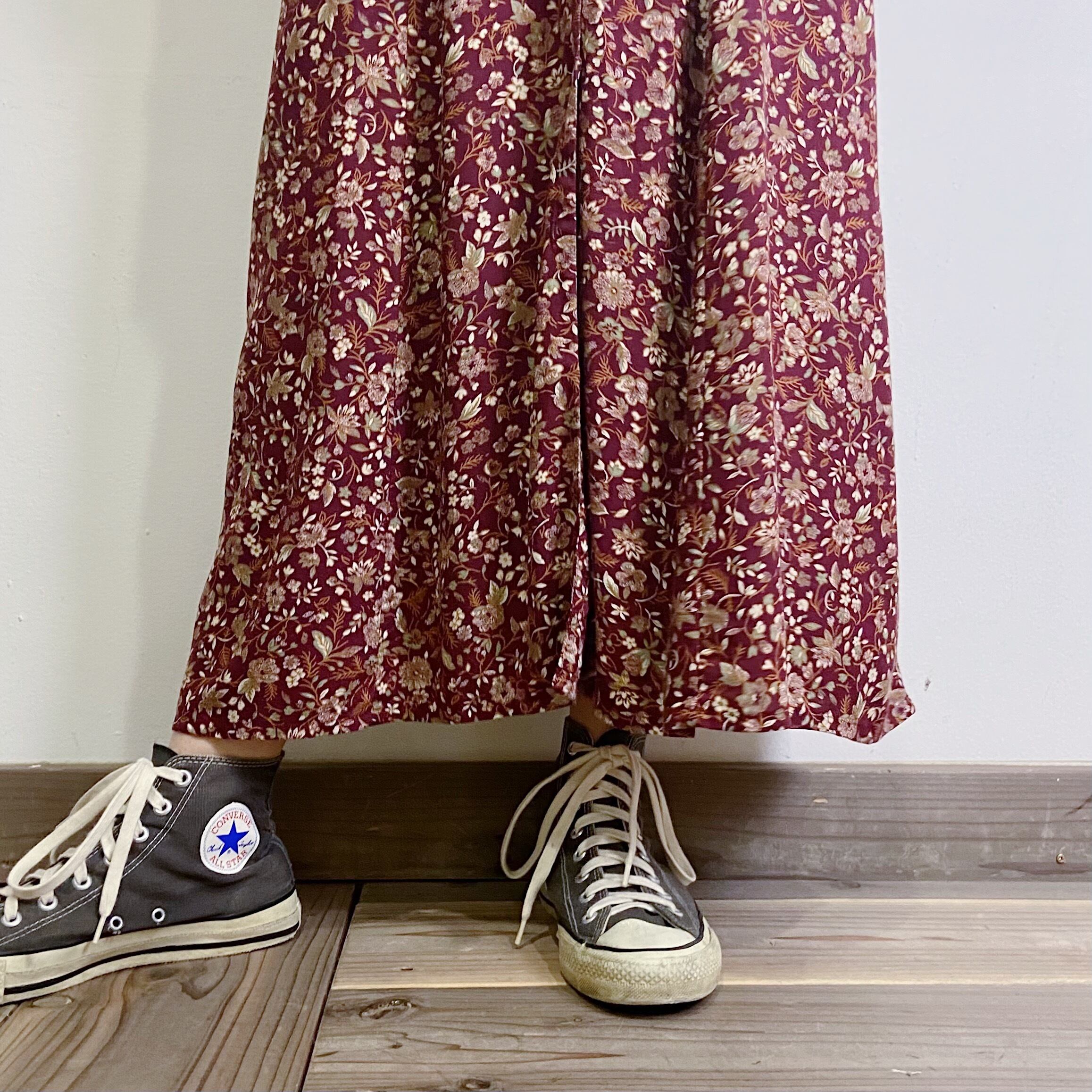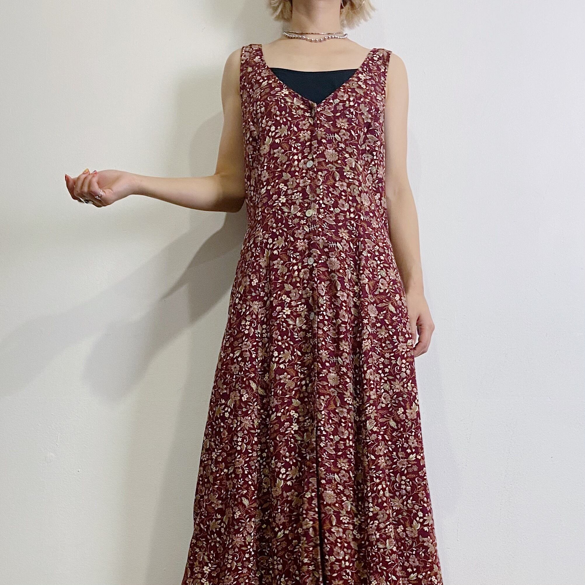 ボルドーカラーが可愛い、小花柄のレーヨンワンピースです。