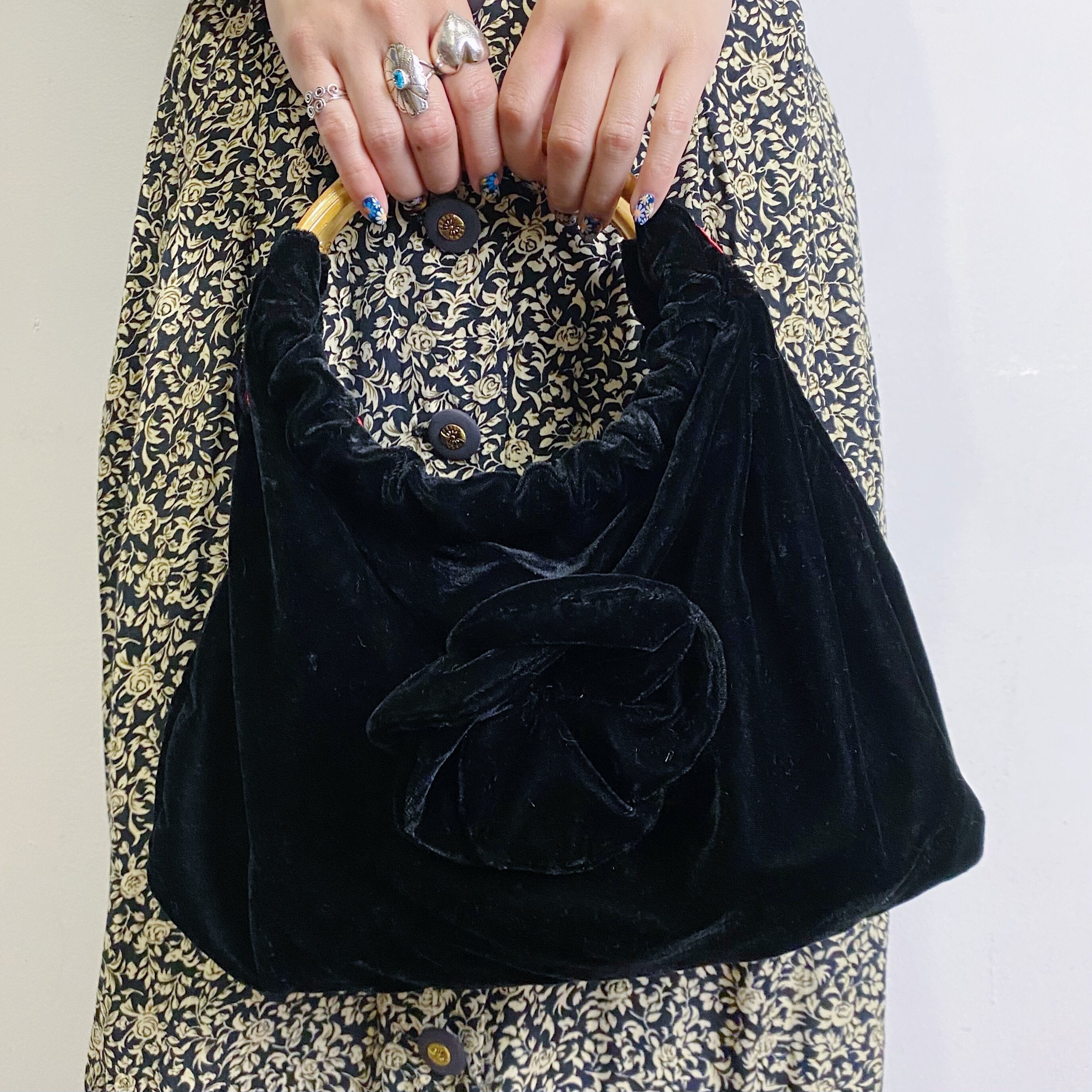 持ち手がバンブー素材になっている、キュートなベロアバッグです。