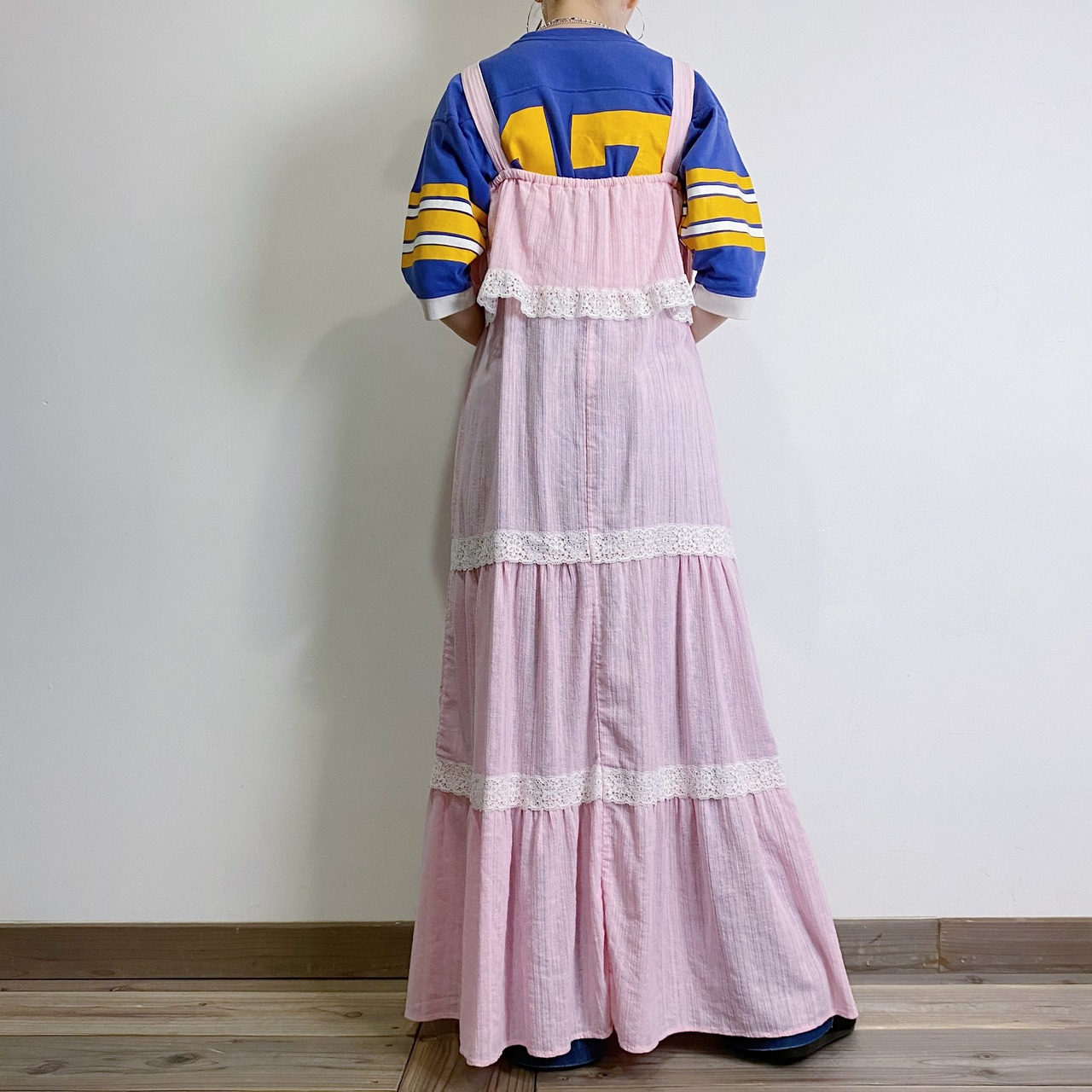 淡いピンクのティアードが可愛い、70年代のキャミワンピースです。