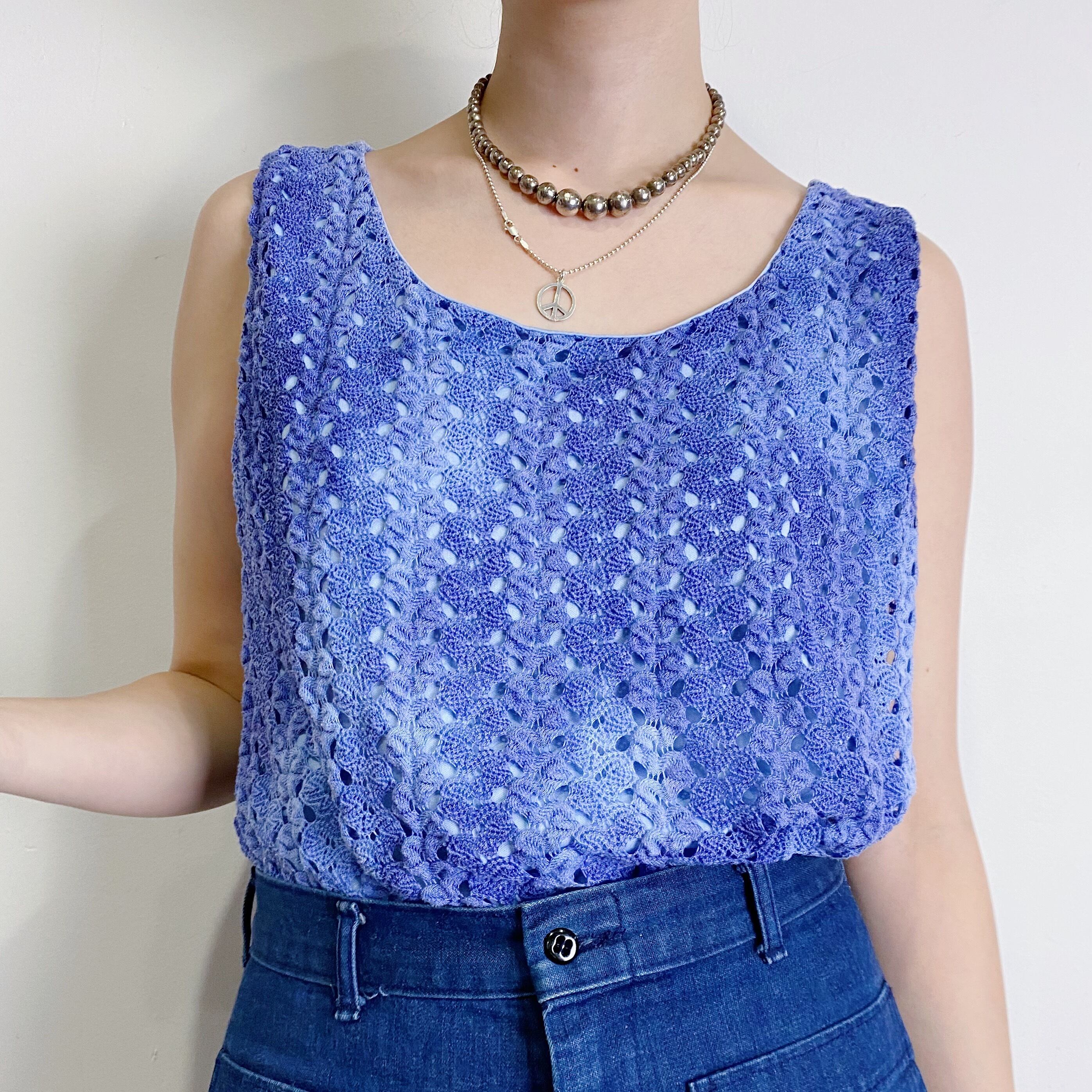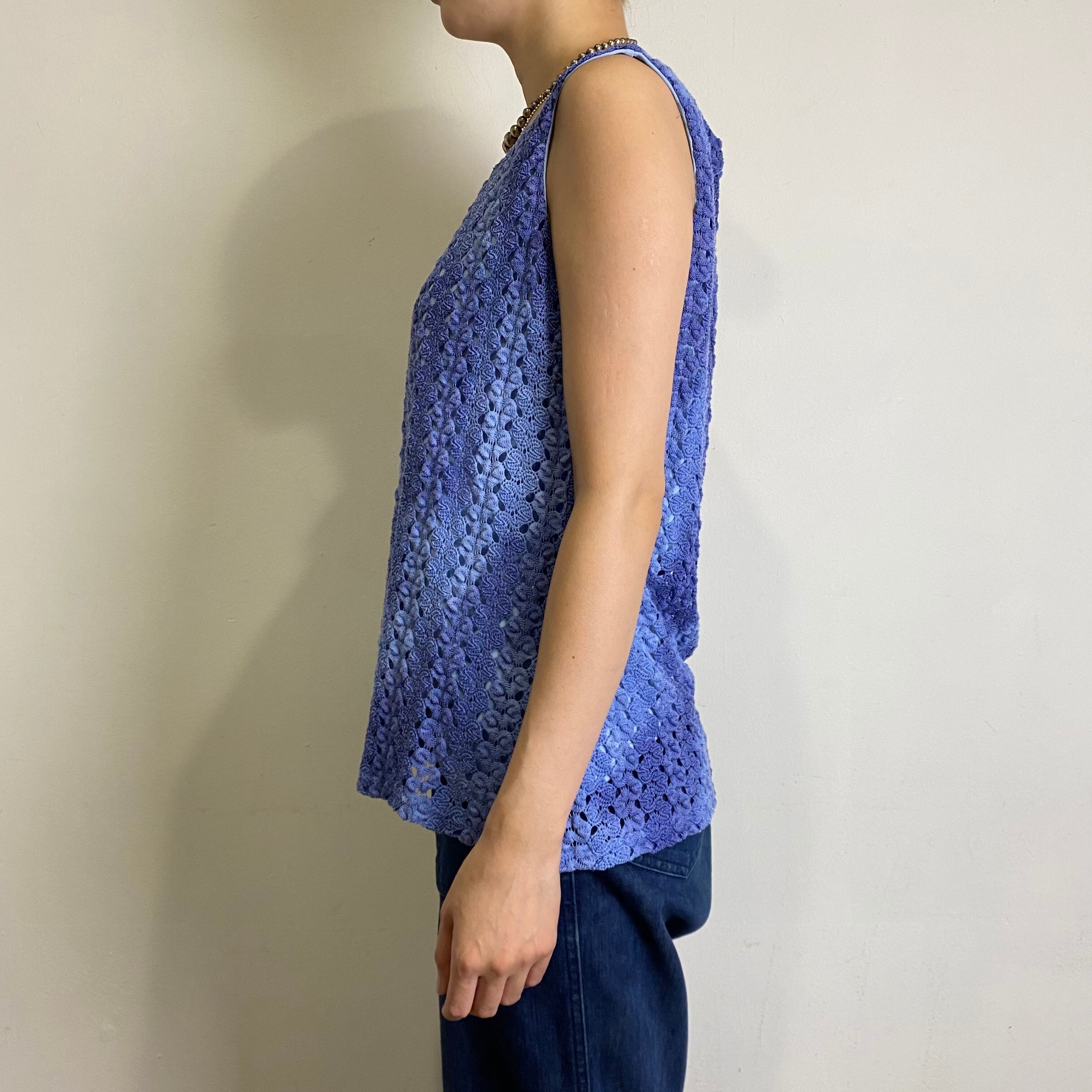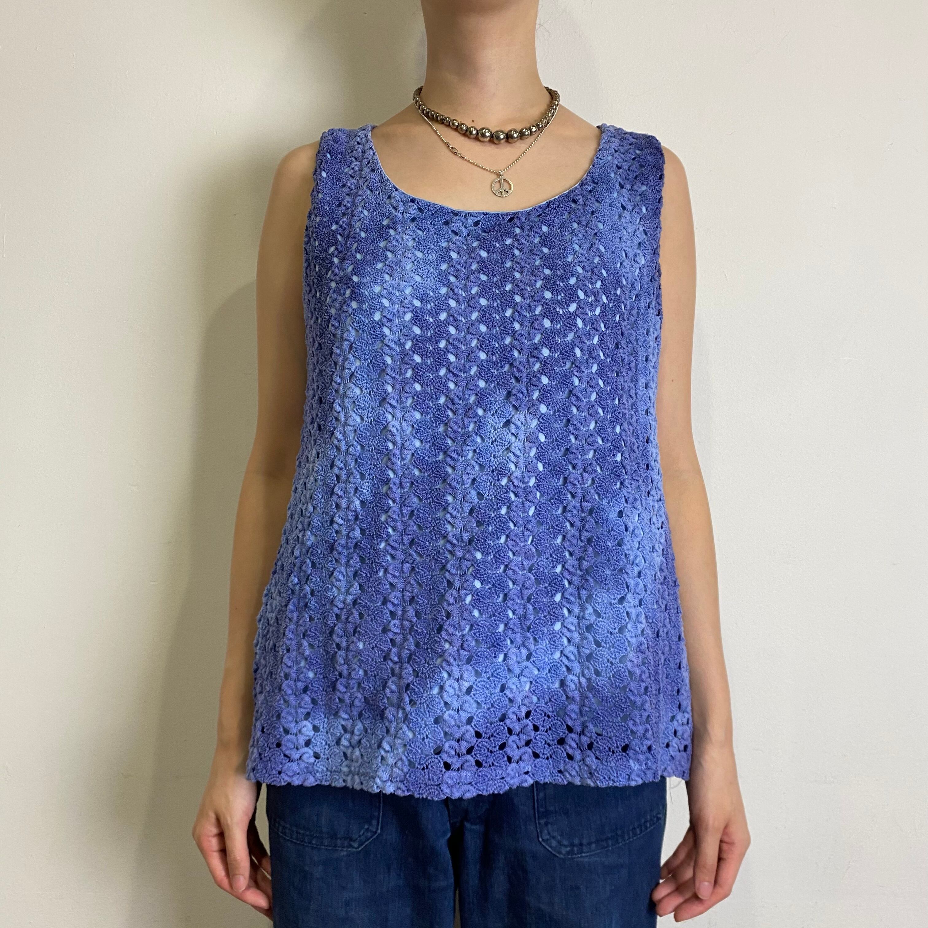 タイダイ風のまだらな色合いの紫色が可愛い、クロシェトップスです。