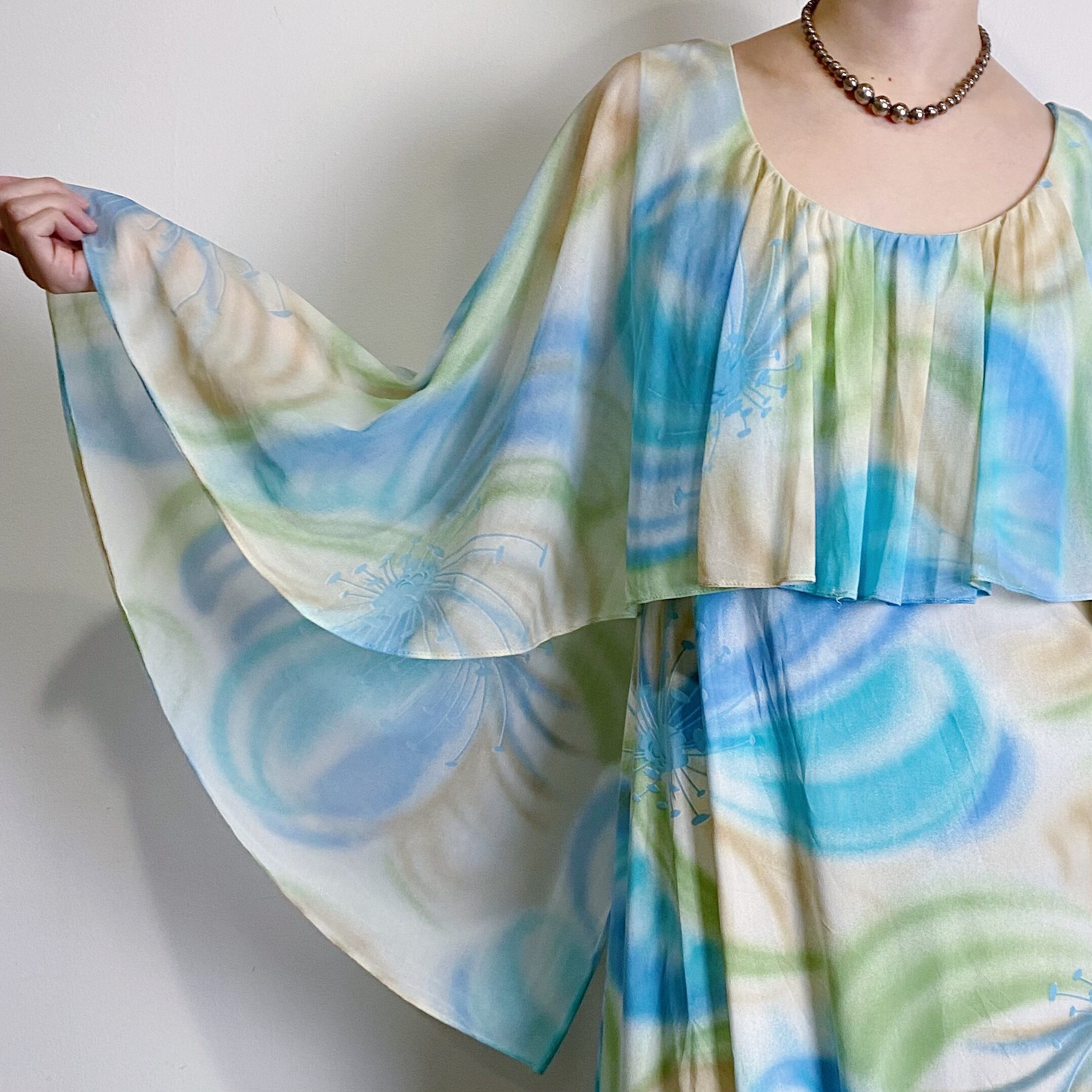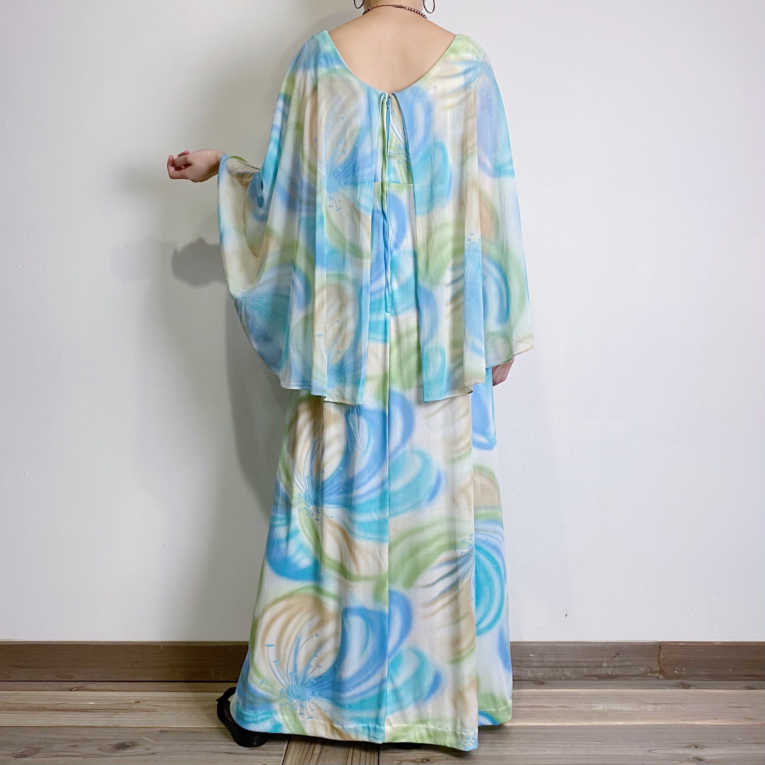 70s blue and green frill designed long dress