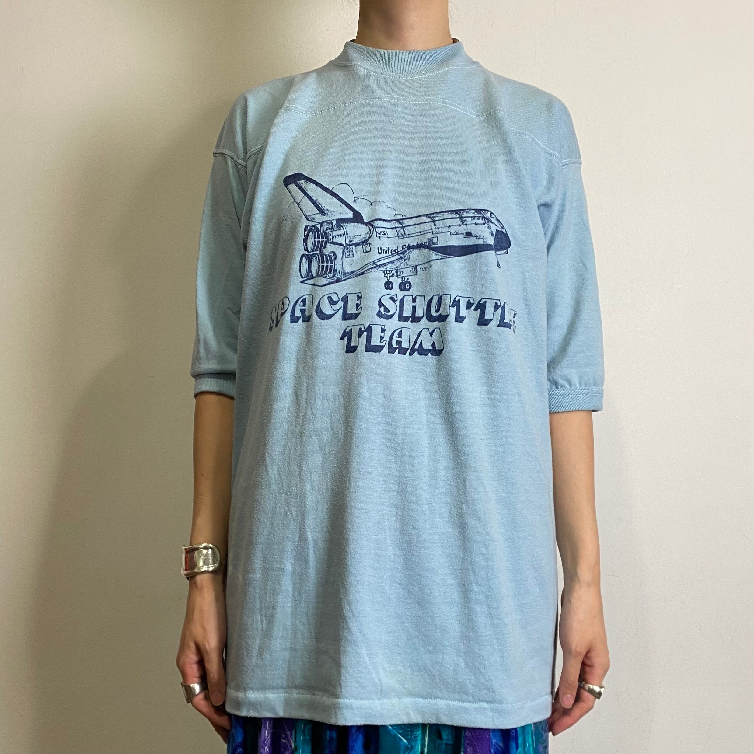水色ボディにブルーのプリントで飛行船が描かれた、七分丈Tシャツです。