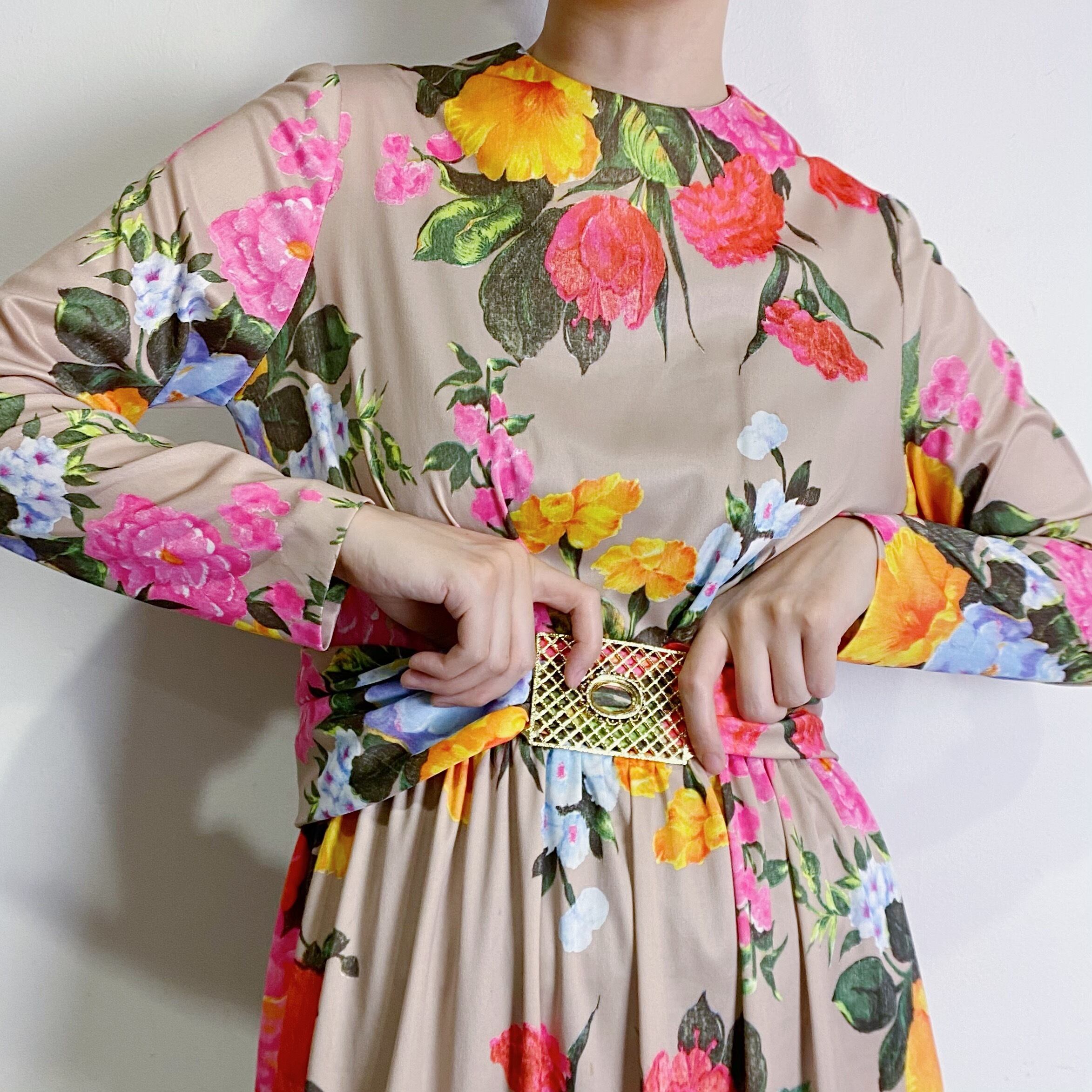 鮮やかな色合いと柄なのに、シルエットと着丈のおかげで大人っぽく着こなせるヴィンテージワンピース。