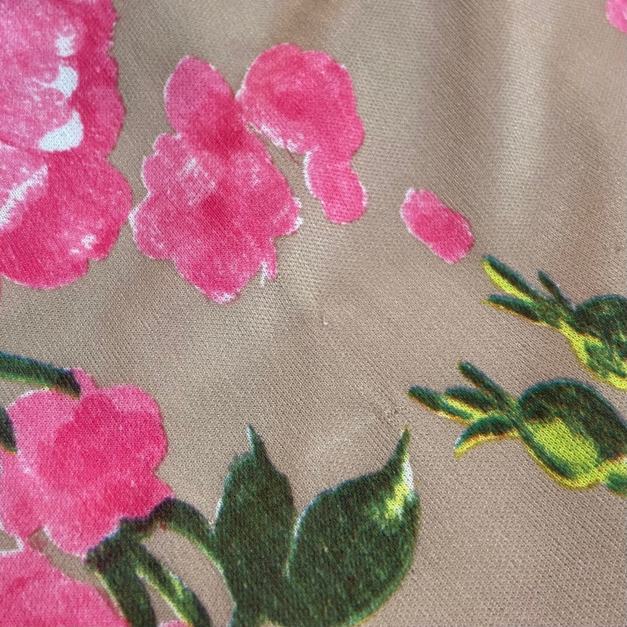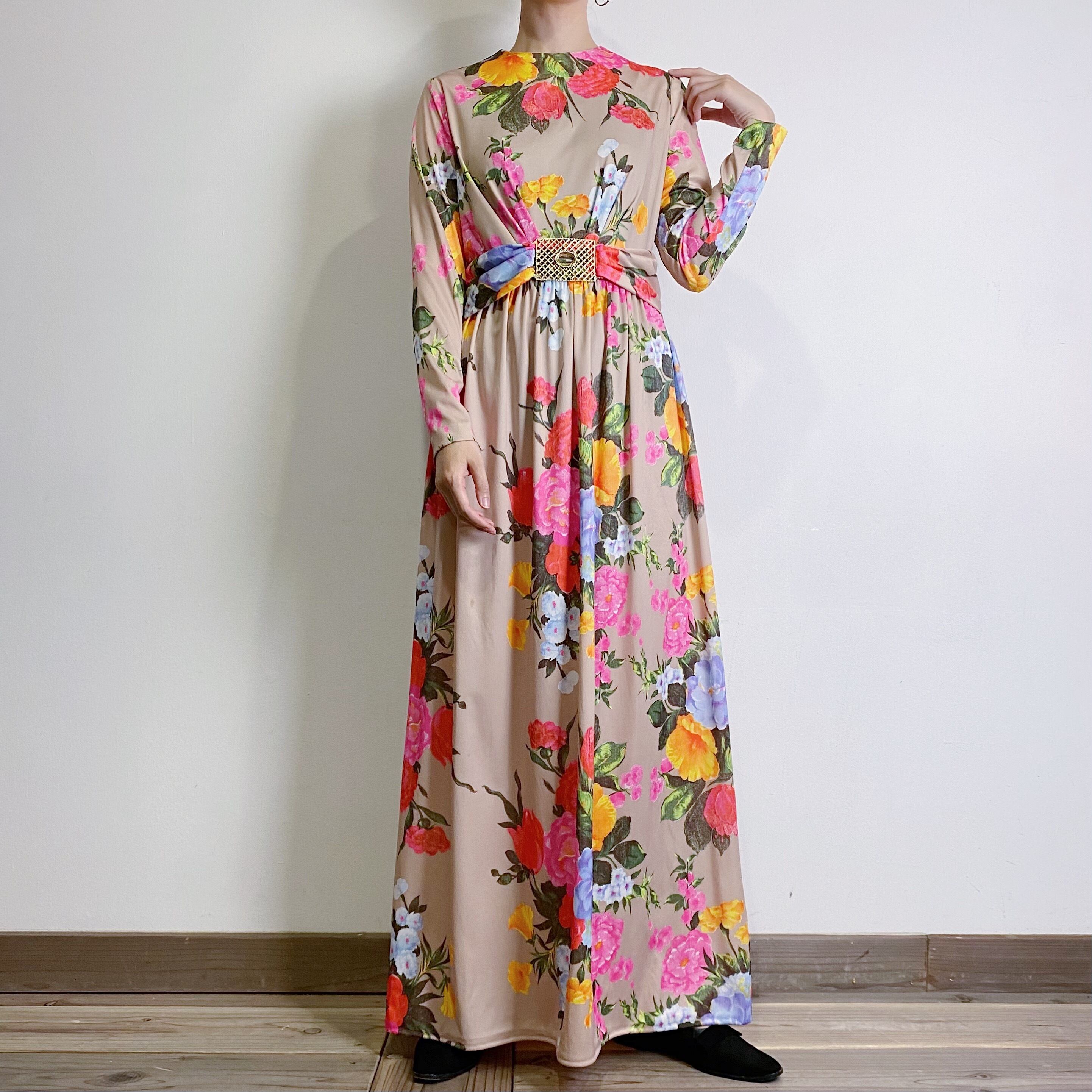ベージュカラーに転写プリントのような花柄が可愛い70年代ワンピースです。