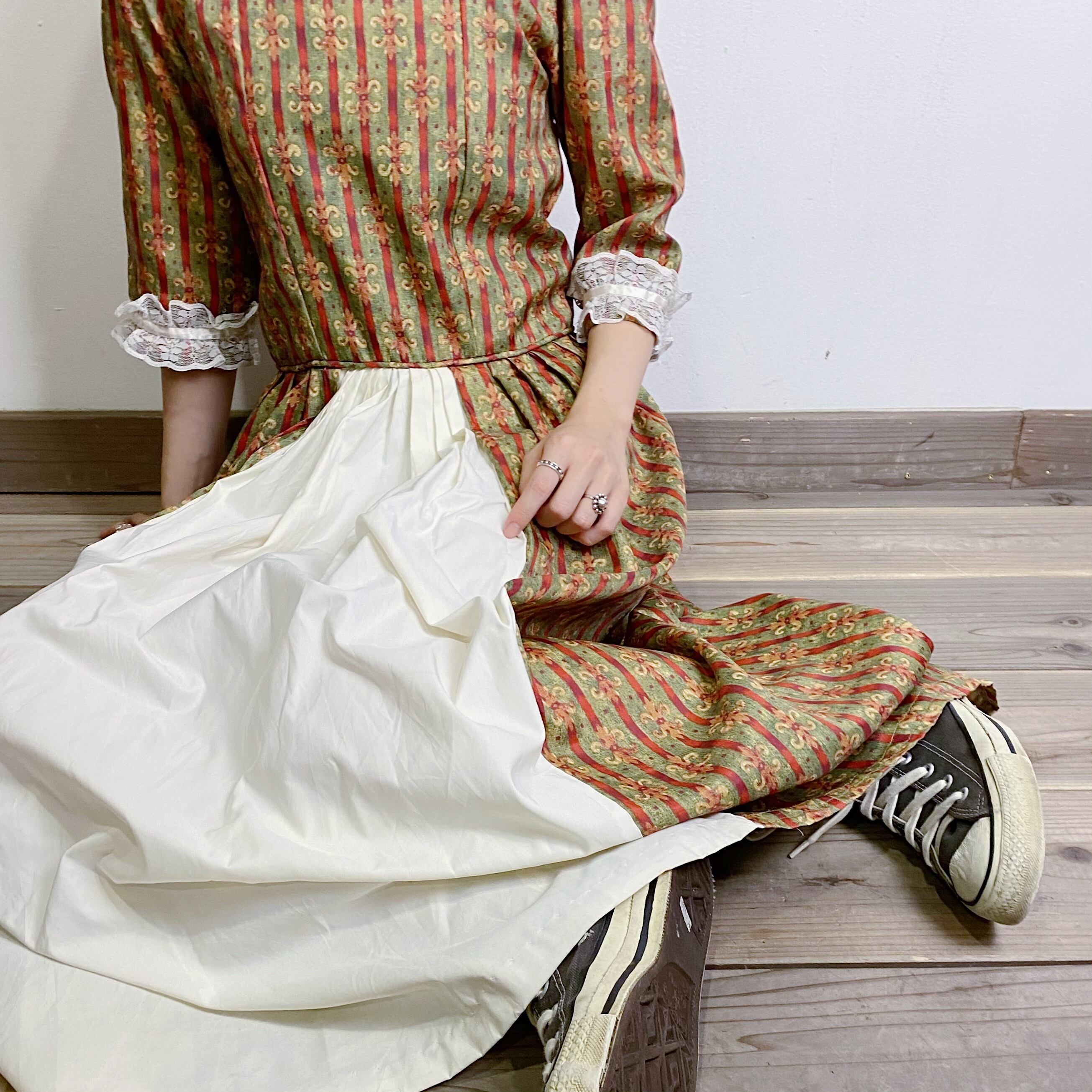 袖のレースと生地の柄、スカート部分の切り替えがポイントのアイテム。