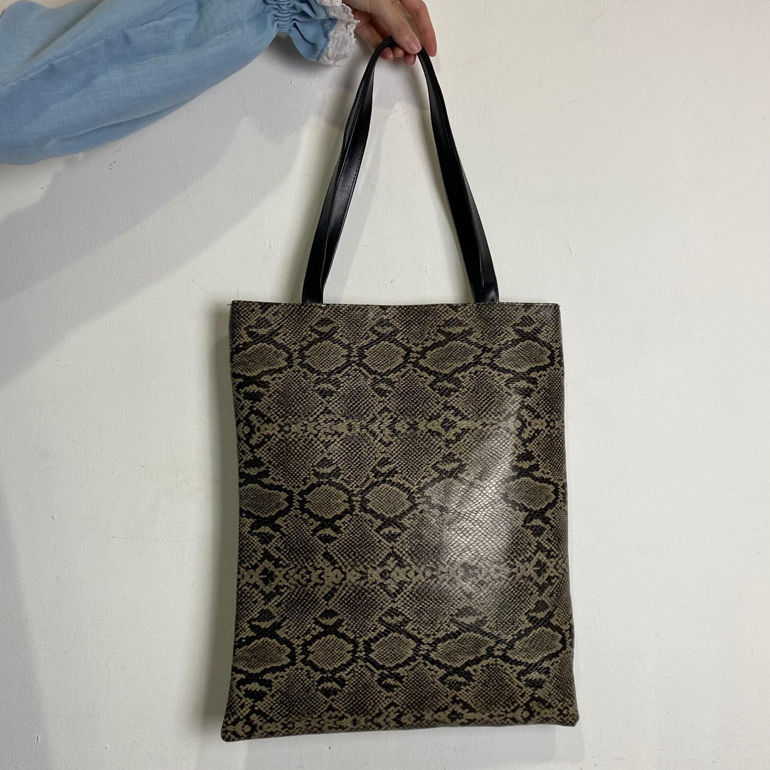 パイソンプリントの、サイズ感が程よいトートバッグです。