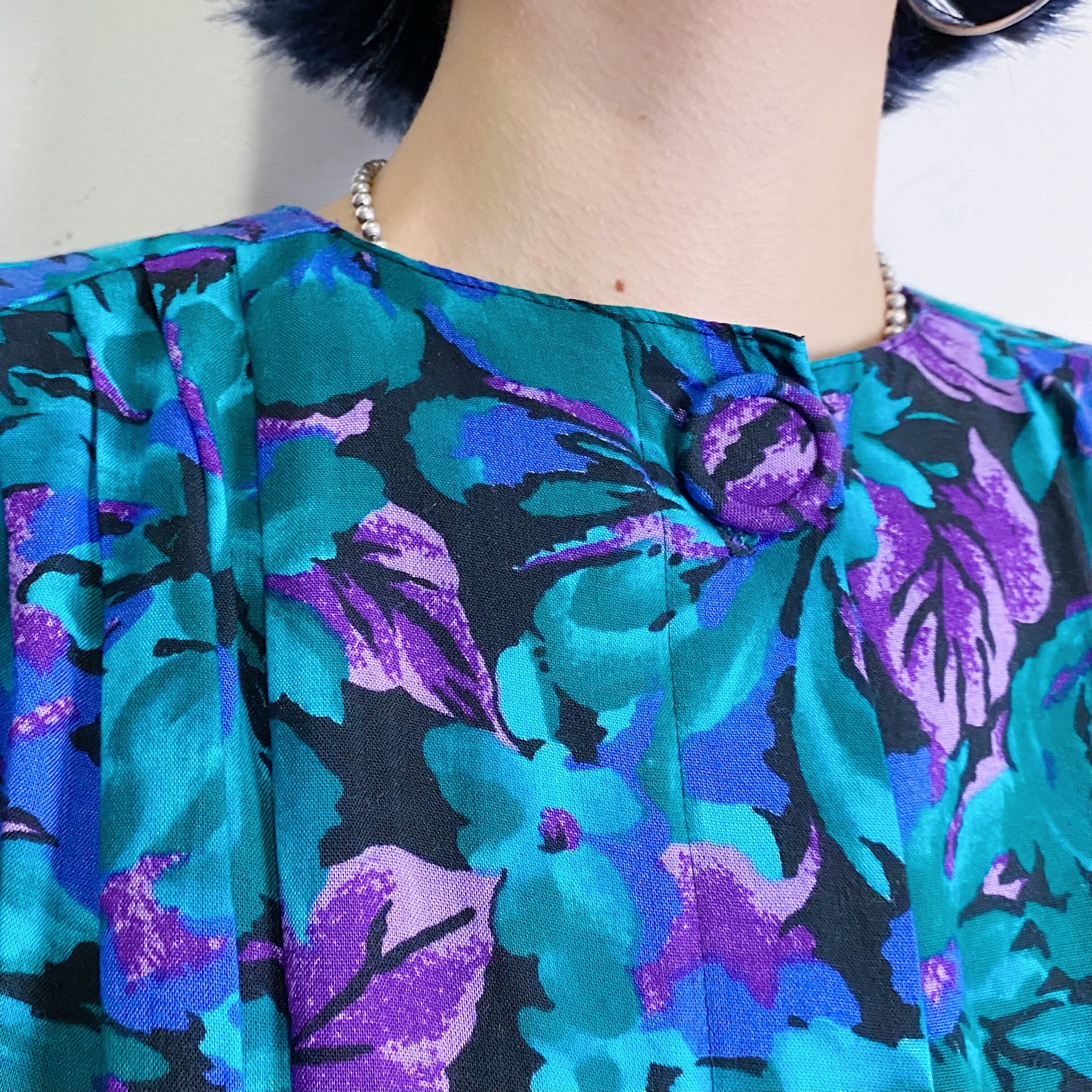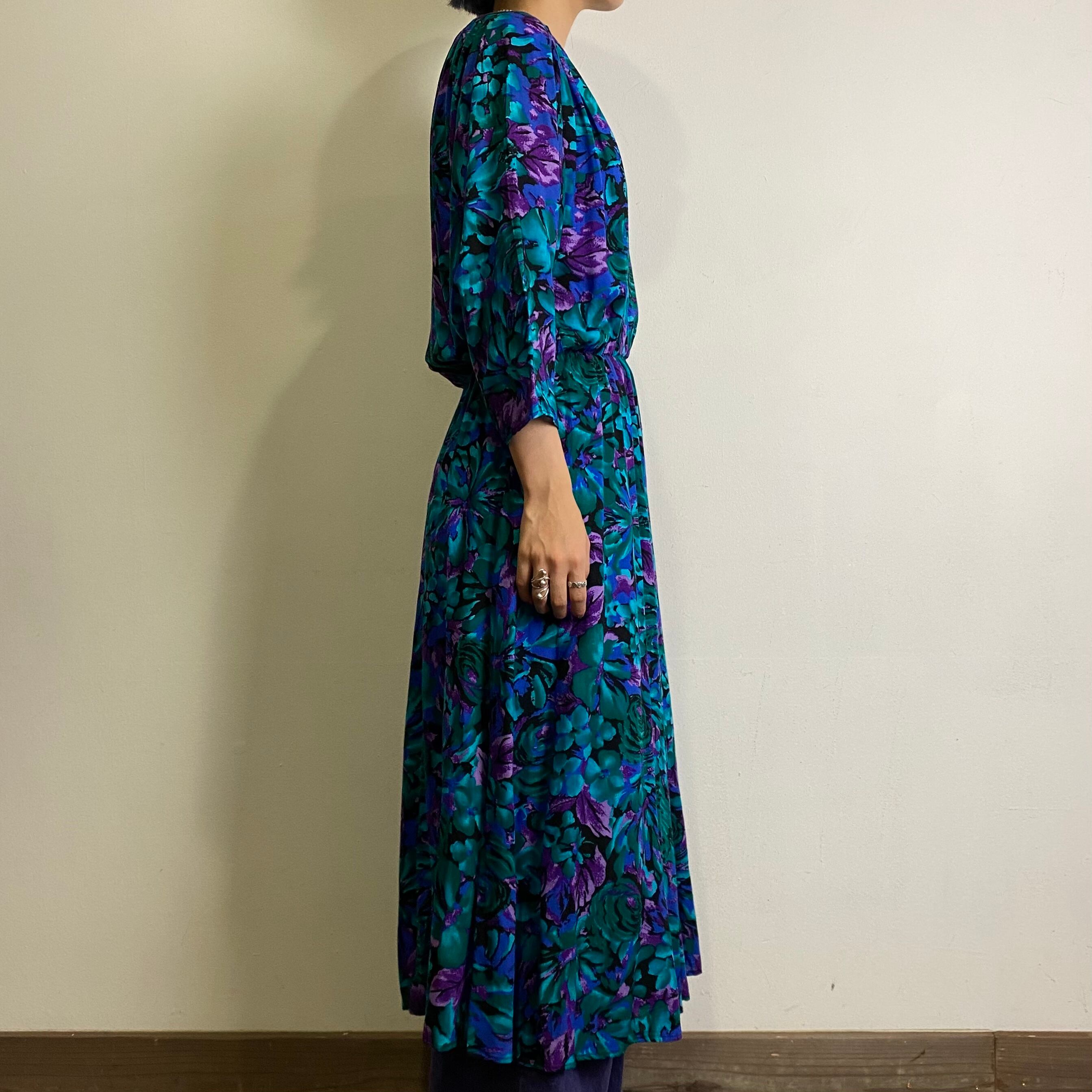 パープルとグリーンのお花の色合いが可愛い、80年代のワンピースです。