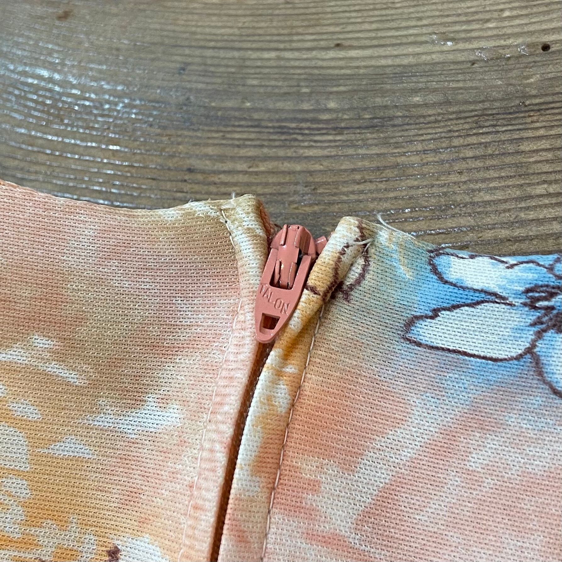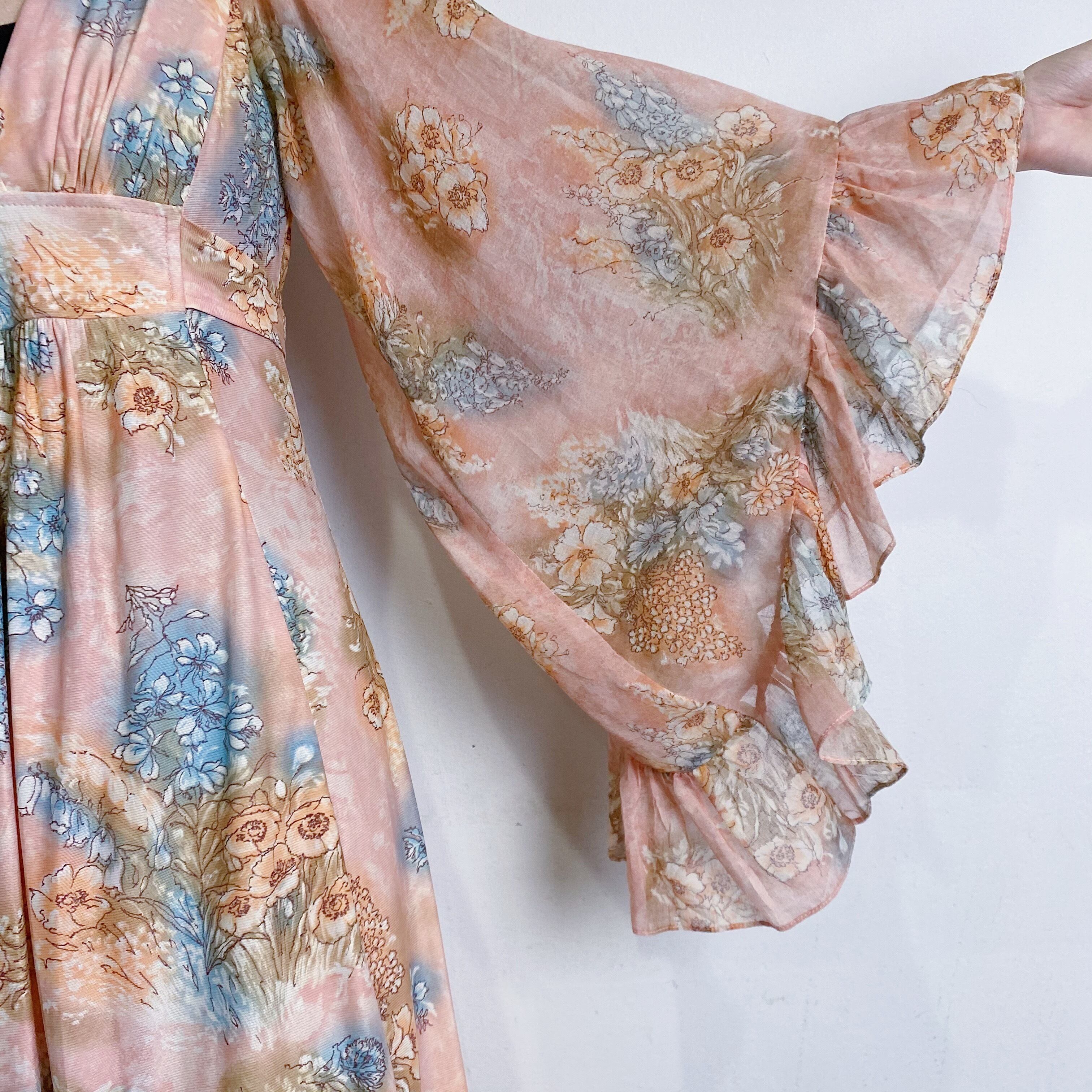 サーモンピンクにブルーの色合いがとっておきに可愛い、70年代ワンピースです。