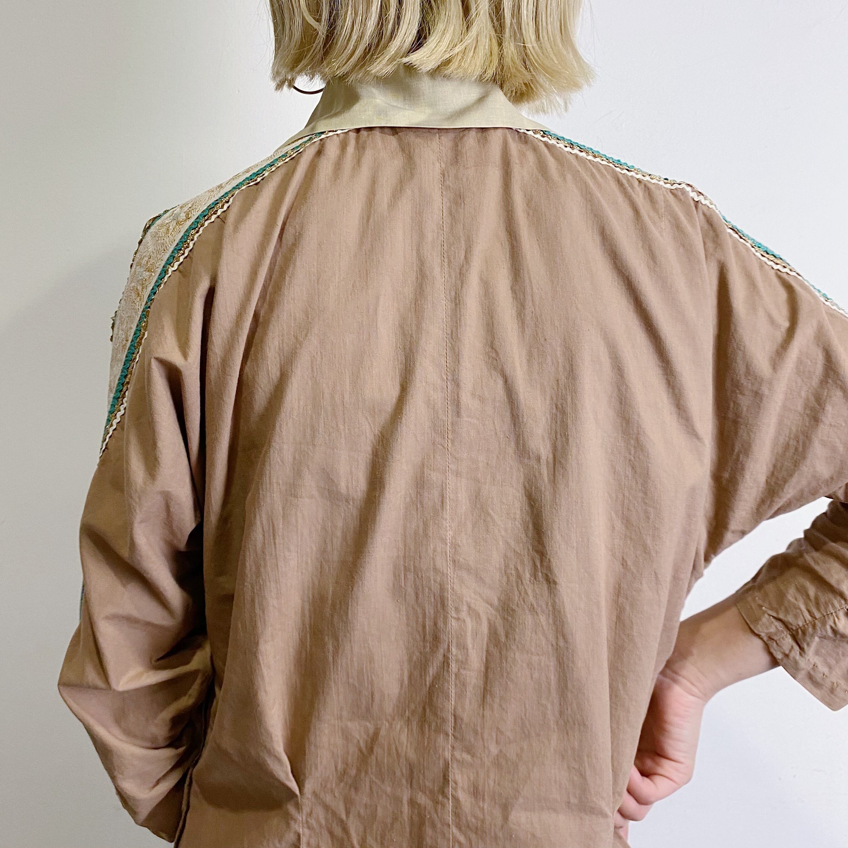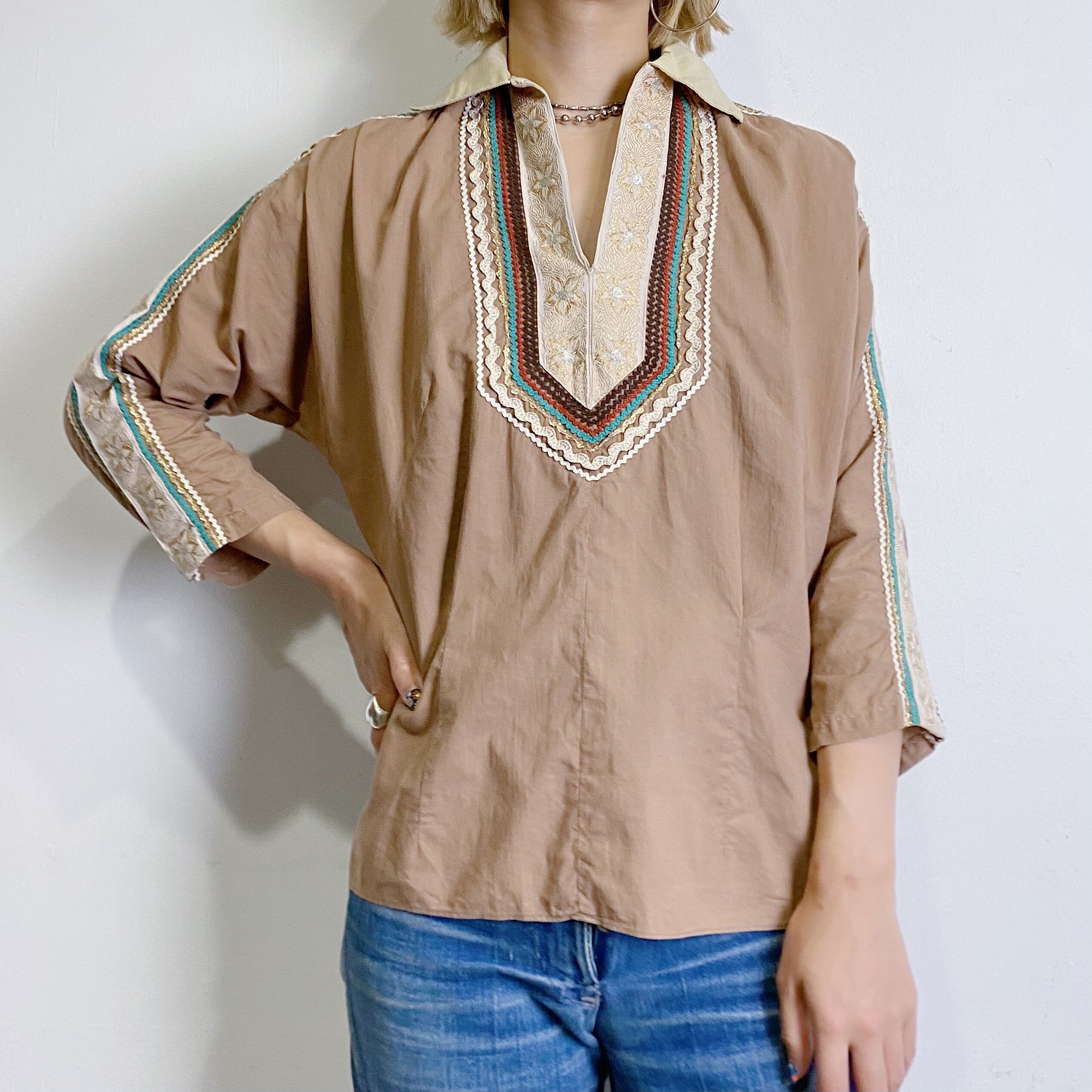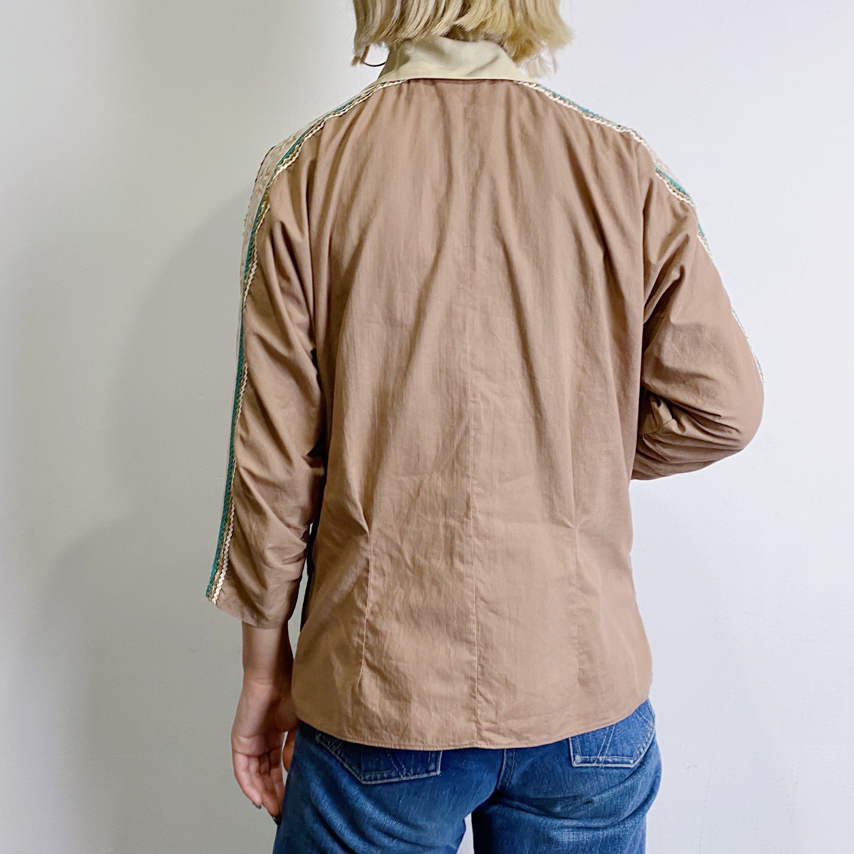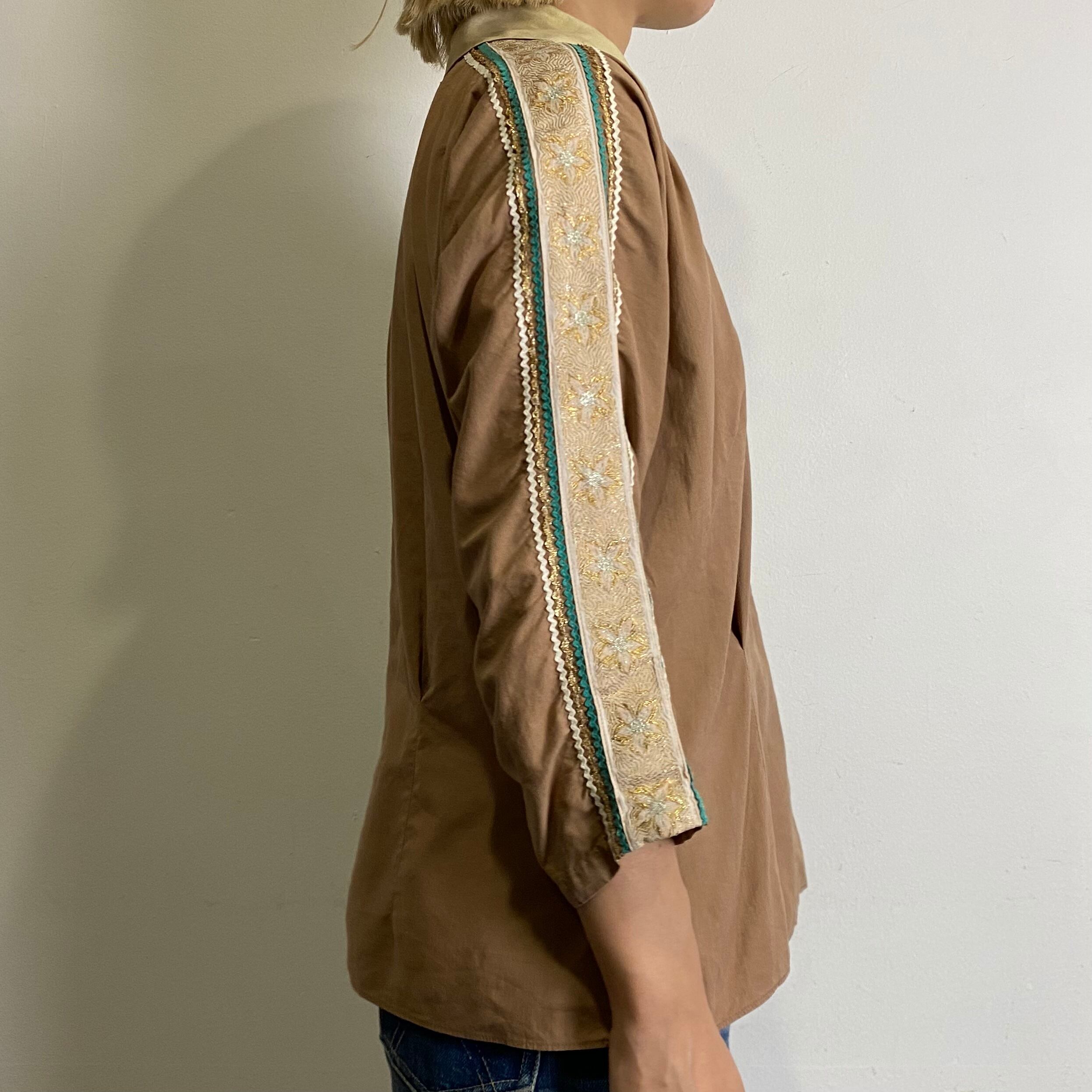 ブラウンカラーにカラフルな山道テープやゴールドテープの色合わせが可愛い、50年代らしいトップスです。