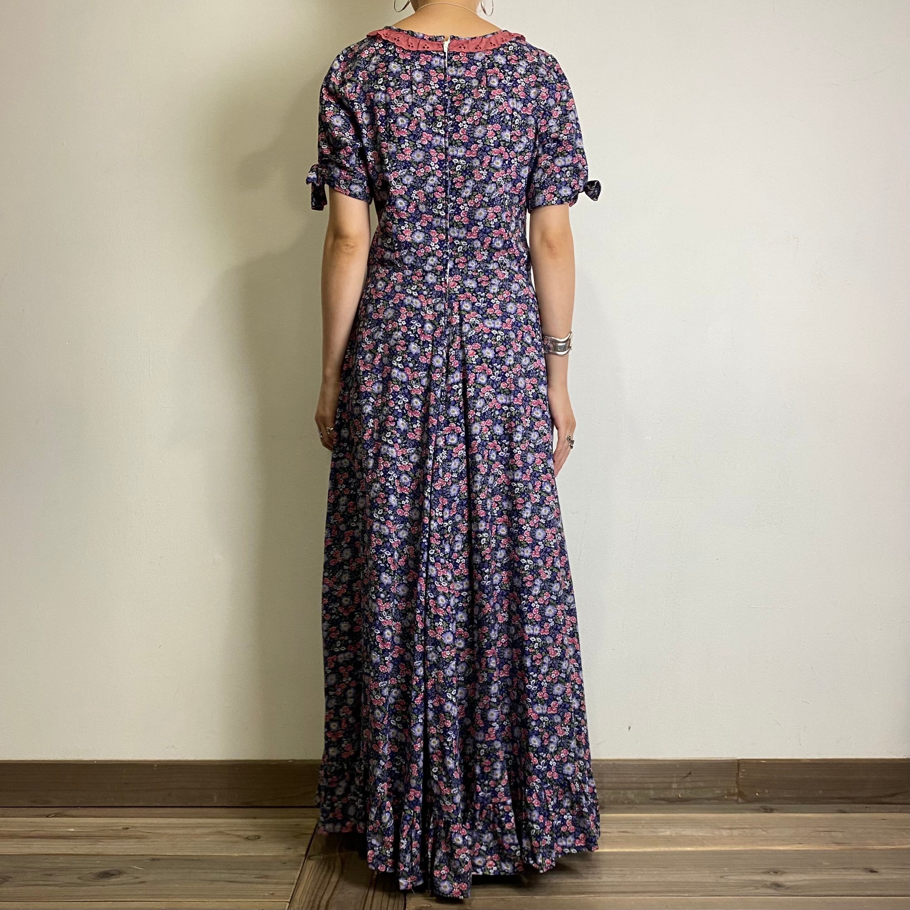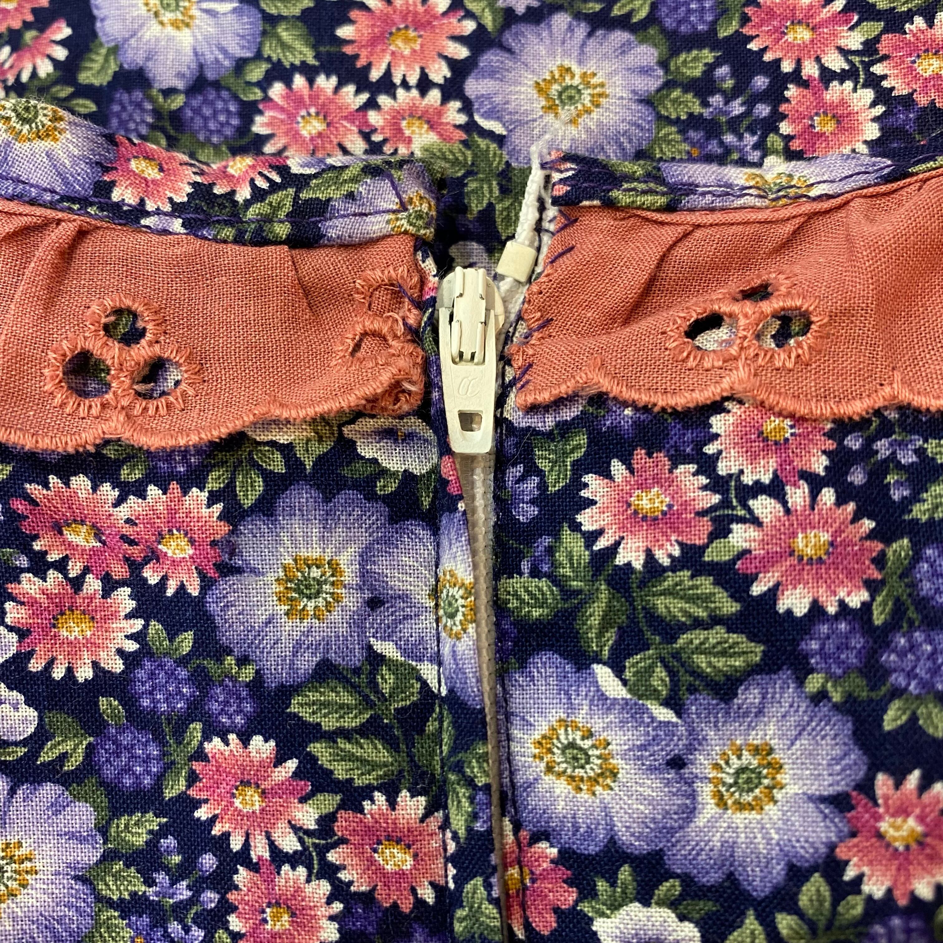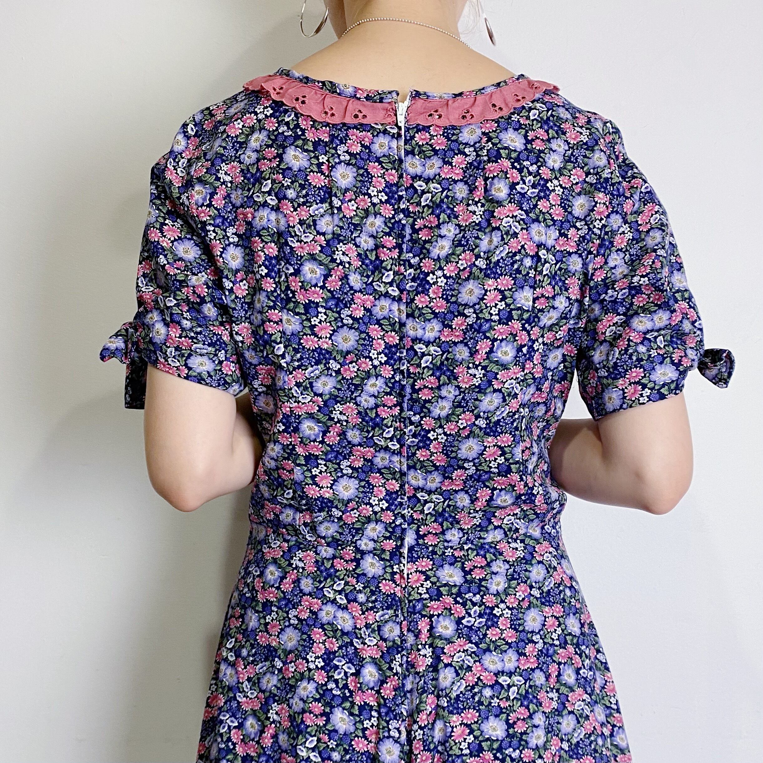 ネイビーベースにピンクやパープルなどの花柄が可愛い70~80年代のワンピースです。