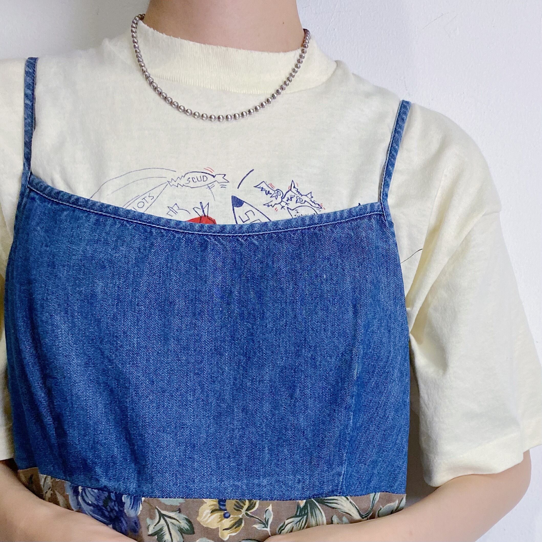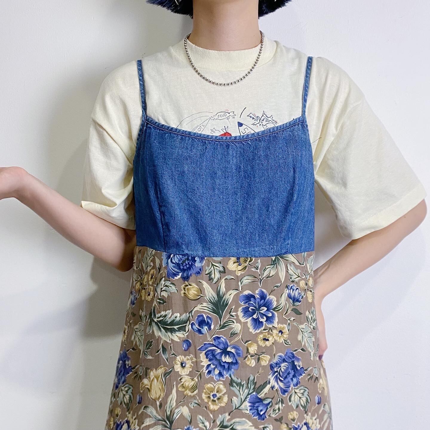 デニムと花柄のセパレートデザインが可愛いキャミワンピースです。