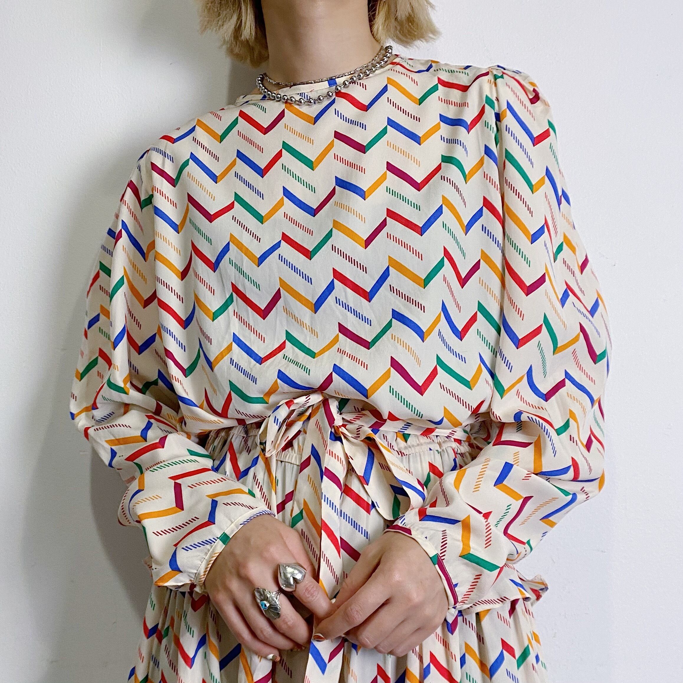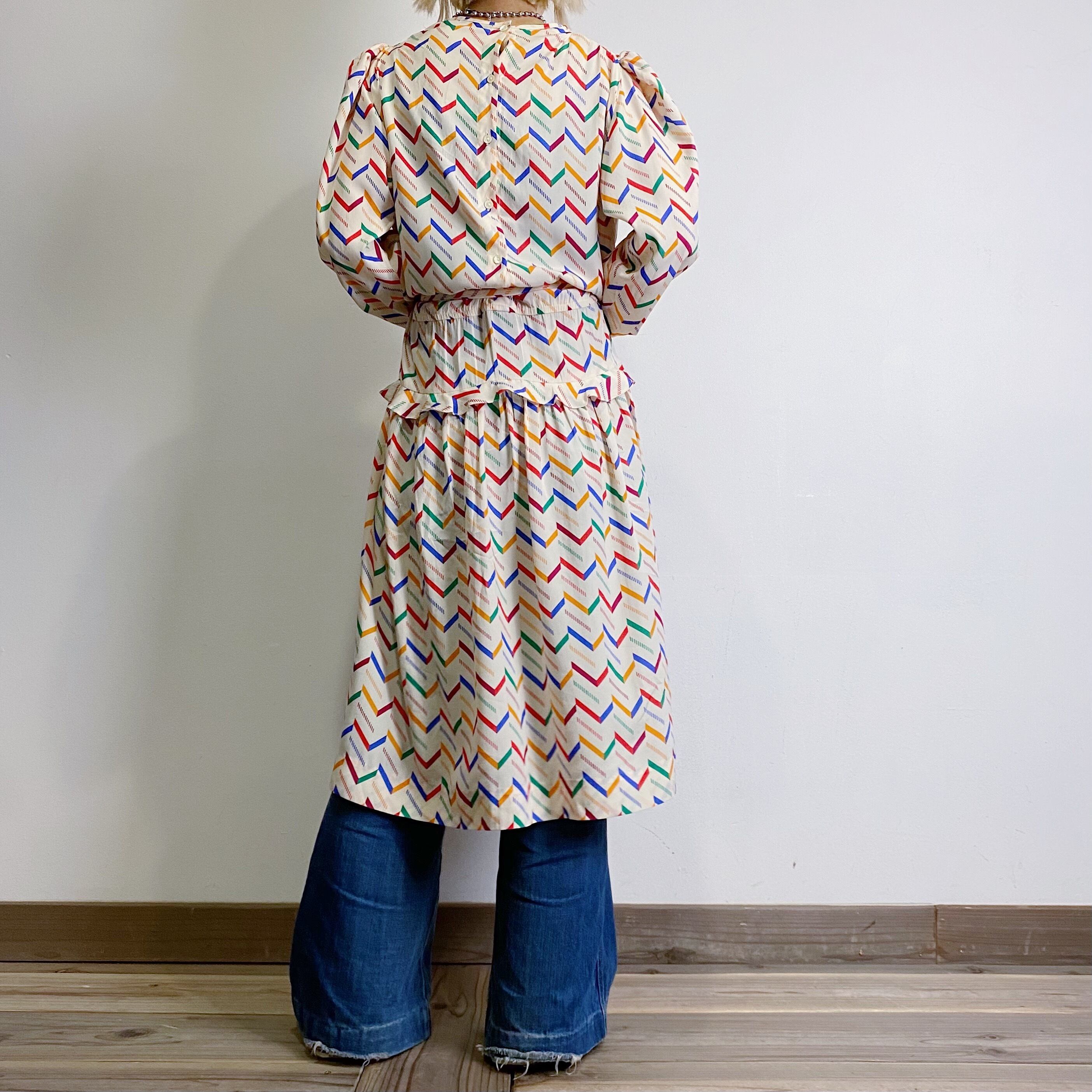 シルク素材にジクザクしたレインボーカラーのデザイン可愛い、80年代のワンピースです。