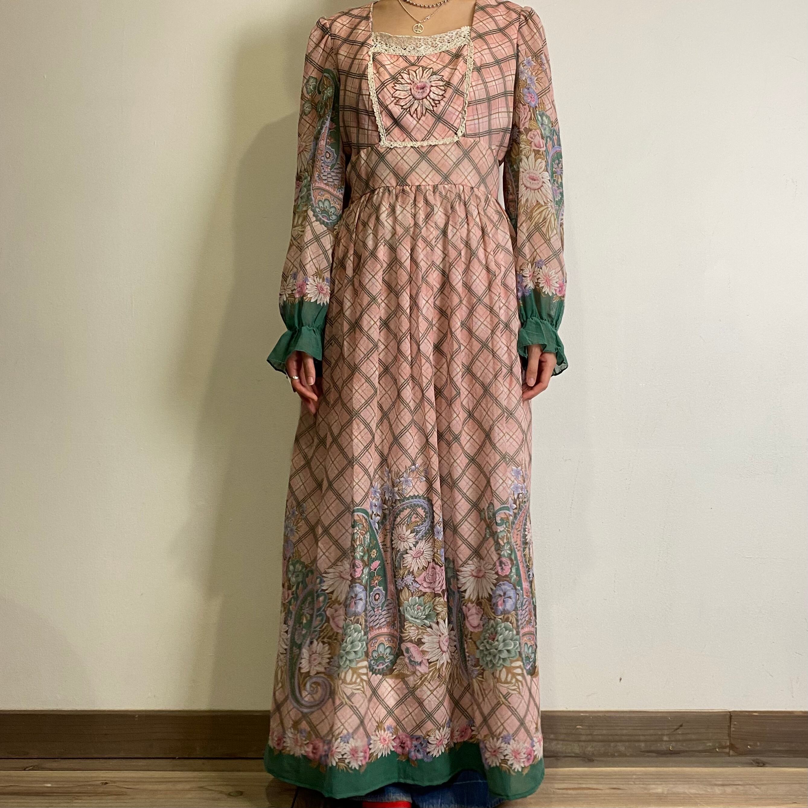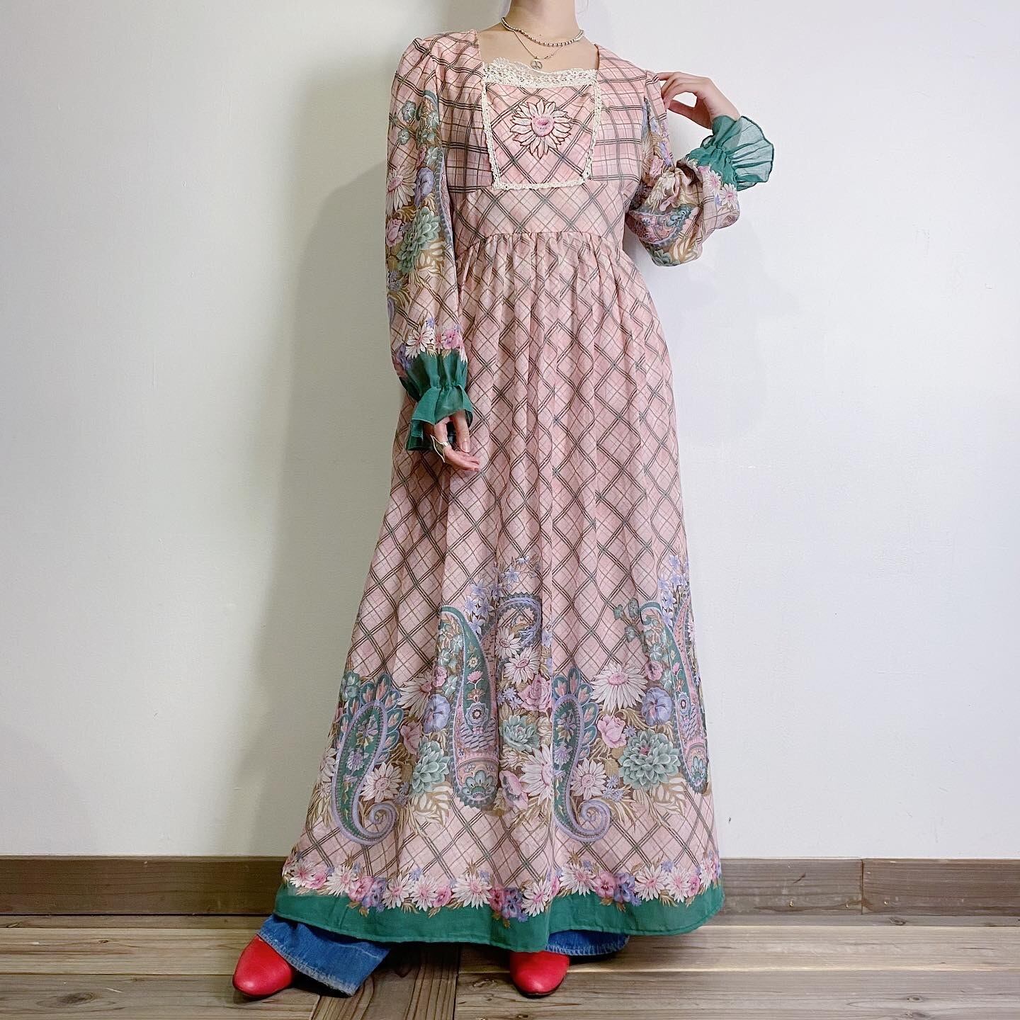 ピンクとグリーンの色合いに、チェック柄にお花とペイズリーがとびきりに可愛い、70年代のワンピースです。