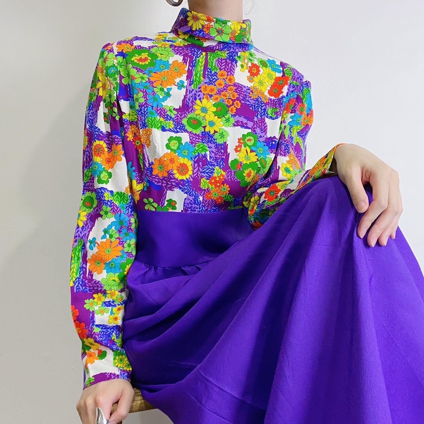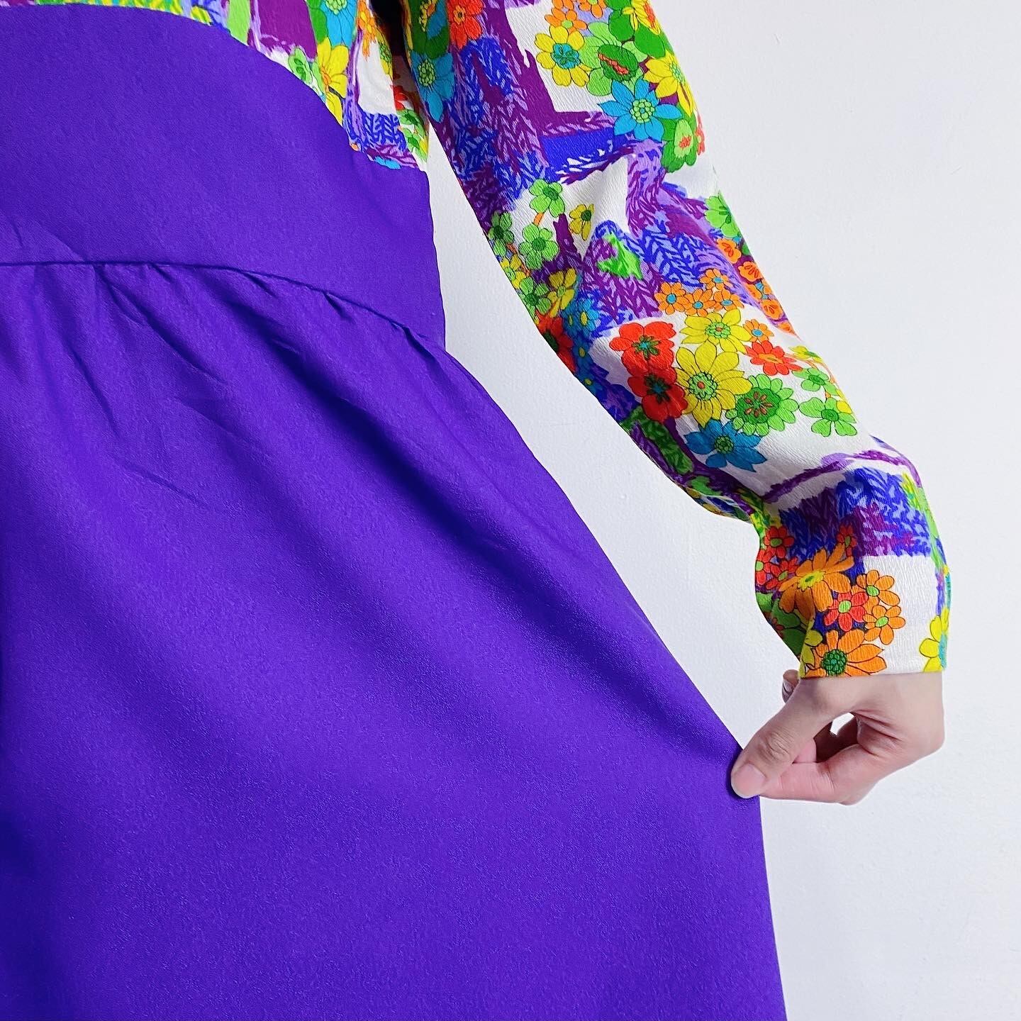 カラフルなお花に紫の配色が可愛い、60年代から70年代のワンピースです。