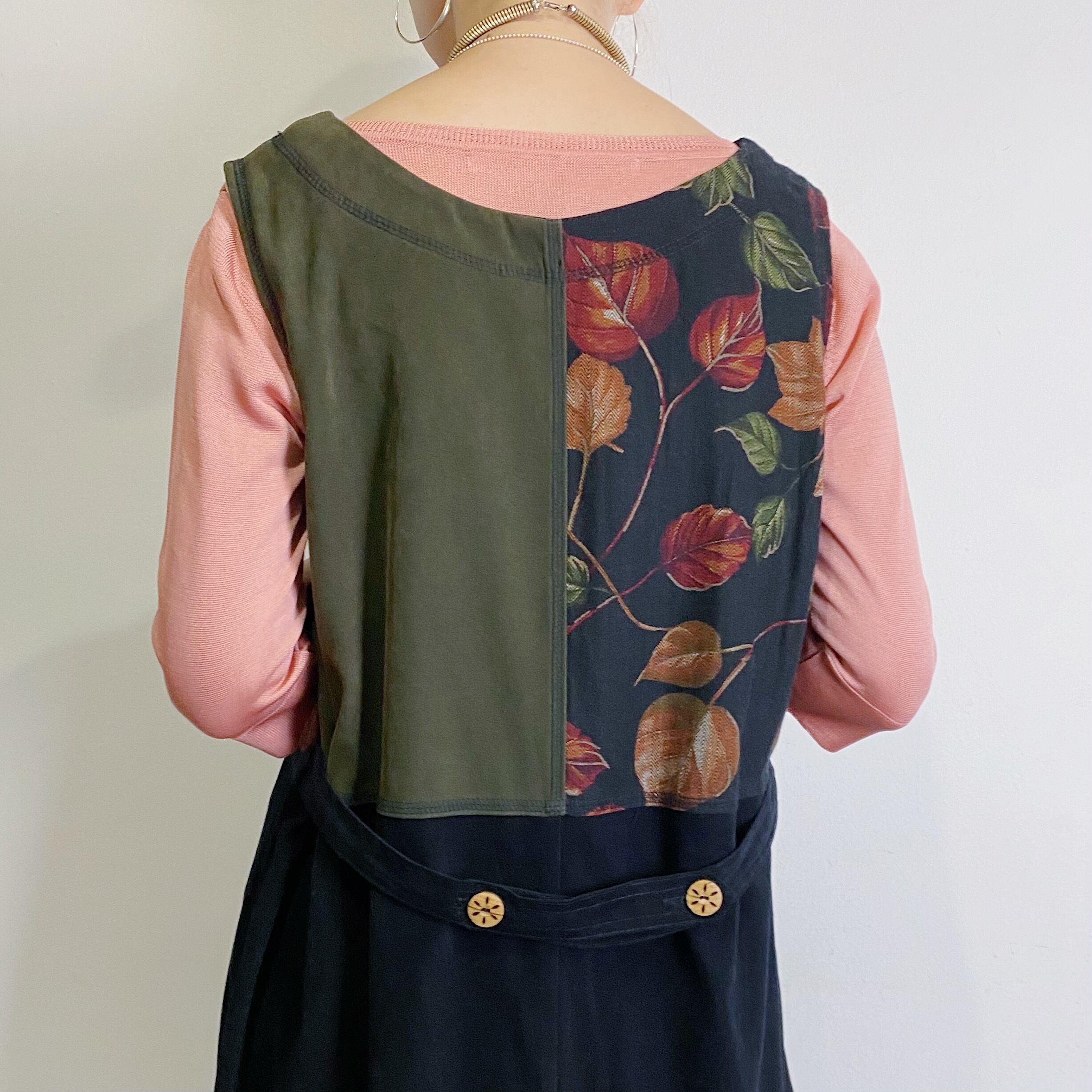 上半身のパッチワークが可愛いジャンパーワンピースです。