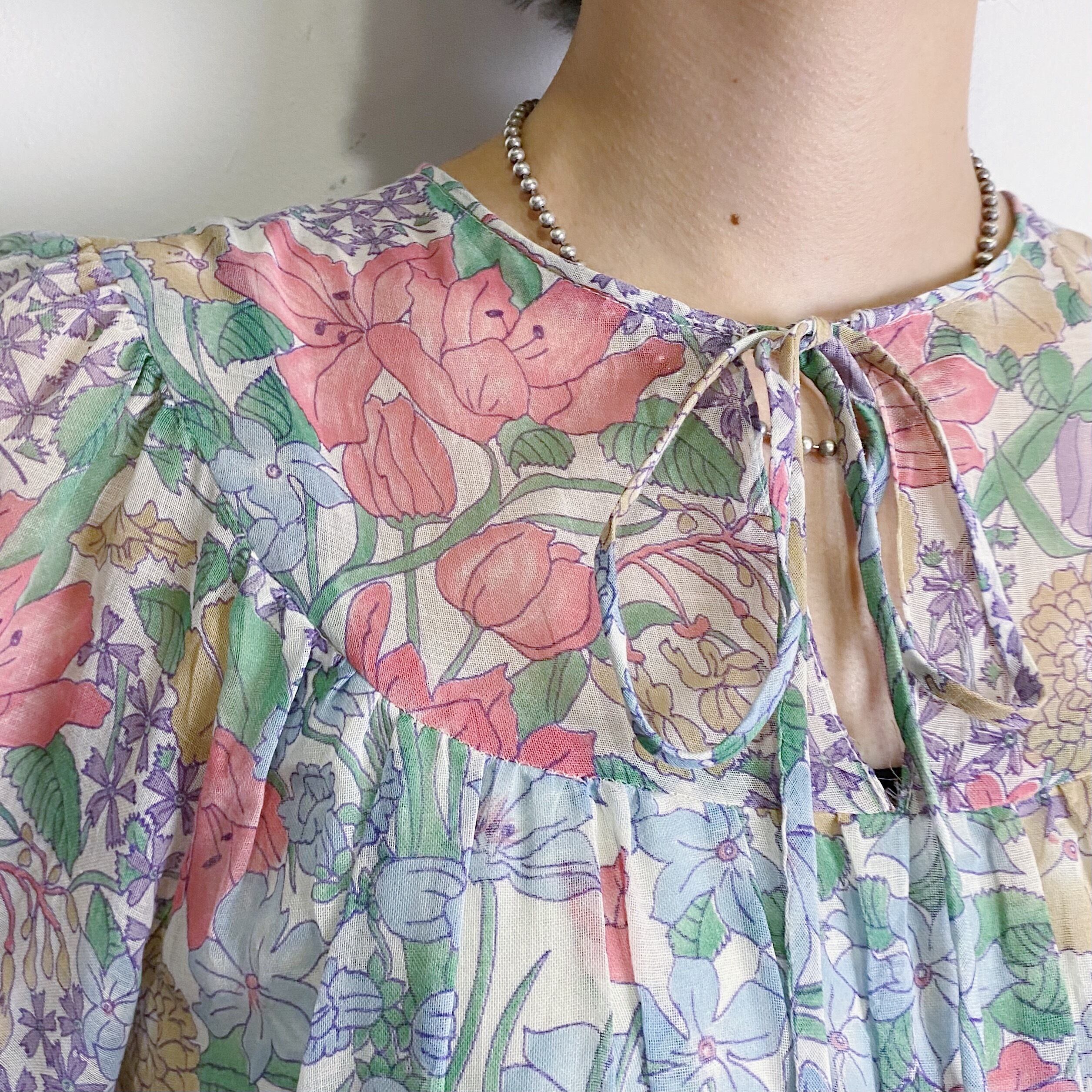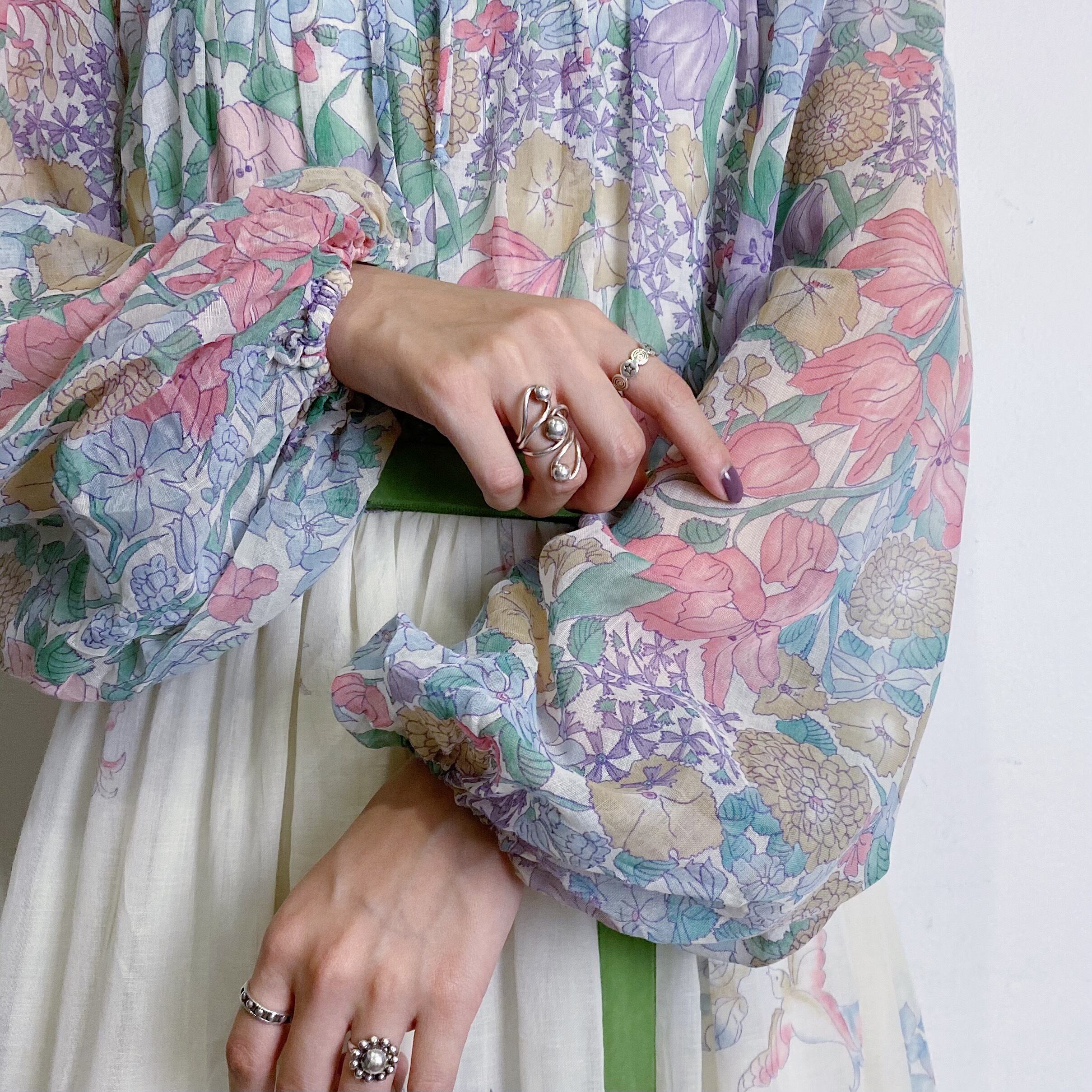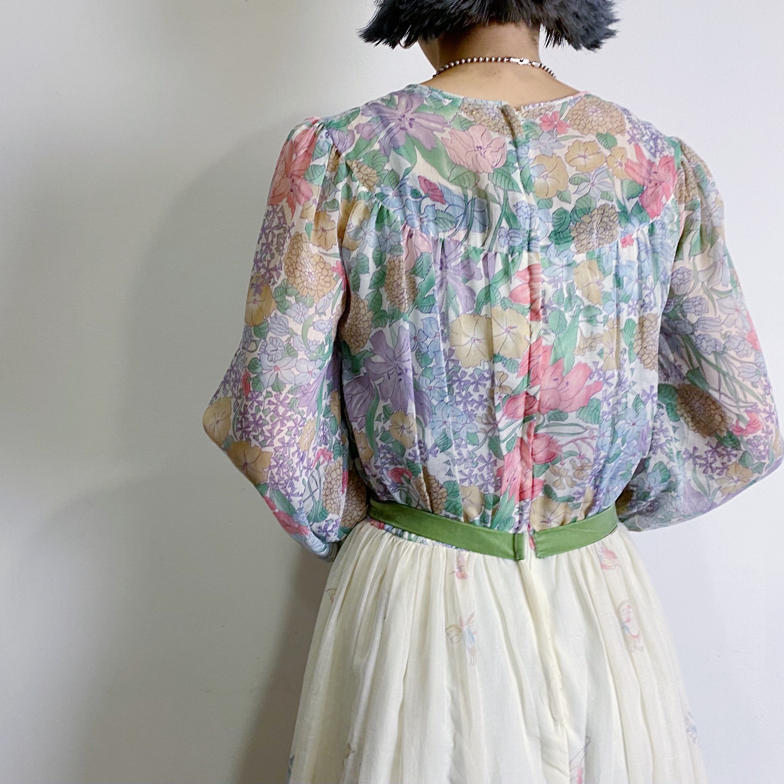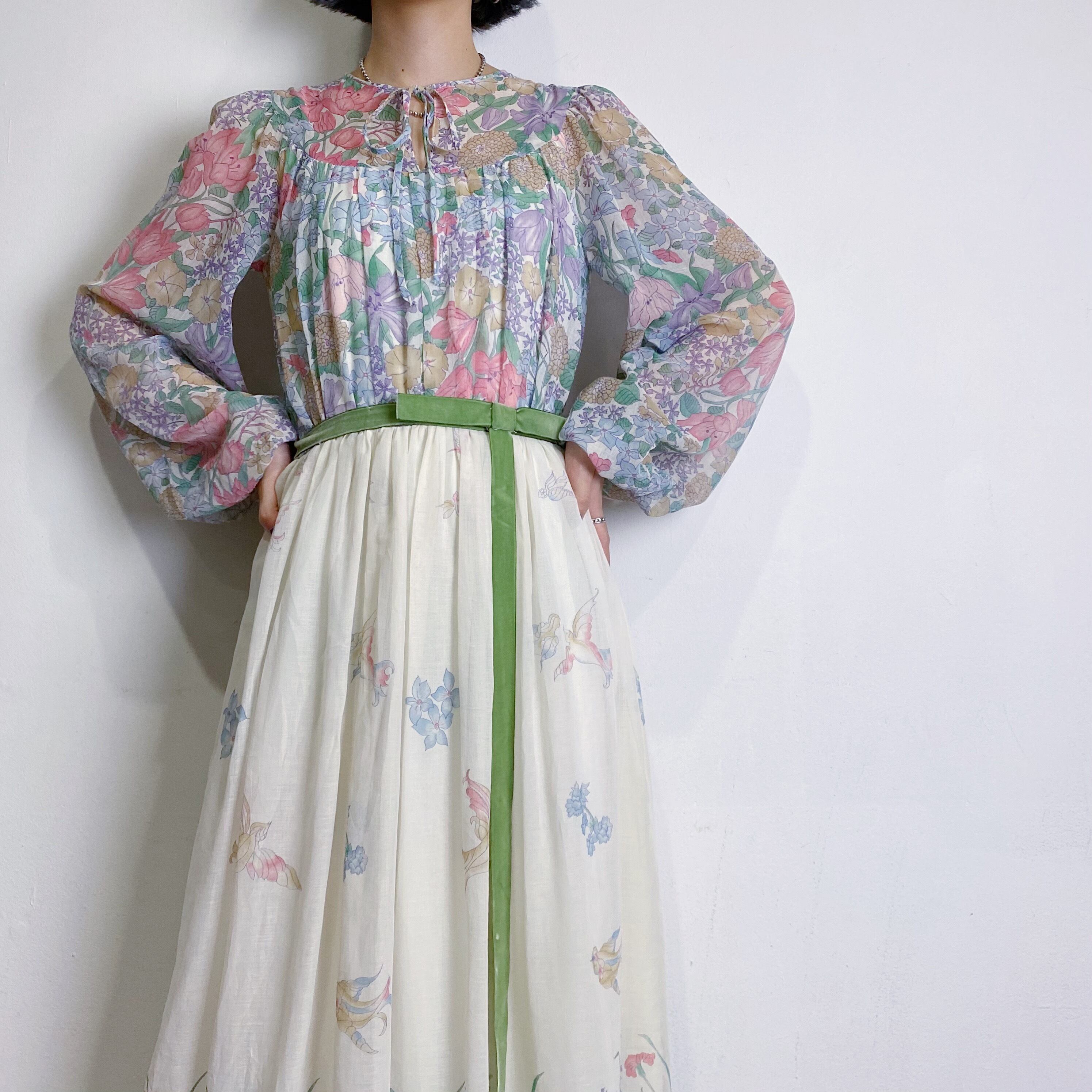 白ベースに裾から生えてきたような草花や小鳥柄がとびきり可愛い70年代のロングワンピースです。