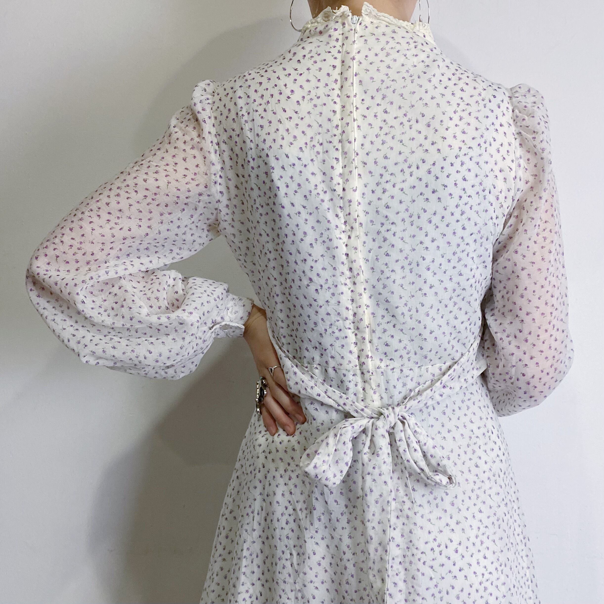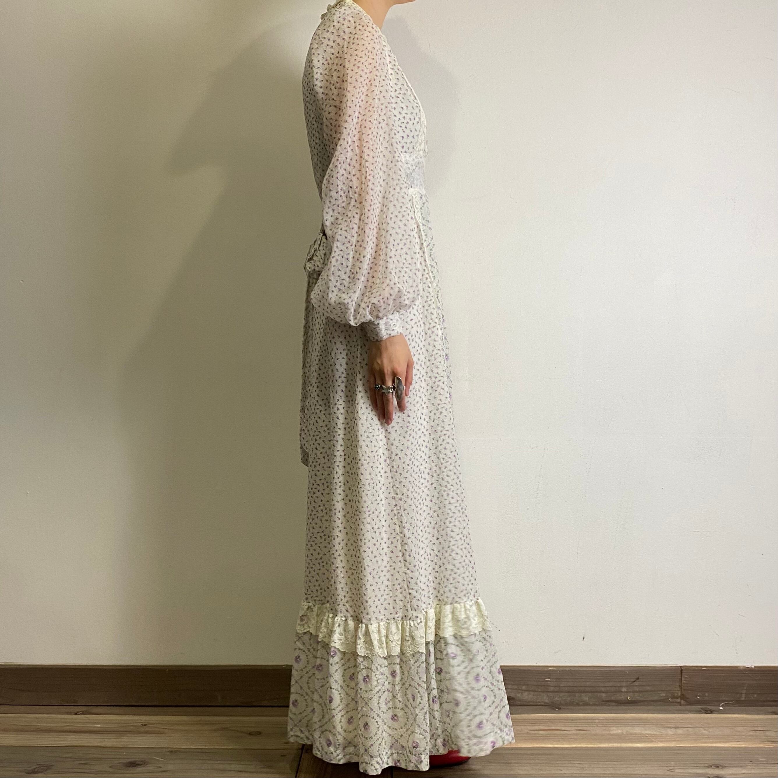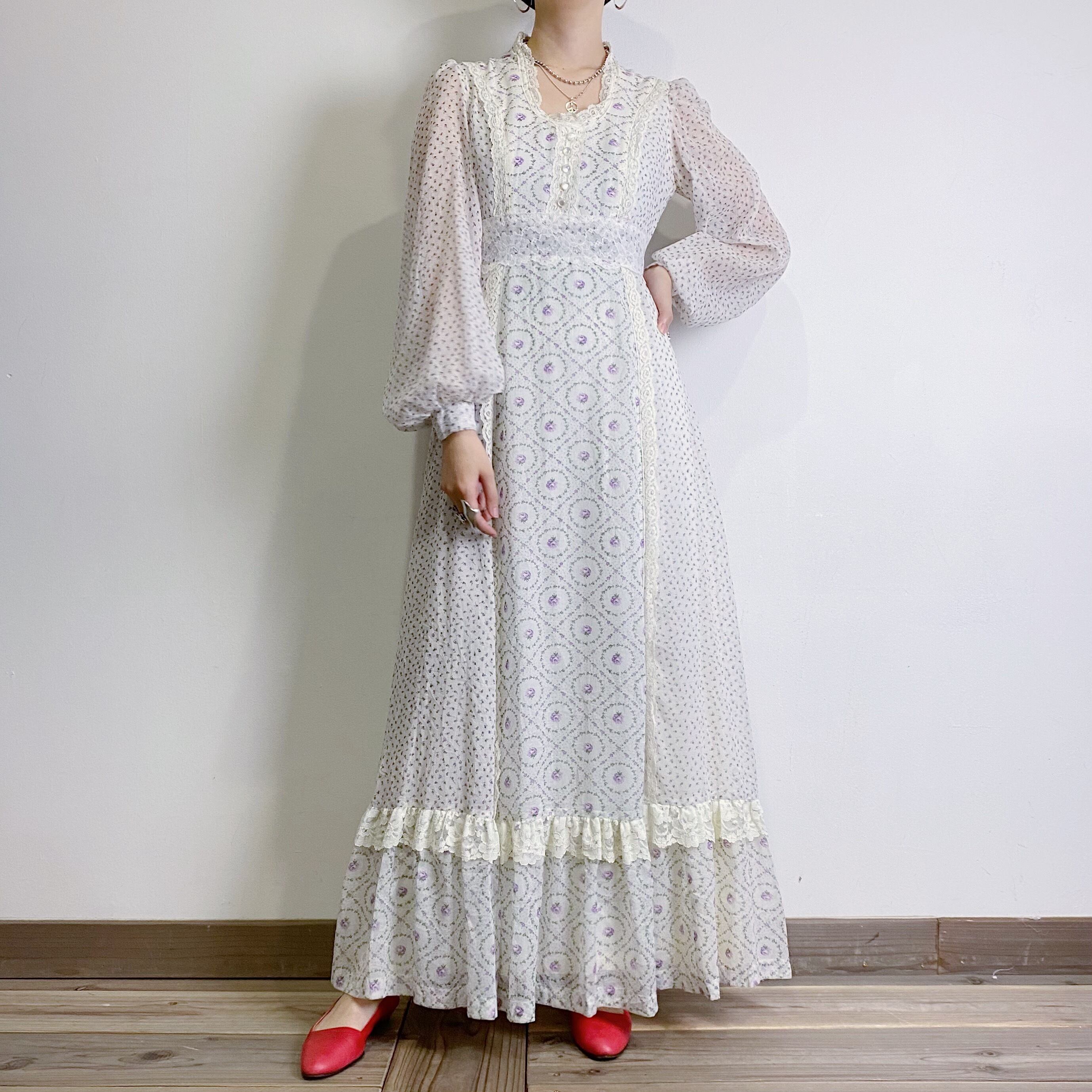 白ベースにパープルの小花柄が可愛い70年代のロングワンピースです。