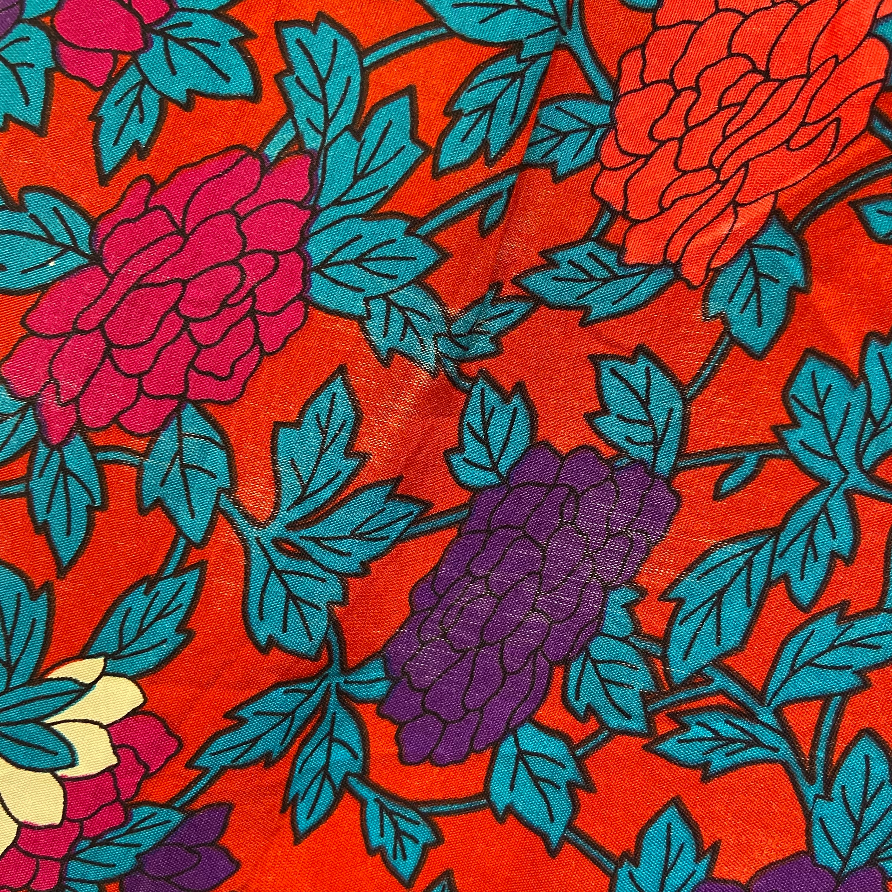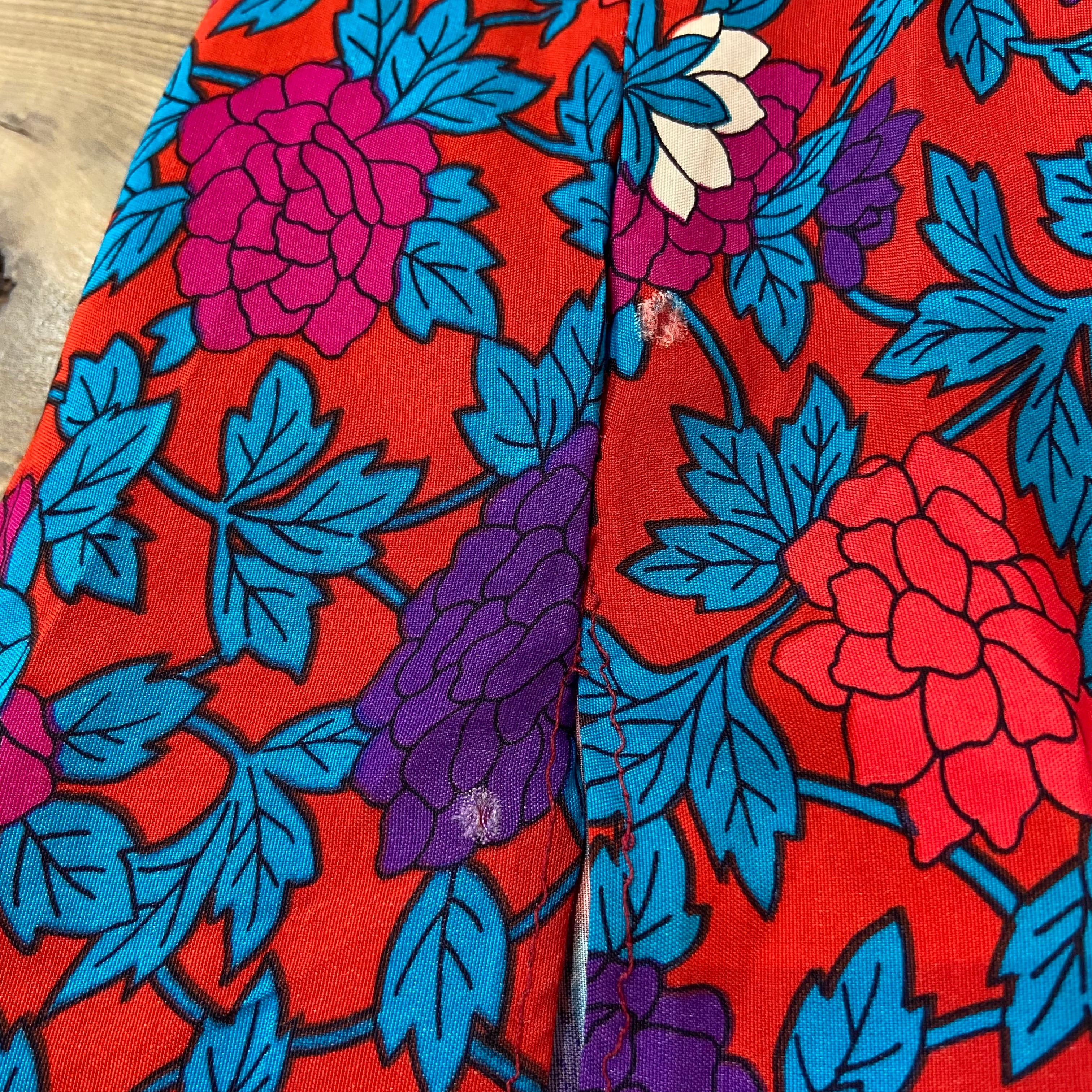 深めの赤にピンクや紫のお花のプリントが可愛い、80年代のロングスカートです。