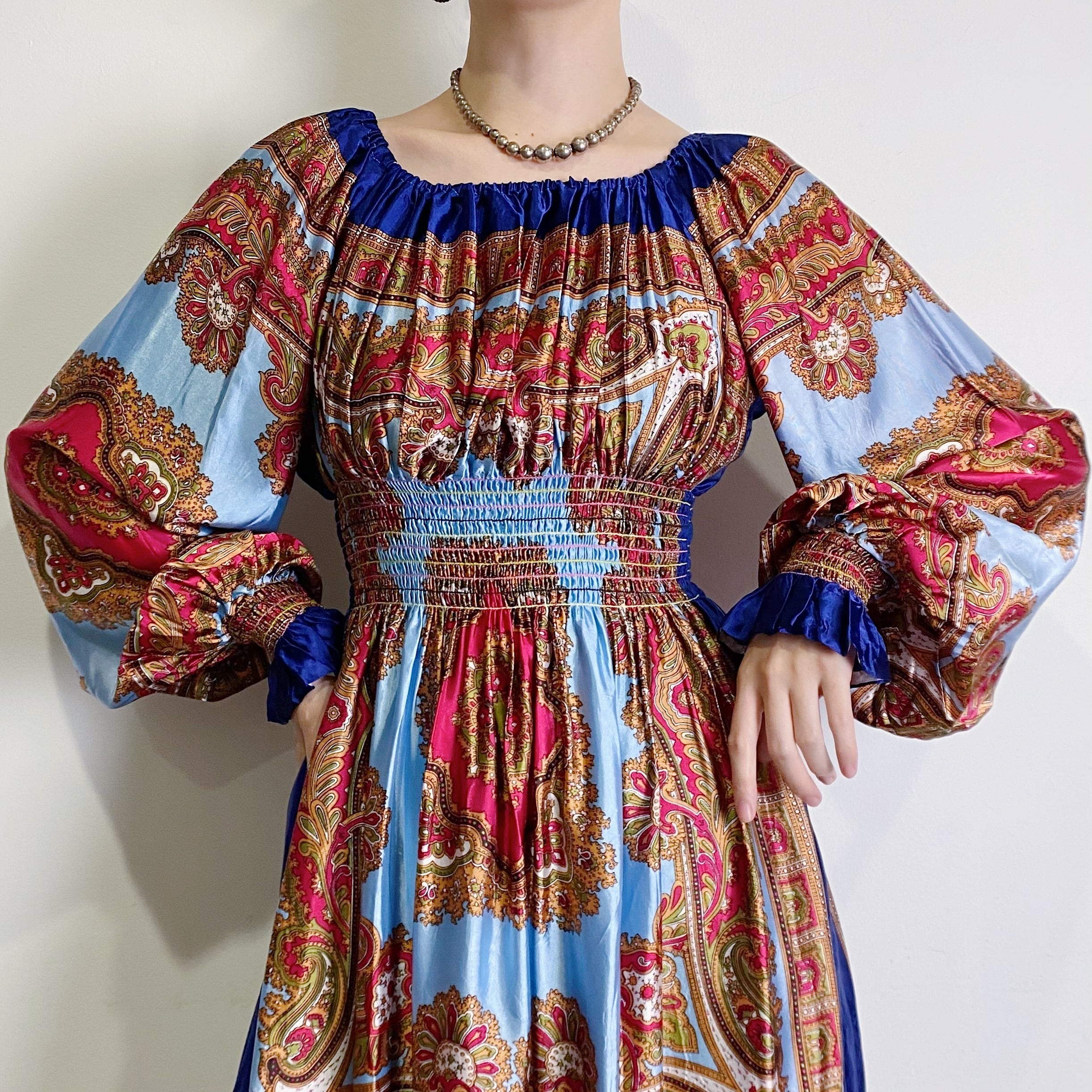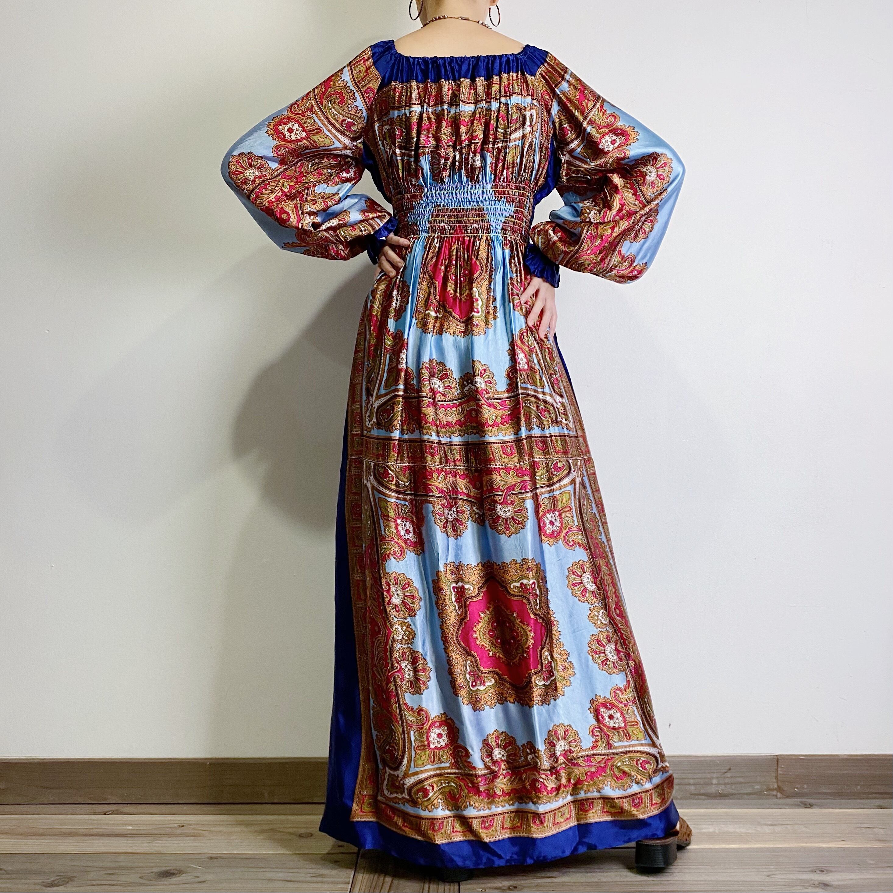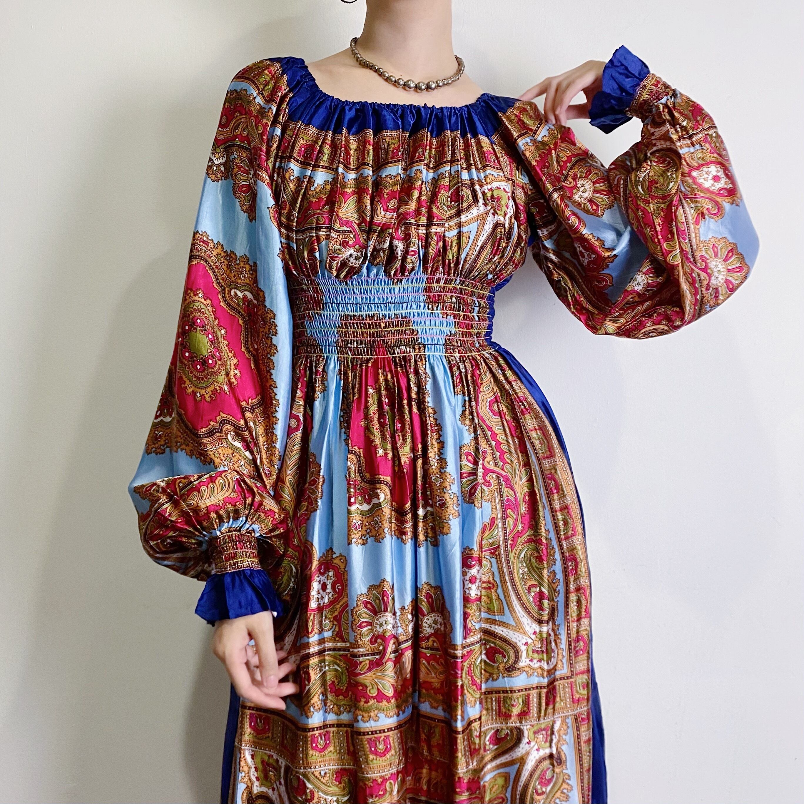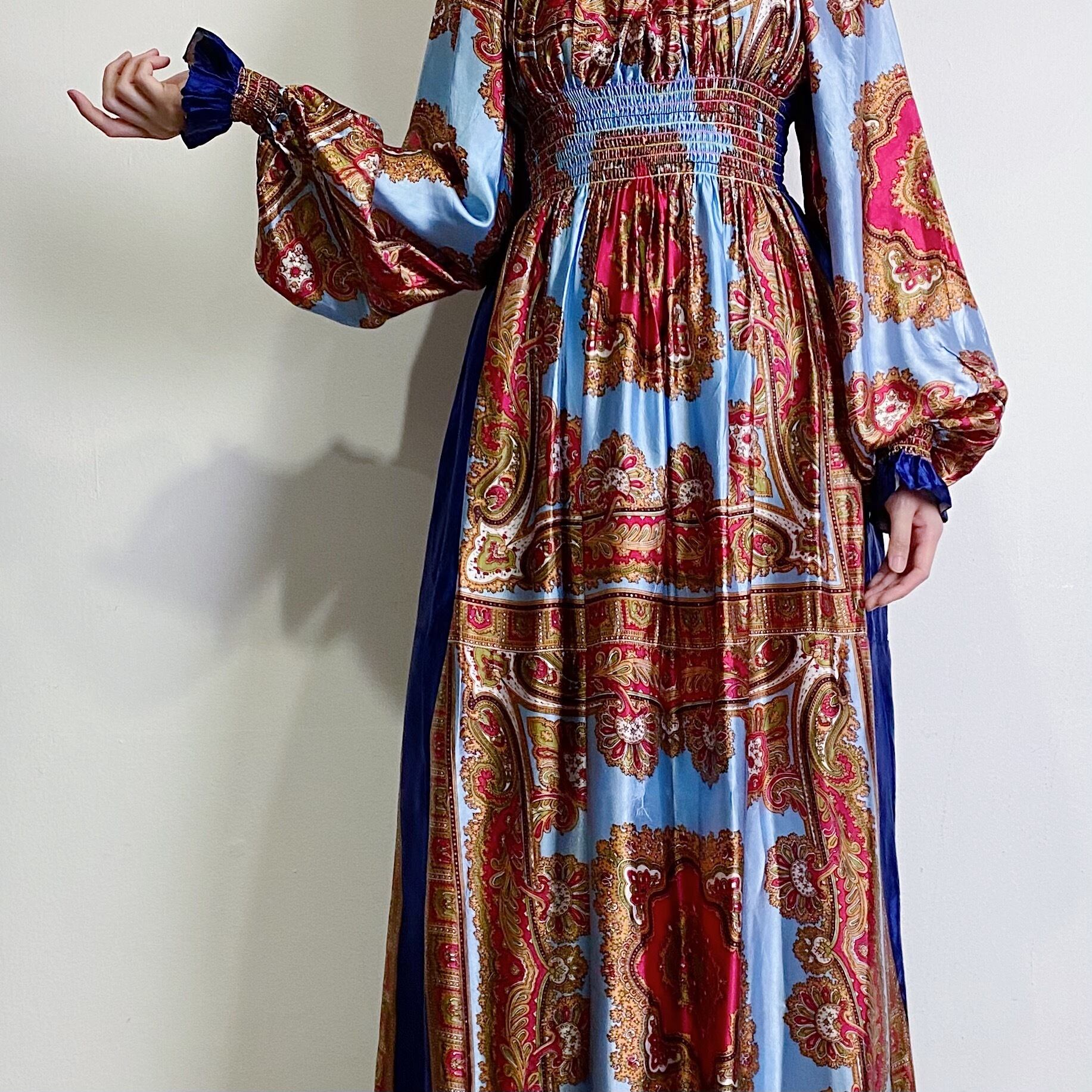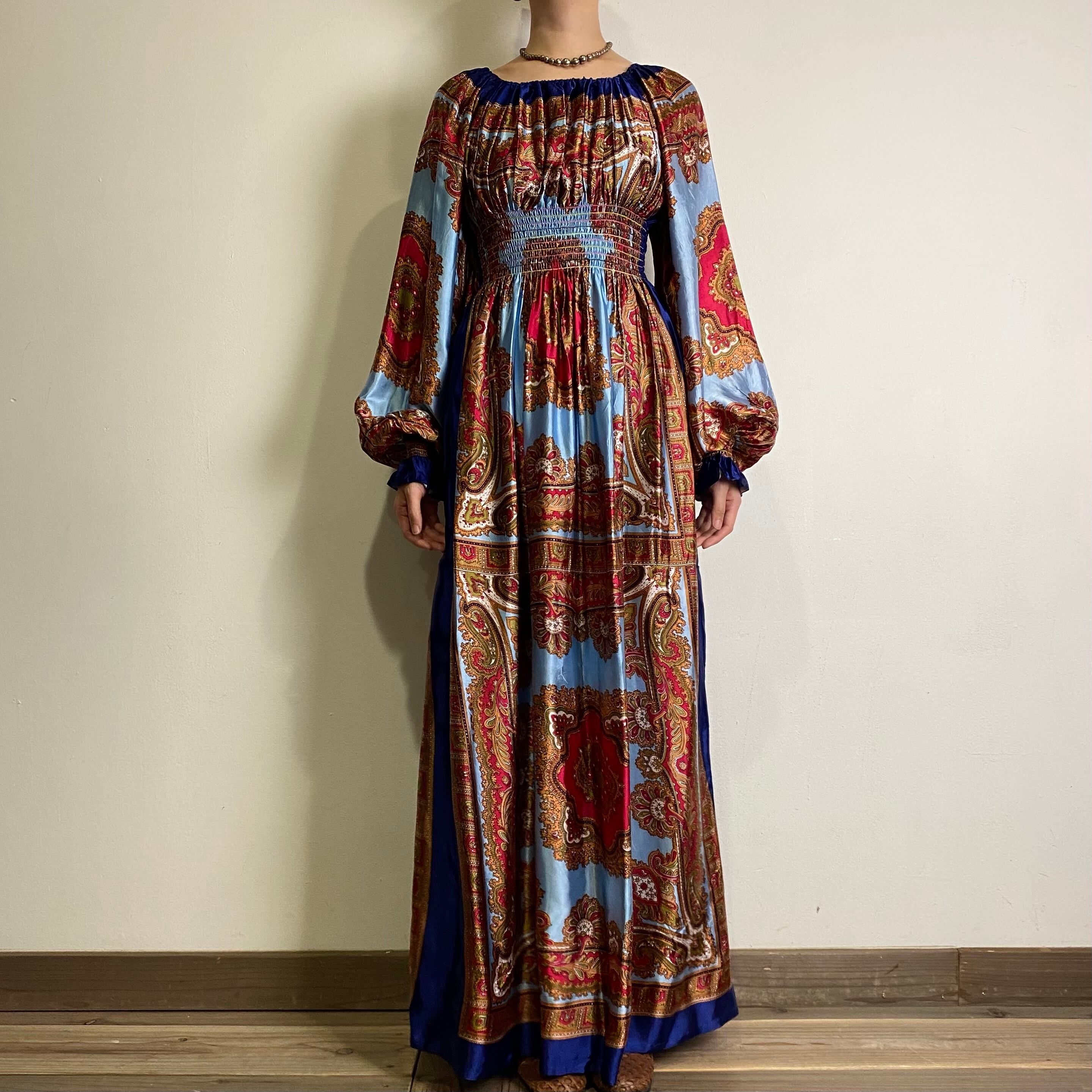 スカーフのような生地を用いて作られた60~70年代のスペシャルなロングワンピースです。