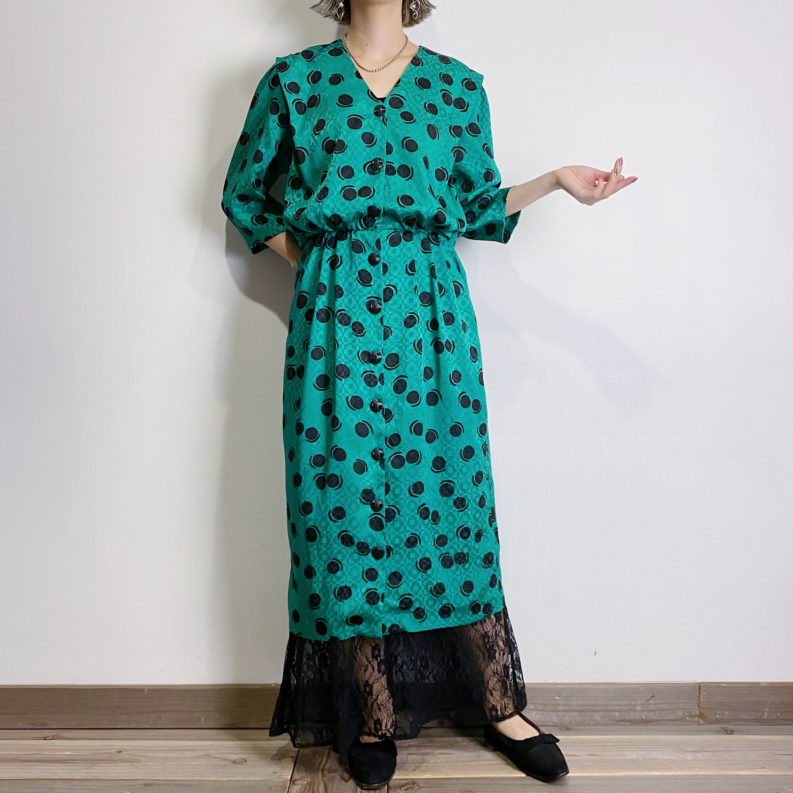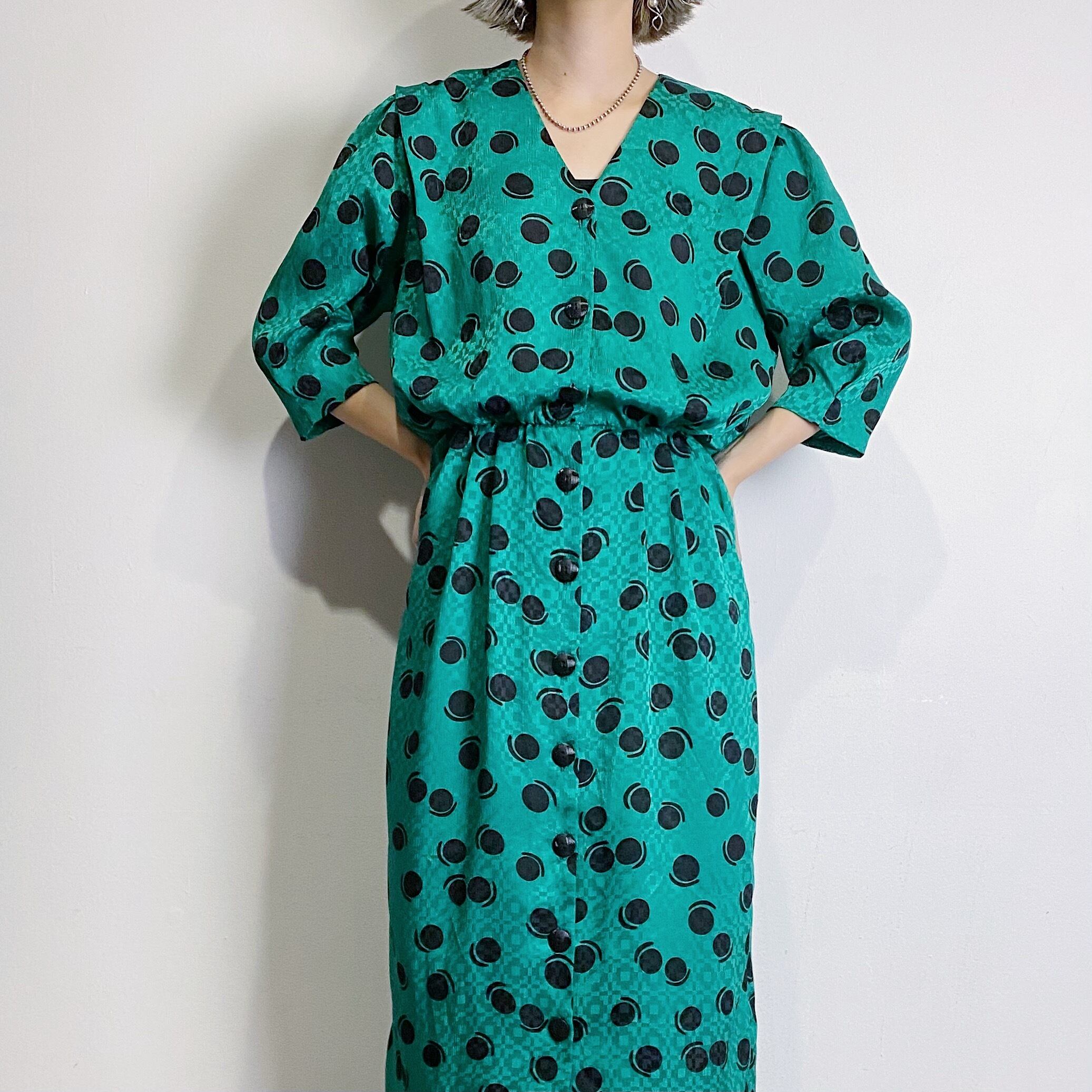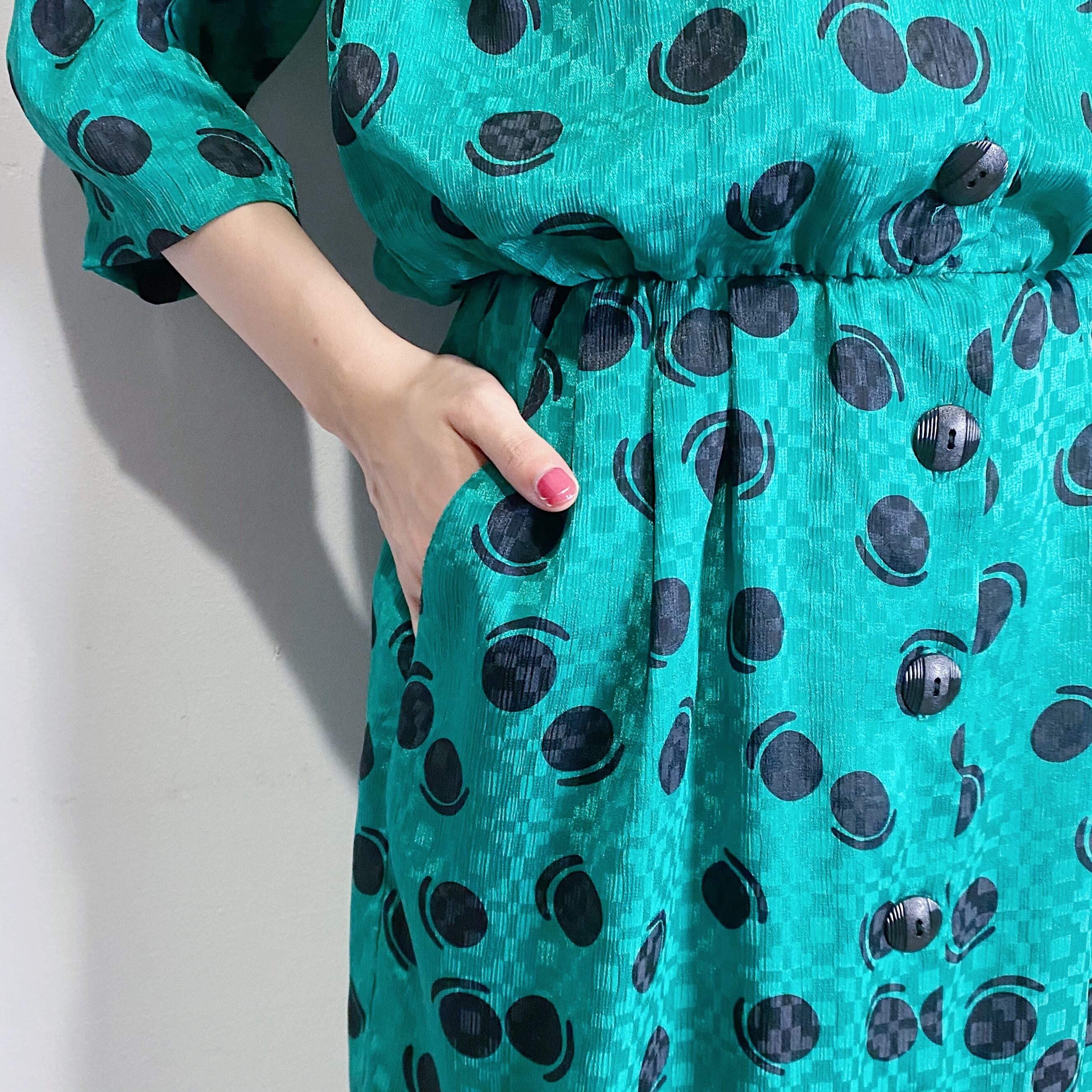 グリーン地にブラックのドットが可愛い、80年代のワンピースです。