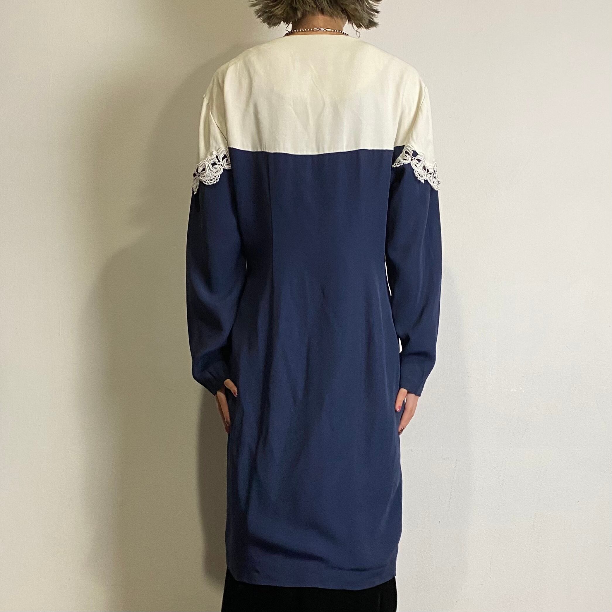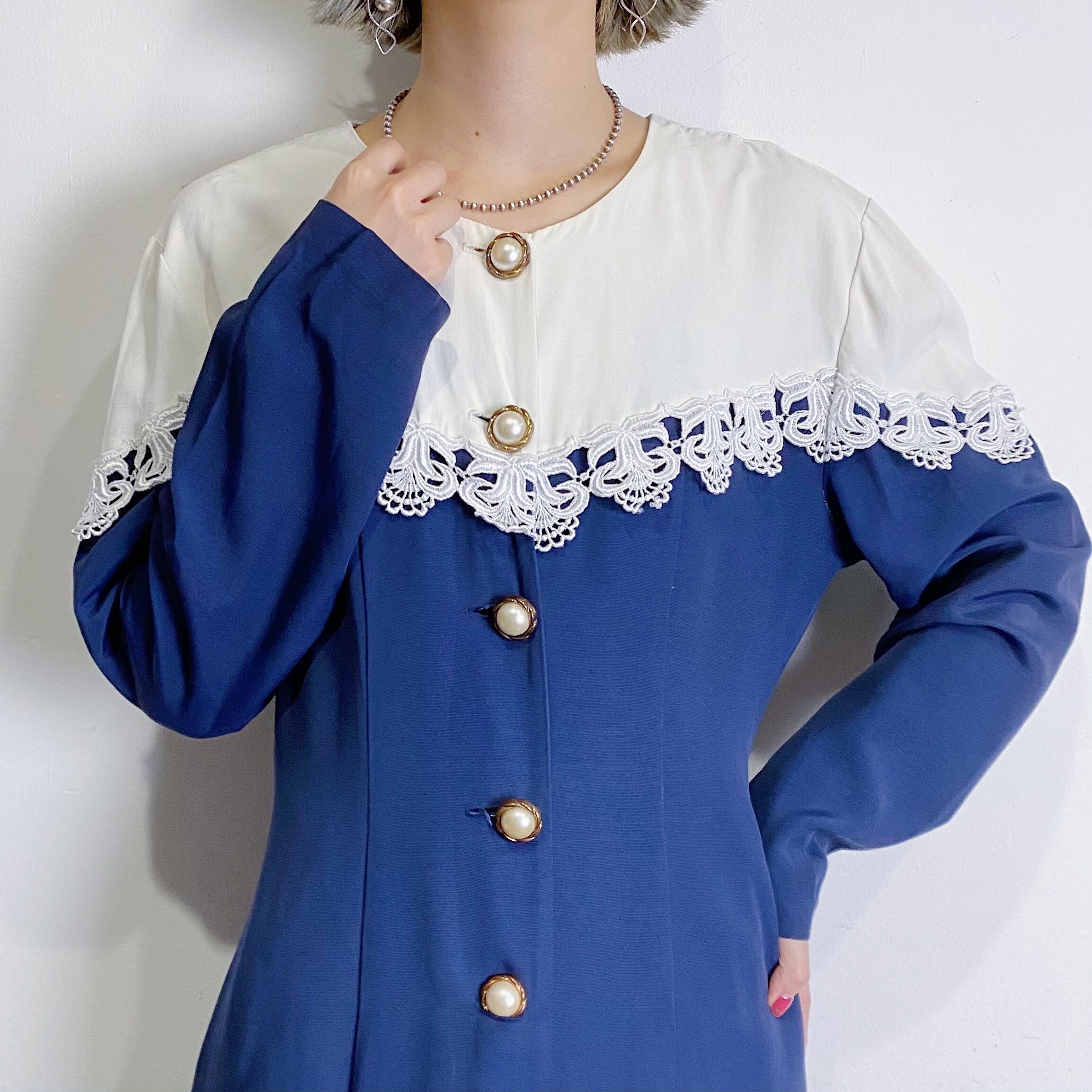 80s navy and white long sleeves dress