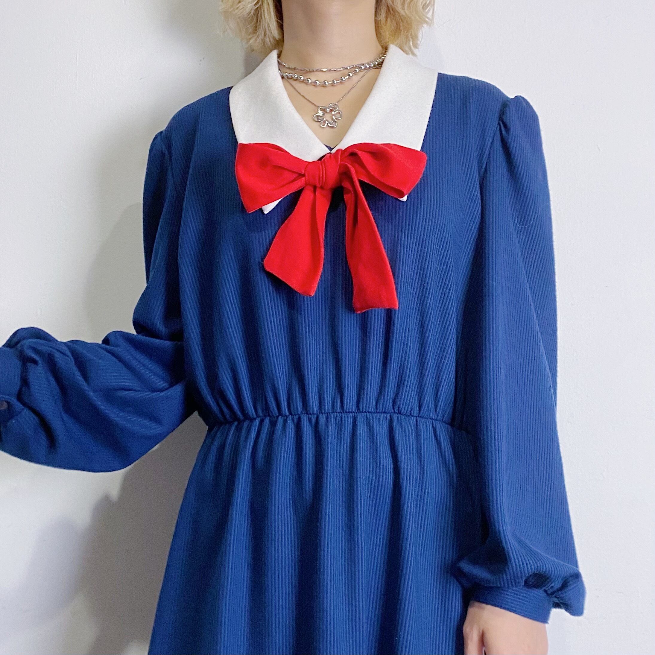 ネイビーベースに白い襟、赤いリボンがポイントの80年代のワンピースです。