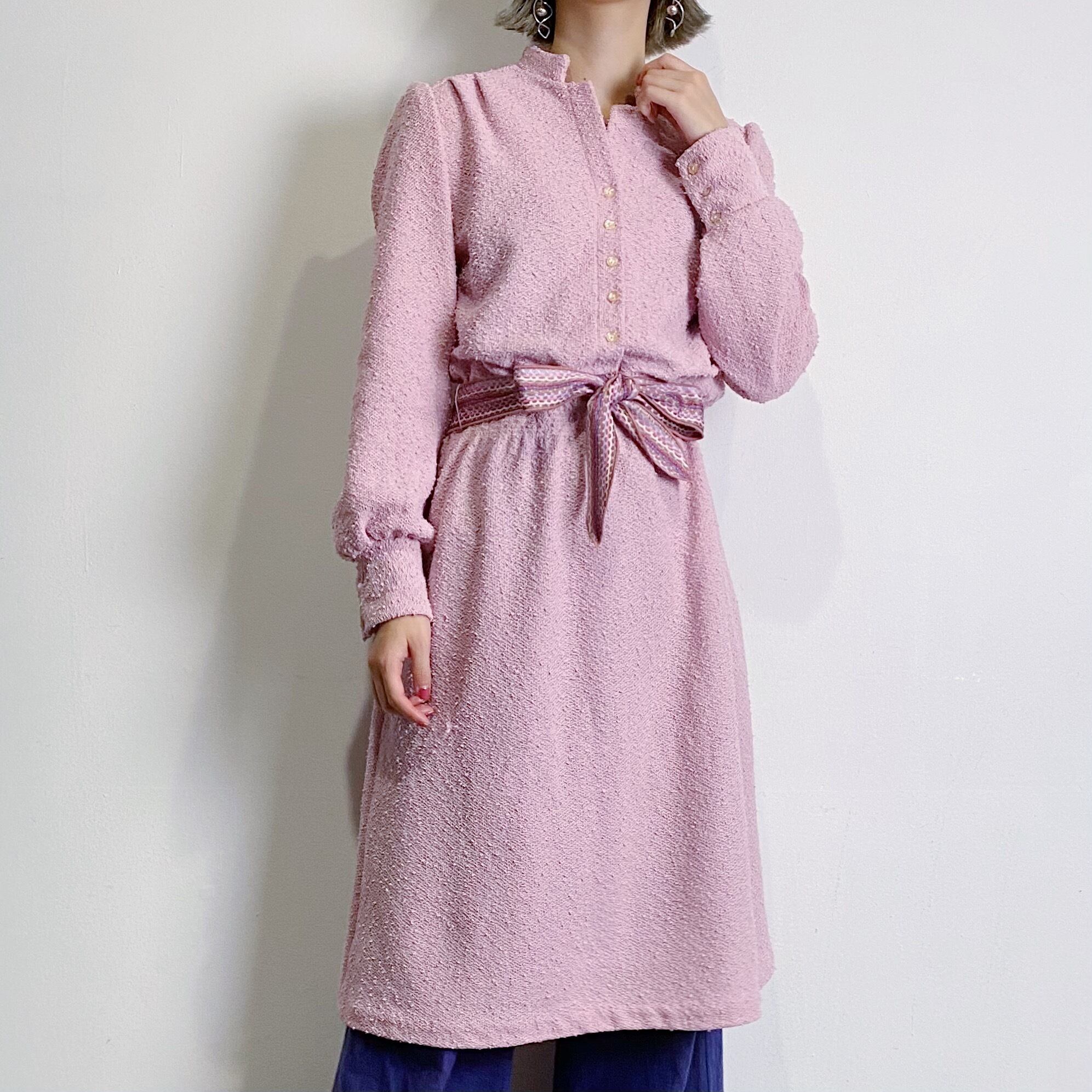 淡いピンクベースにポコポコとした生地感が可愛い70年代の長袖ワンピースです。