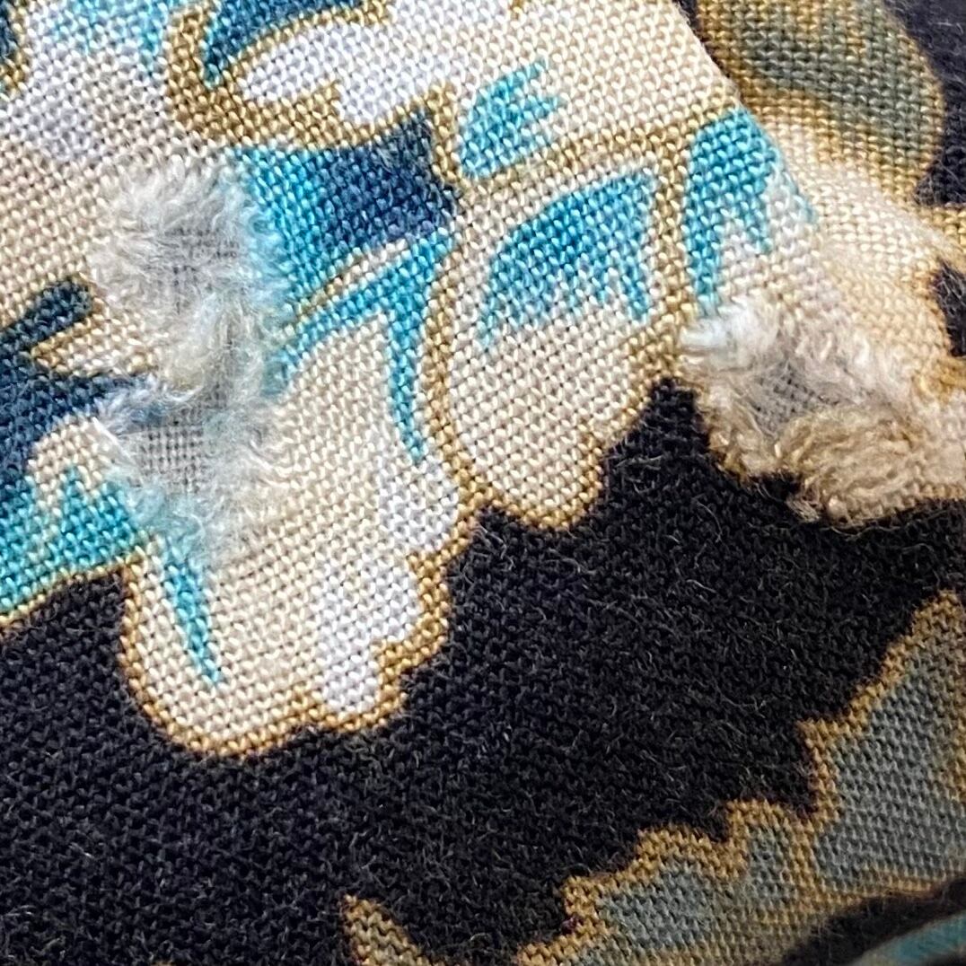 左肩の穴をお直しした跡が見受けられますが、柄に紛れてほぼ目立ちません。