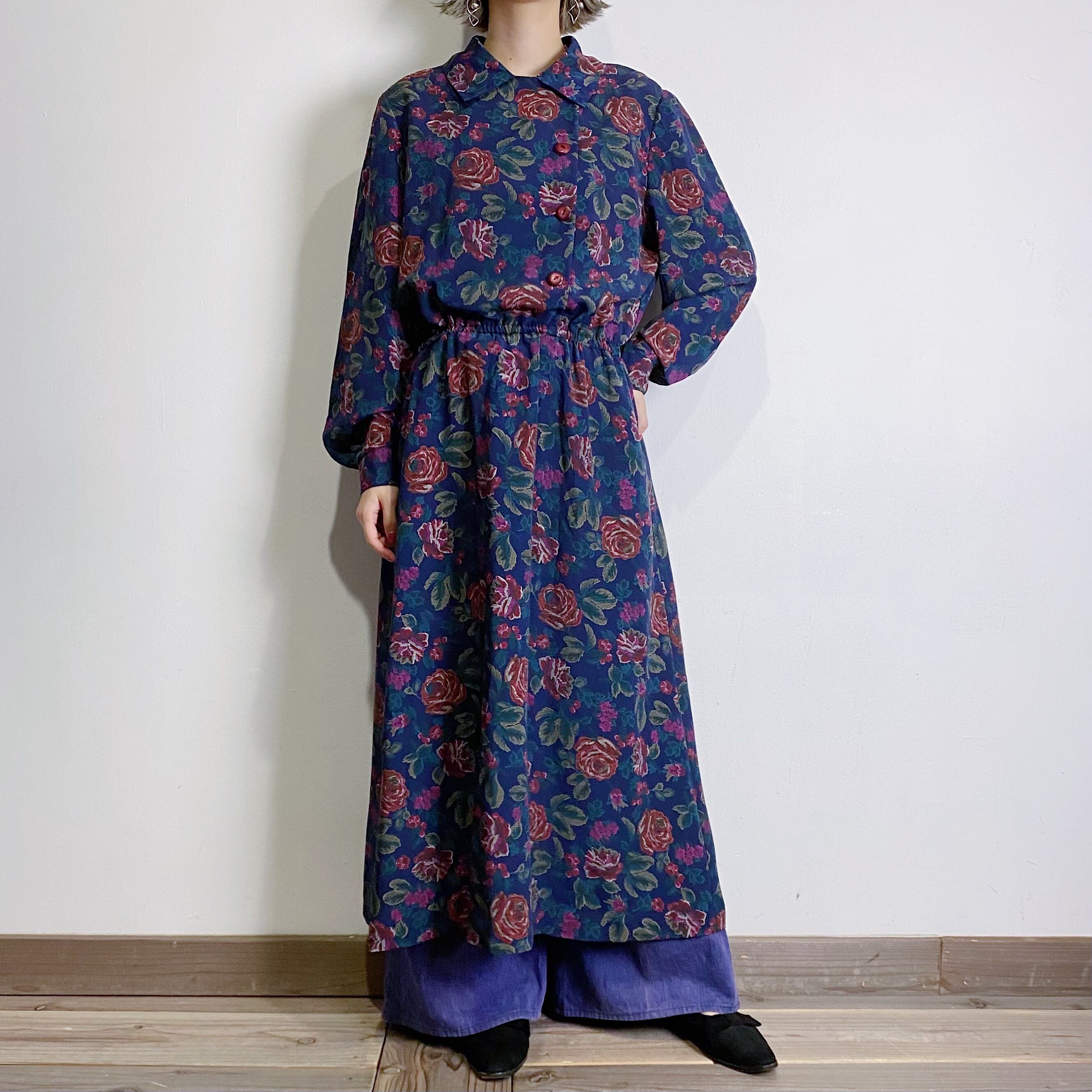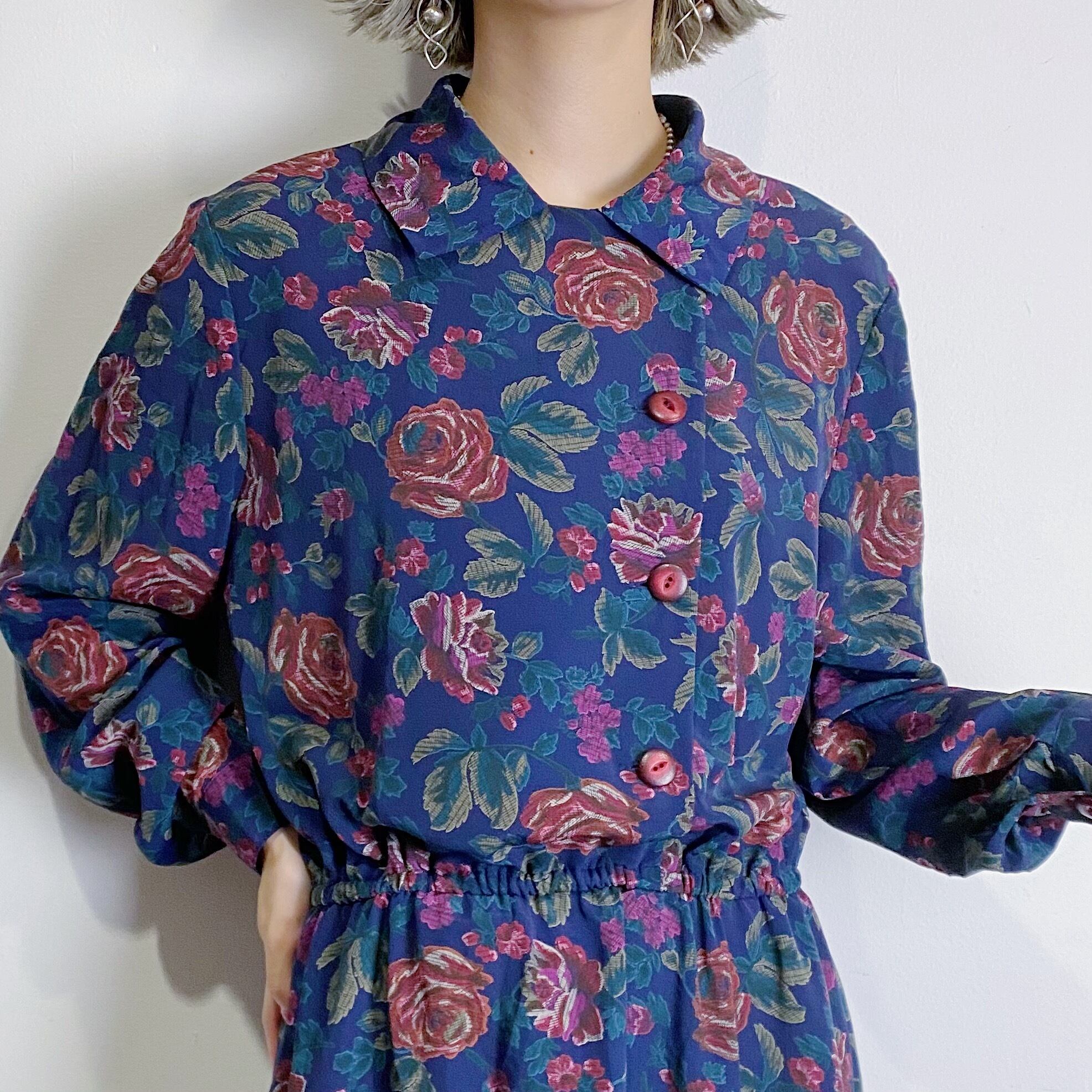 ネイビーベースにバラの模様が大人かわいいシャツワンピースです。