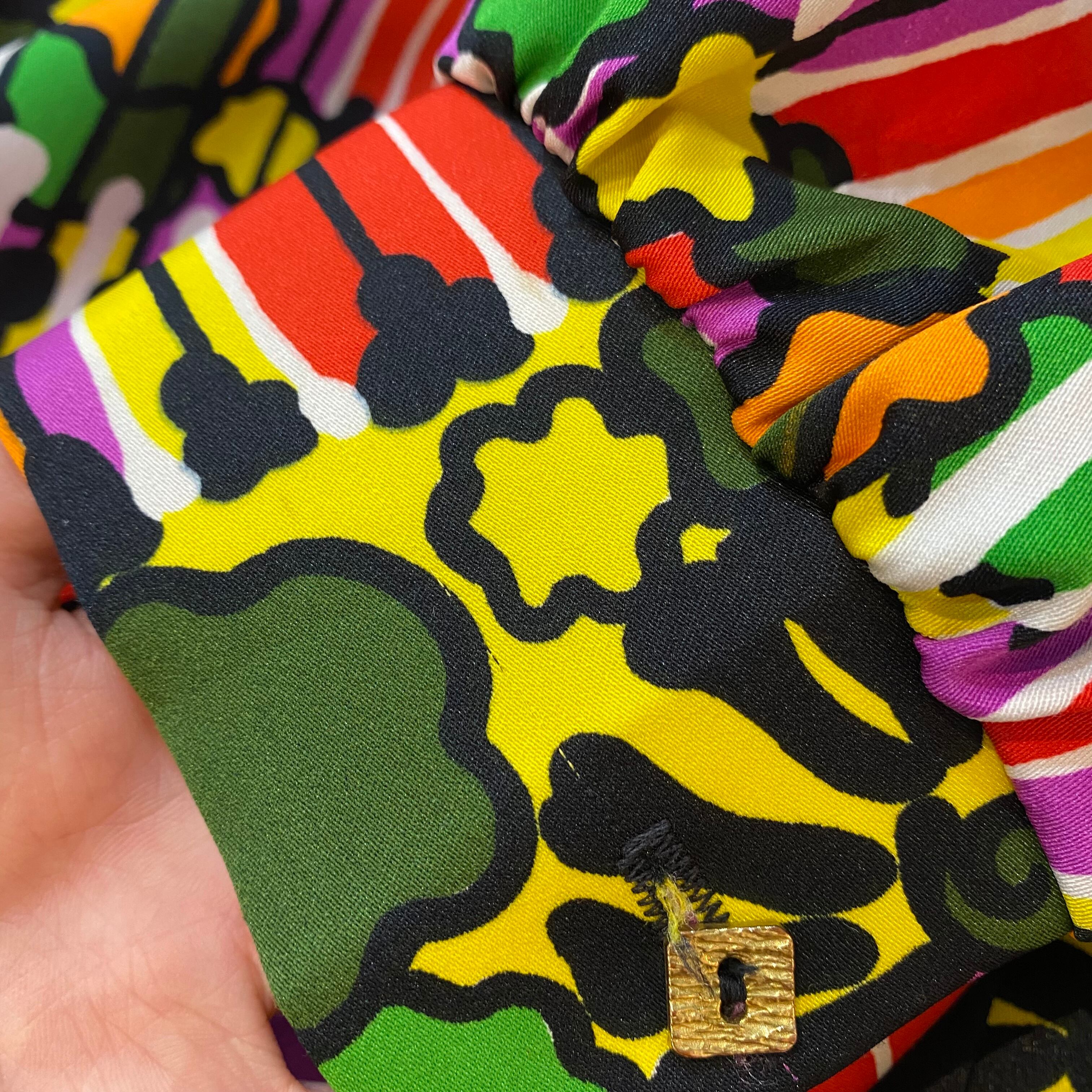 上半身のカラフルなテキスタイルにベロア風素材の切り替えが可愛い70年代のロングワンピースです。