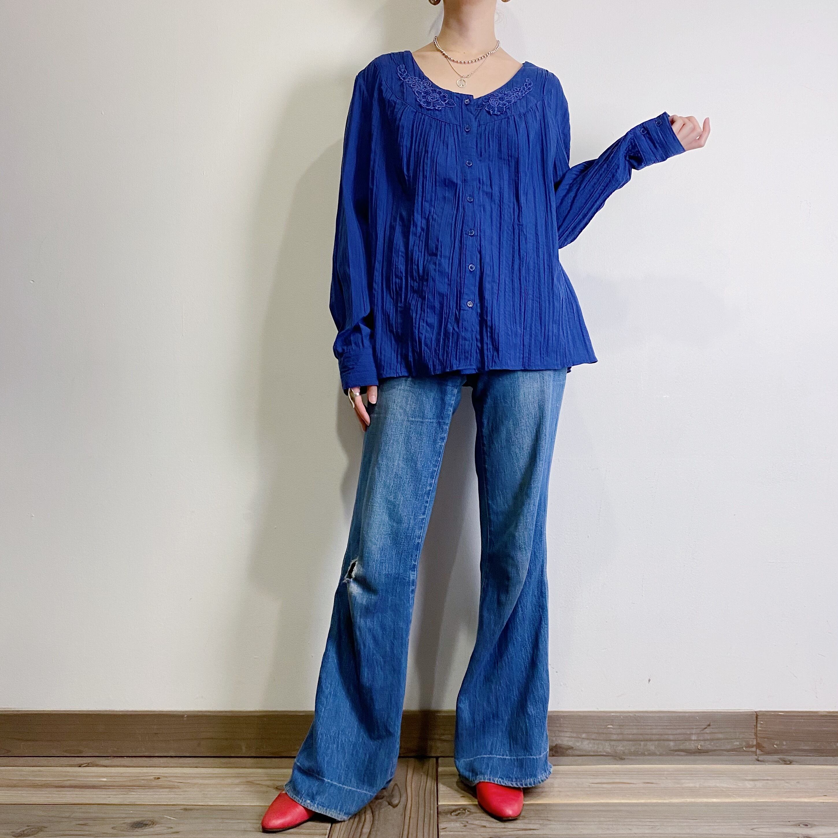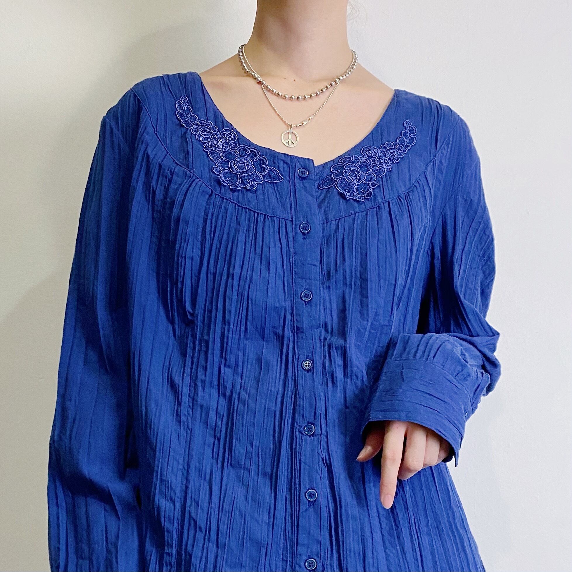 ネイビーベースにシワ加工が可愛い長袖シャツです。