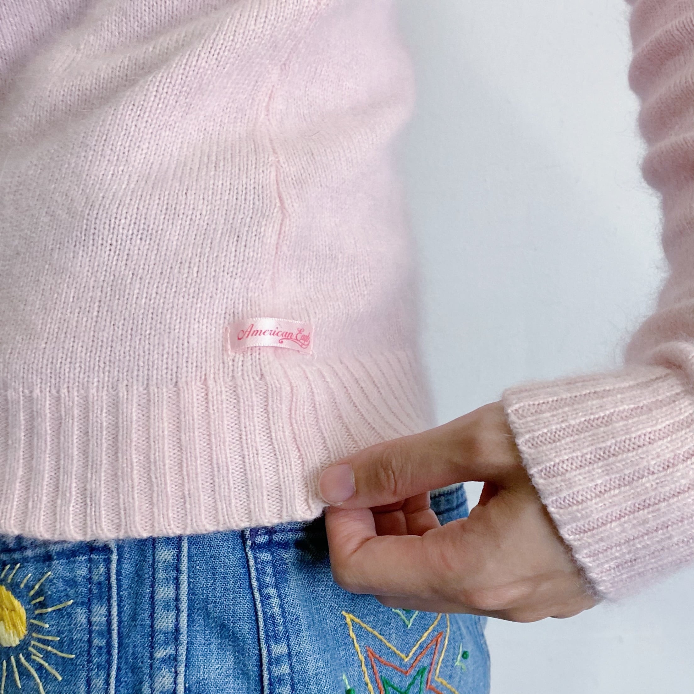 ベビーピンクの色合いが可愛らしい薄手セーターです。
