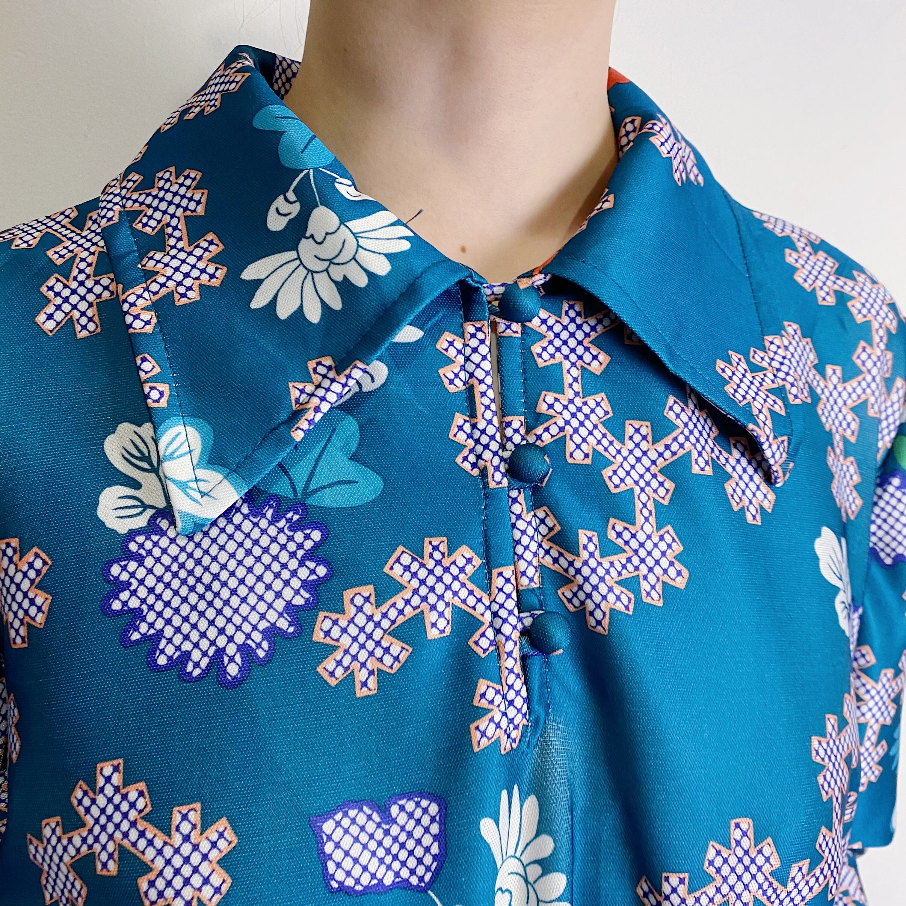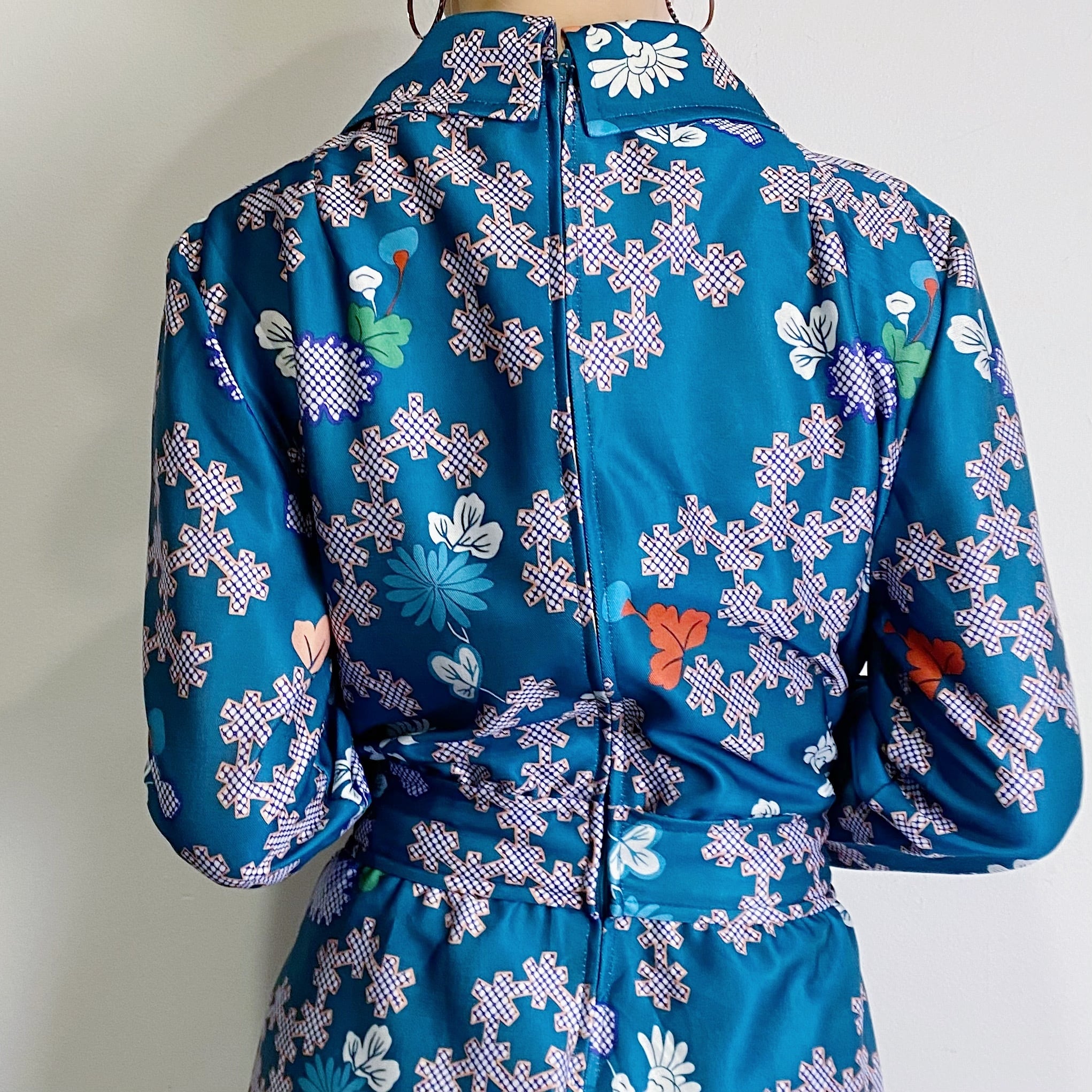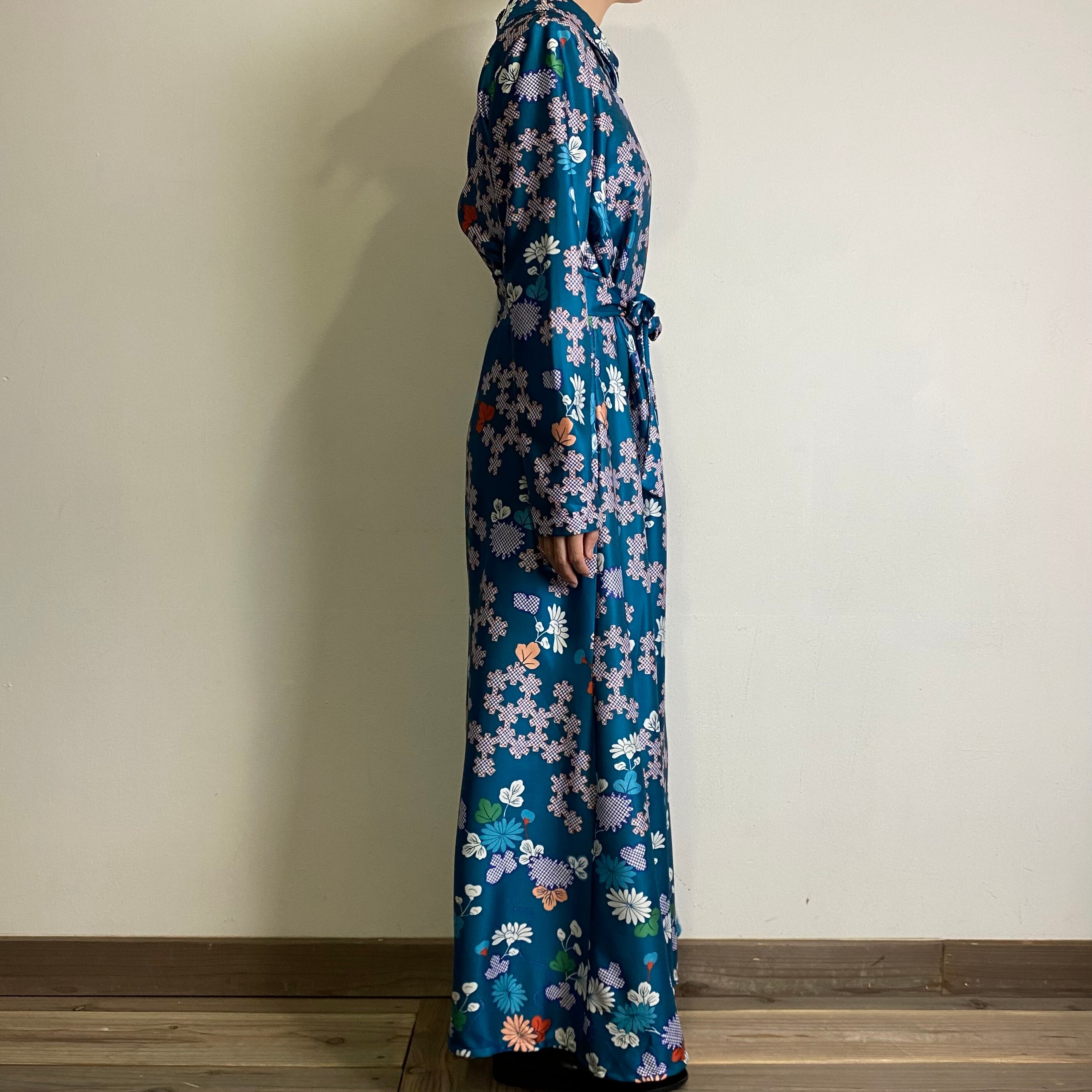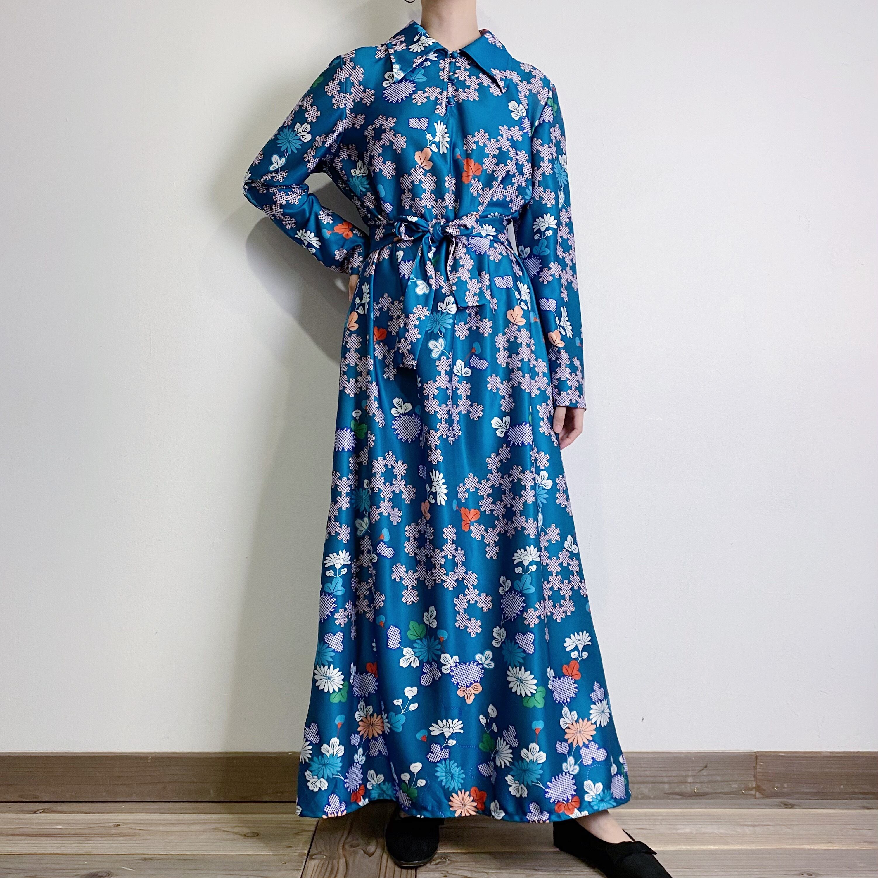 綺麗なブルーに不思議な花柄が可愛い70年代のロングワンピースです。