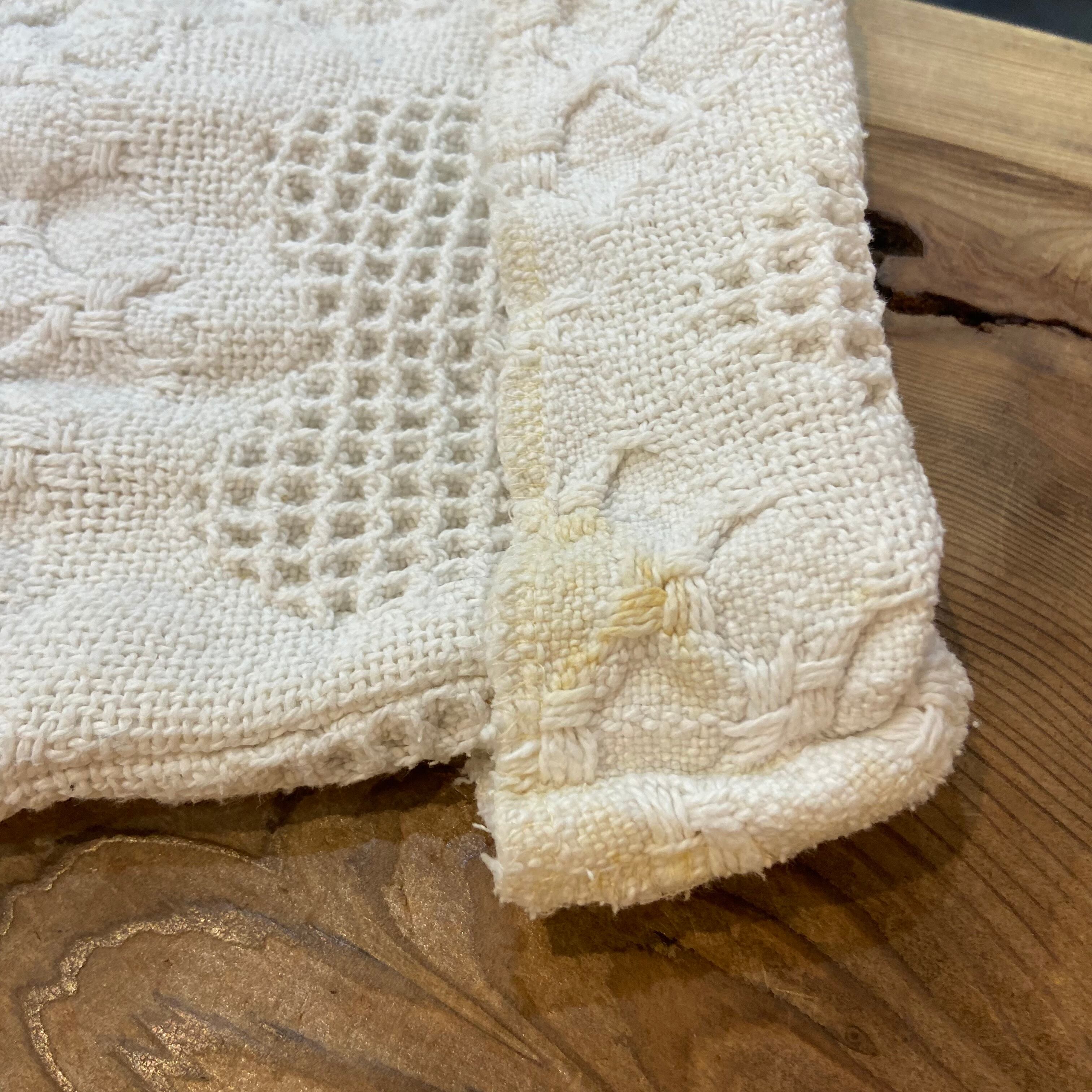 ハートモチーフ部分はワッフル生地になっていたり、その他のまるの部分も編み込まれていたりなど、細かいこだわりがたくさん詰まった一枚。