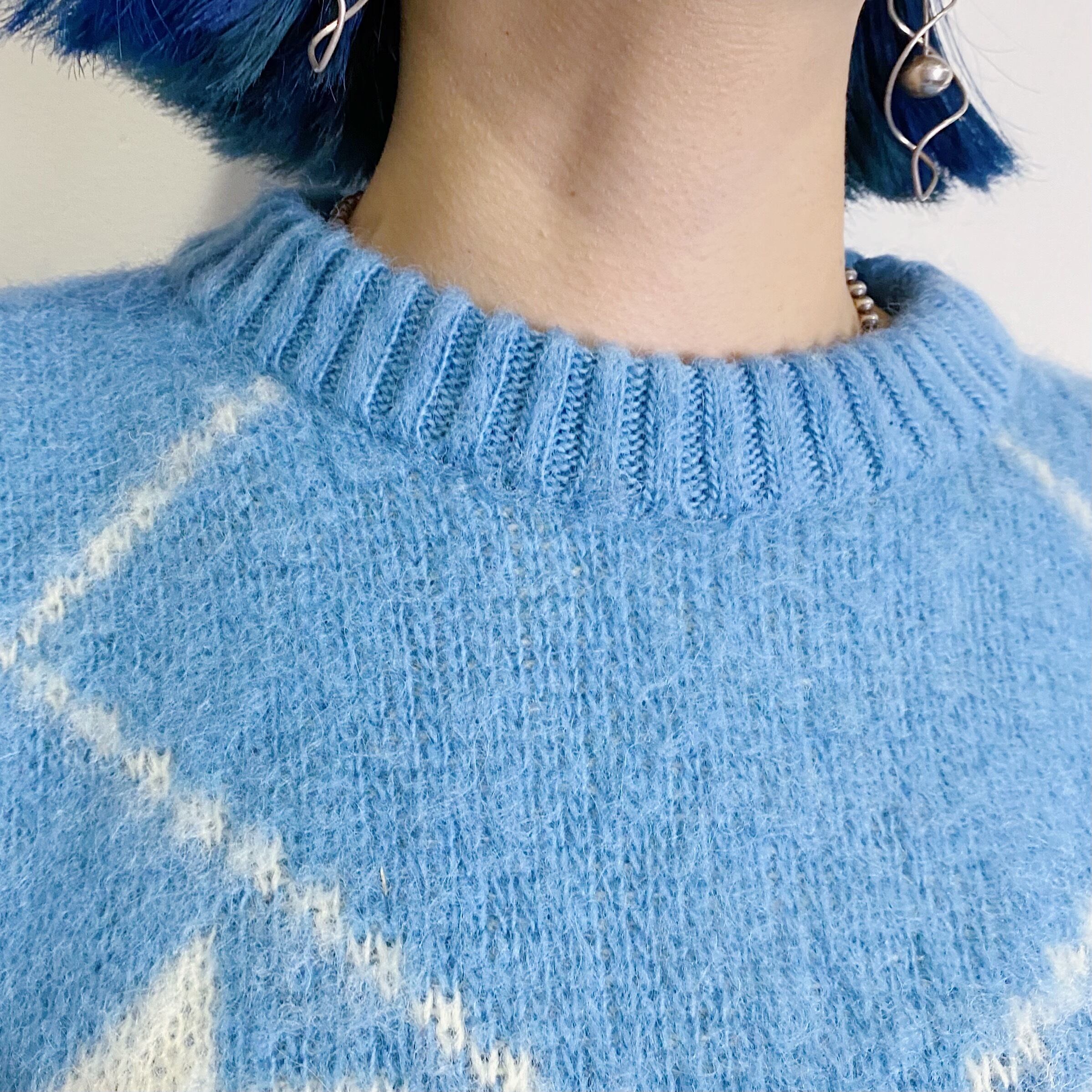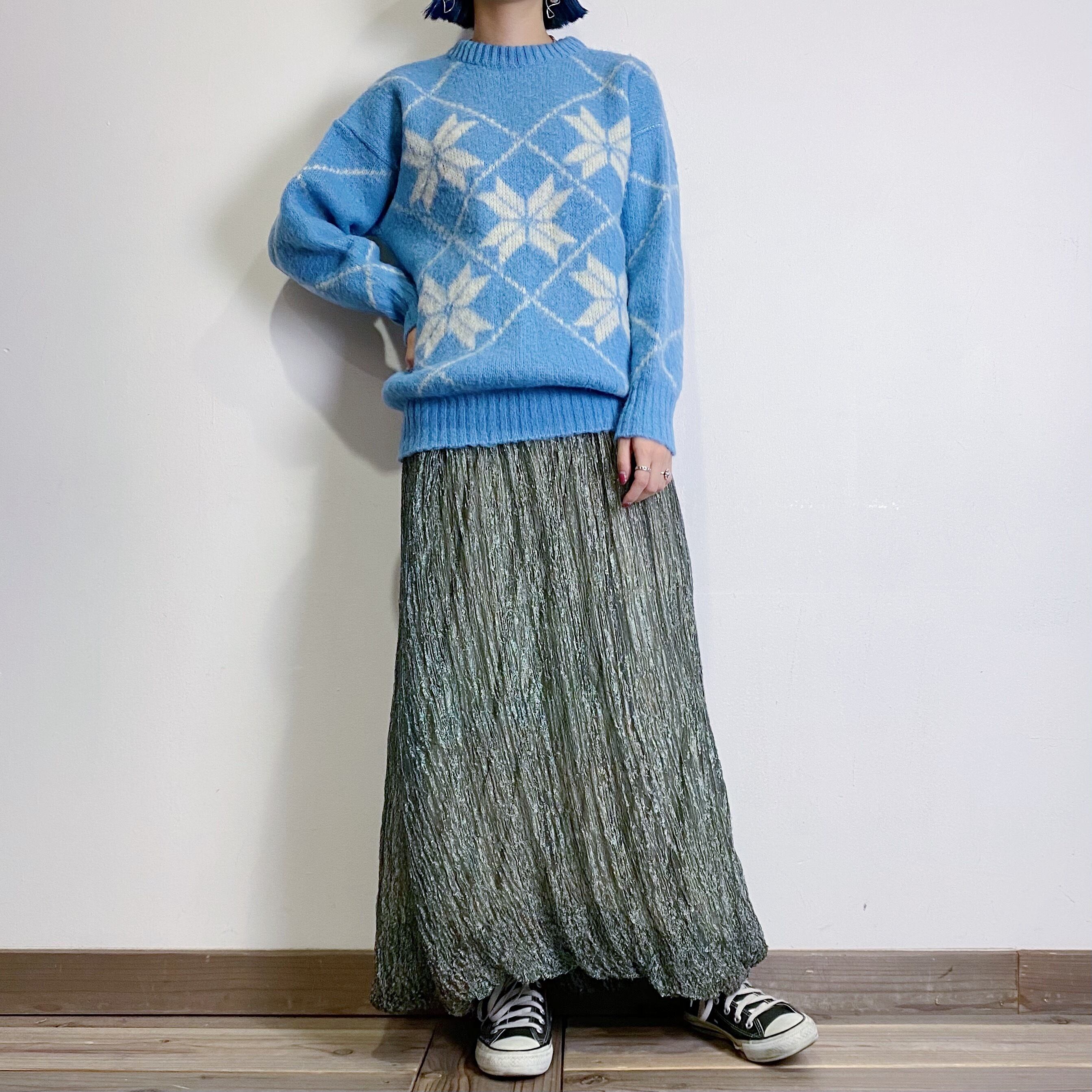 サックスブルーに雪の結晶の模様がかわいいウールニットです。