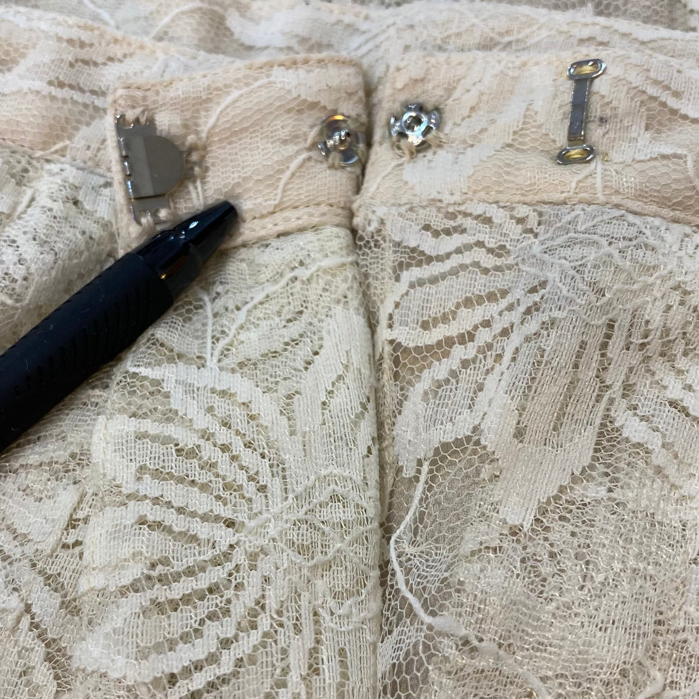 レース生地にホツレと穴をお直しした跡が見受けられますが、ここからほどけてしまう心配はなく見た目にもほぼ目立ちません。