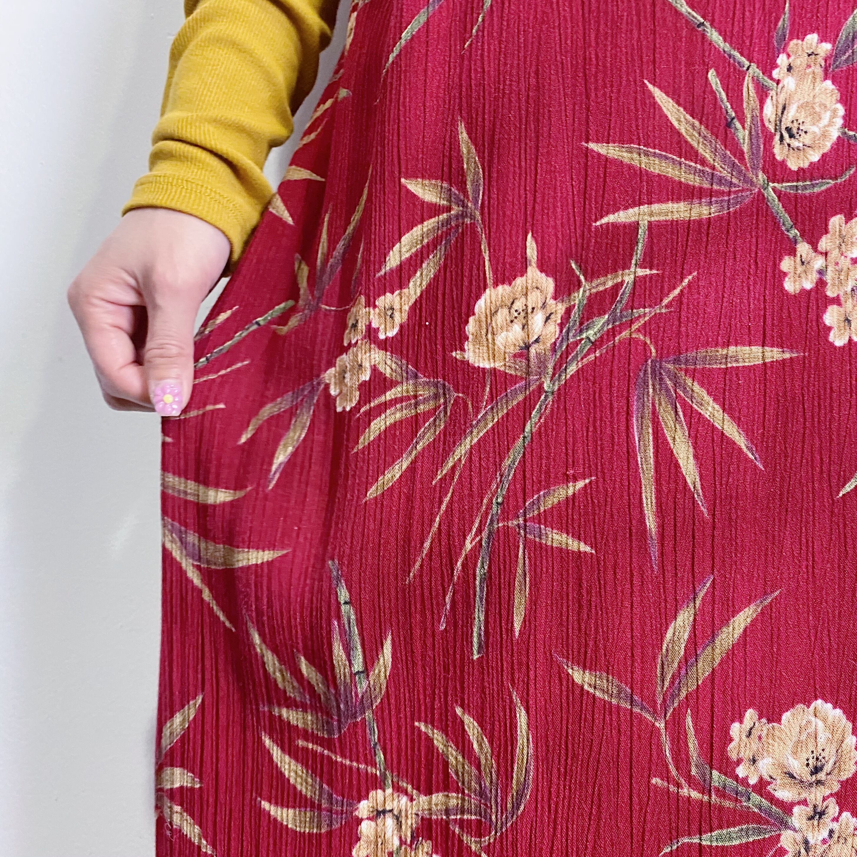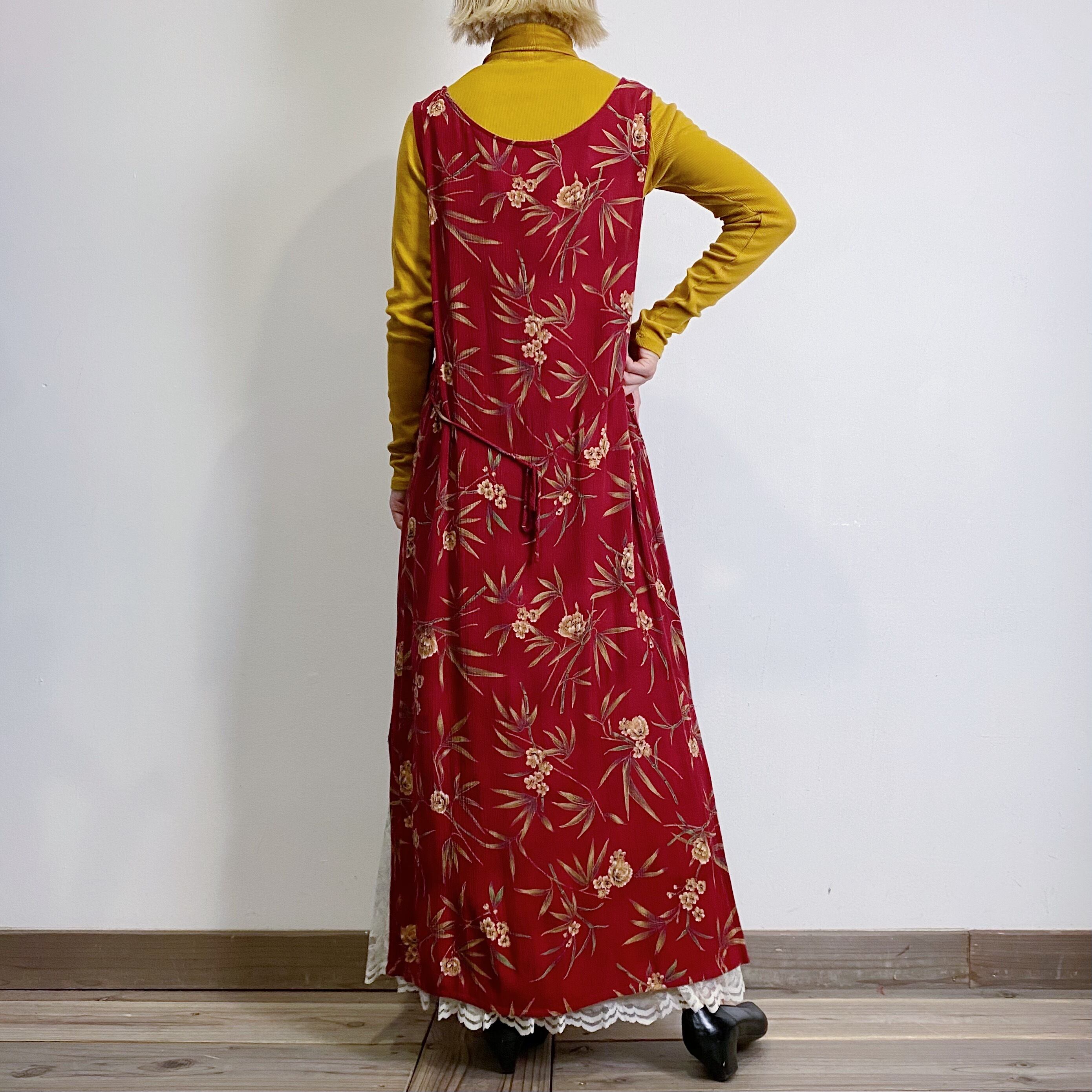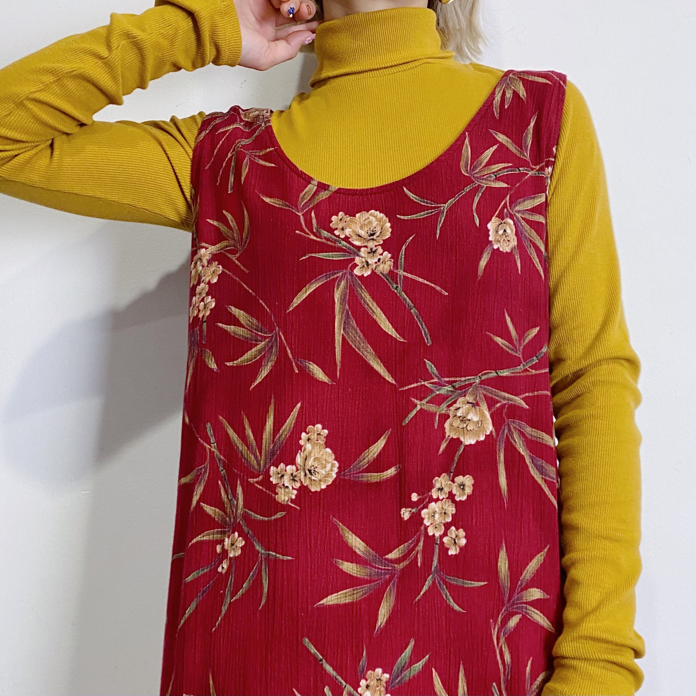 深めのレッドに草花のプリントがかわいい、90年代のノースリーブワンピースです。
