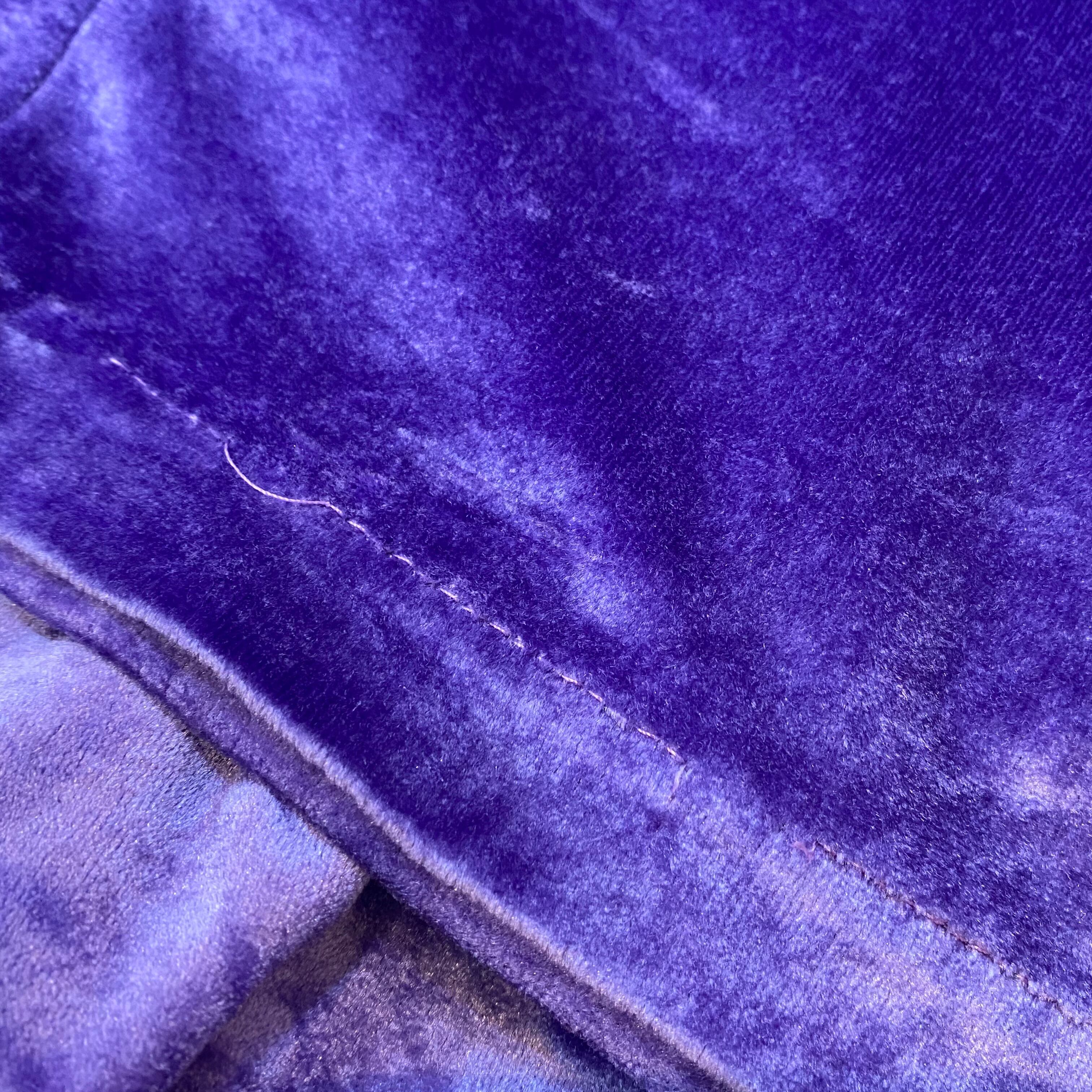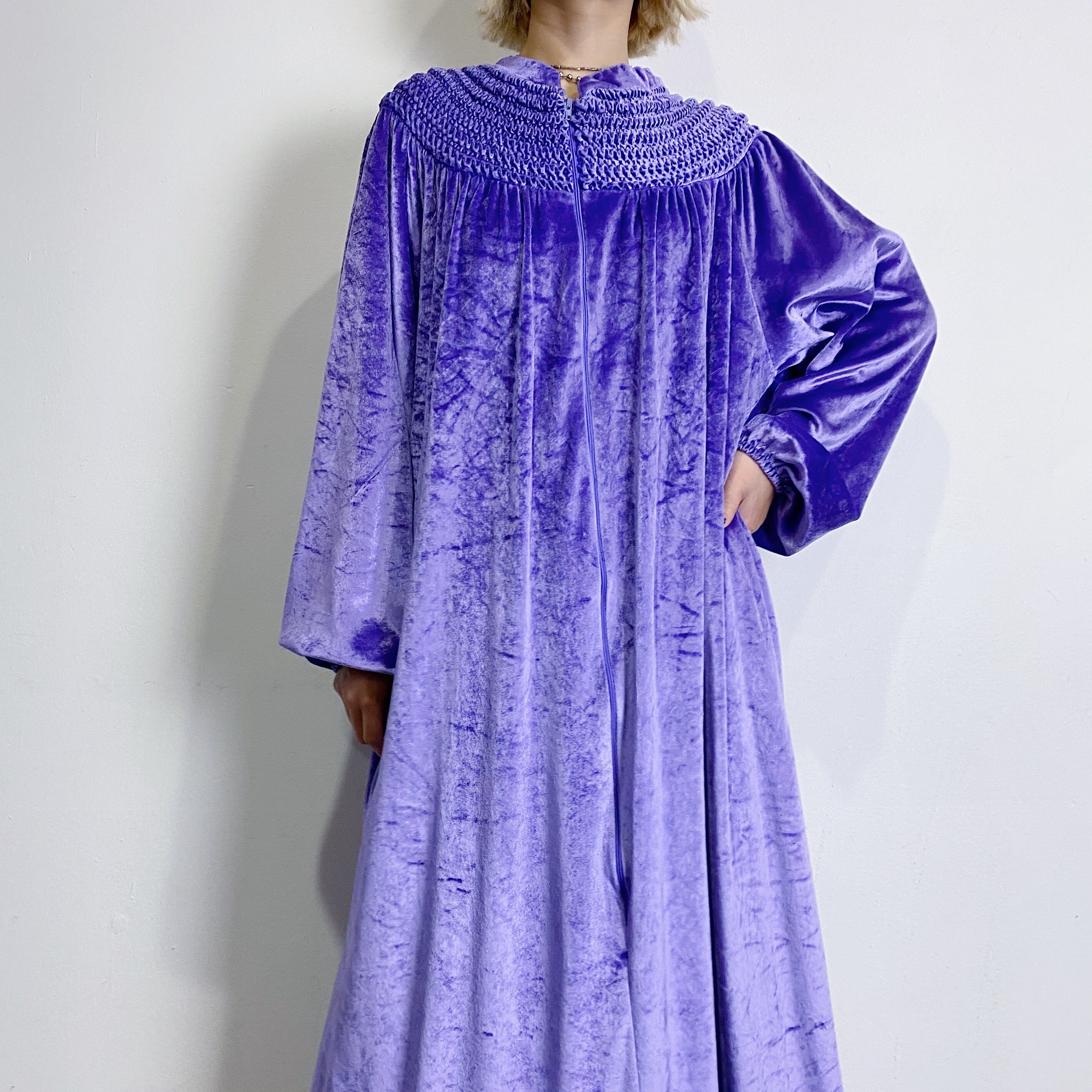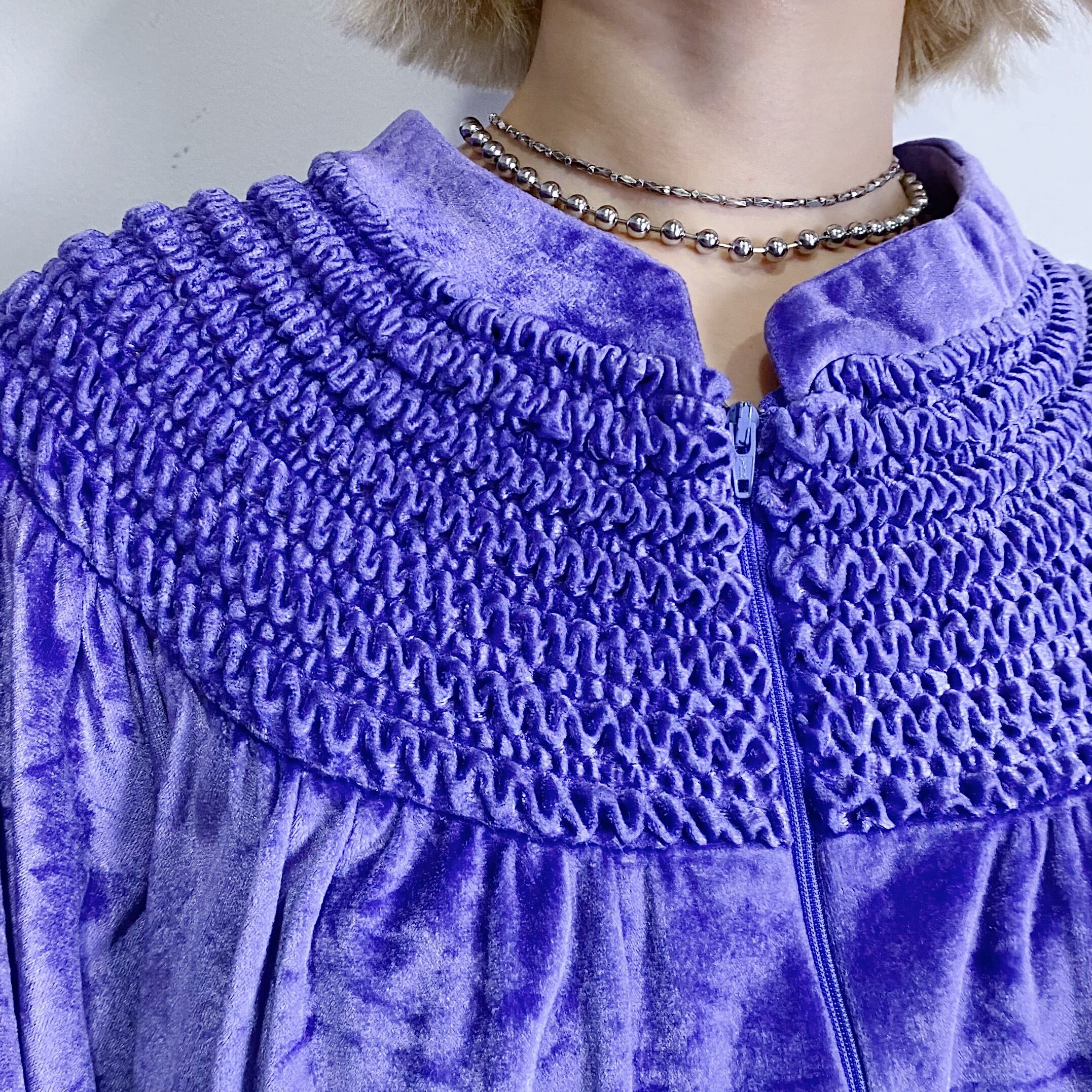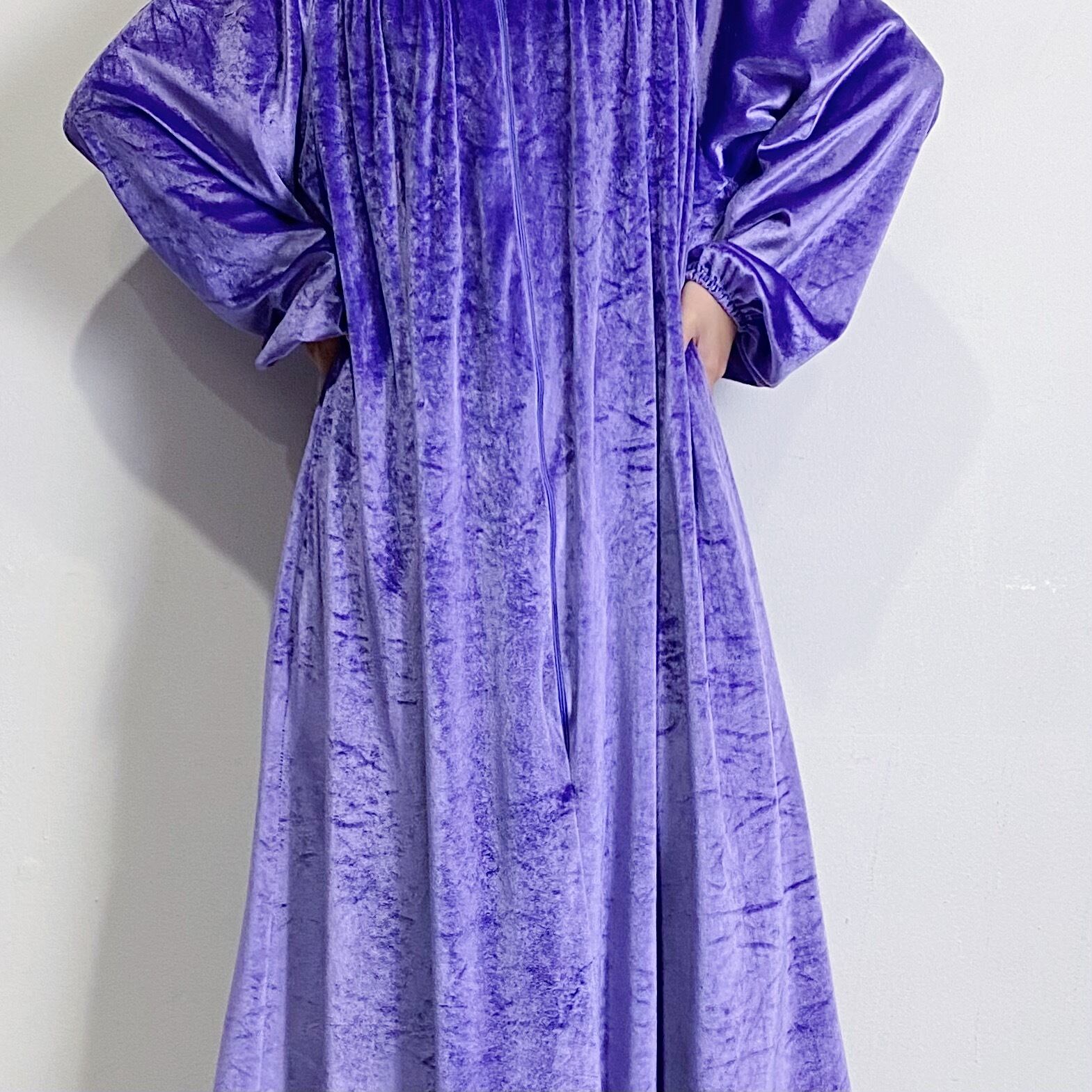 明るめのパープルに首回りのシャーリングが可愛いベロアワンピースです。