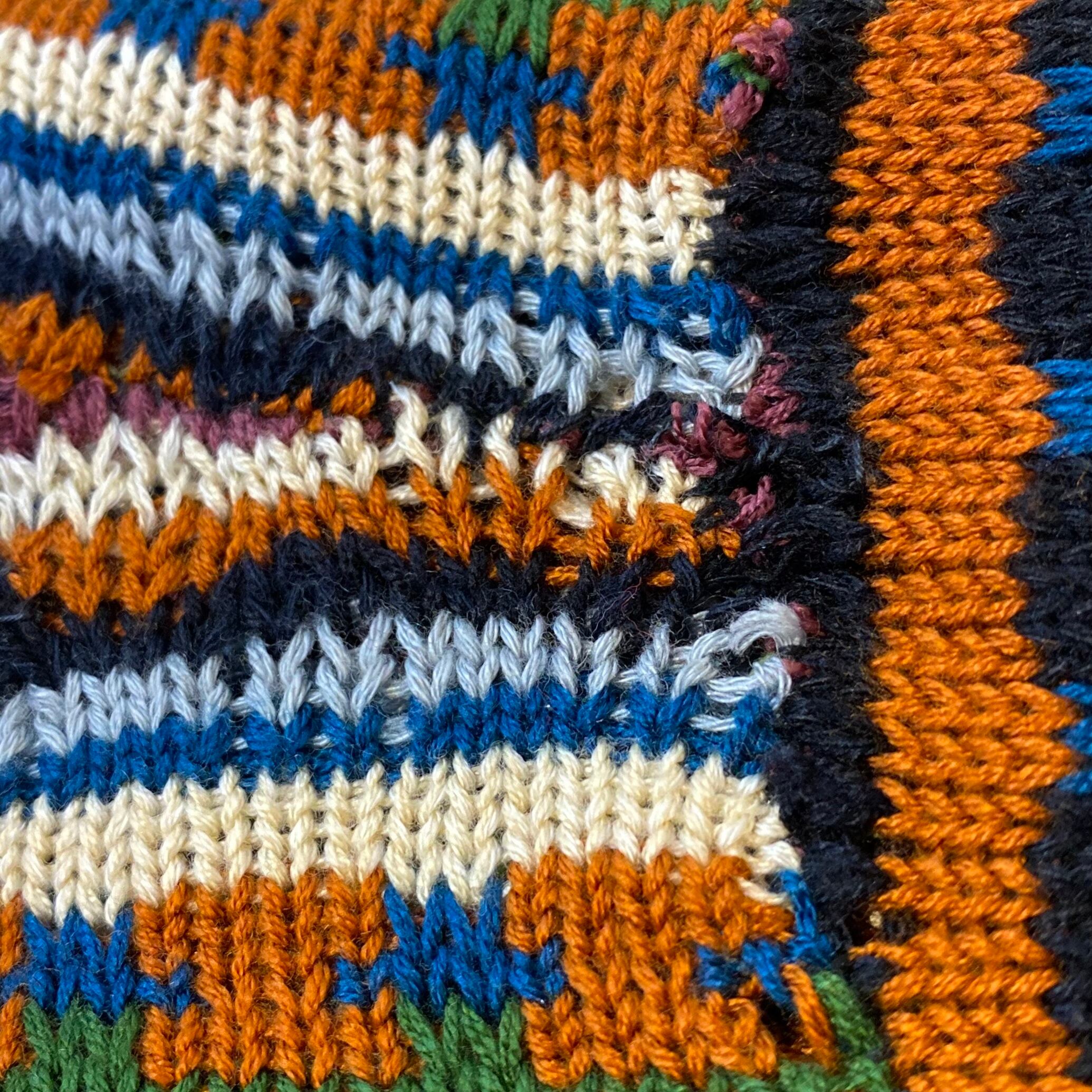 ホツレをお直しした跡が見受けられるほか、所々に糸が飛び出しホツレのように見える箇所がありますがここからほどけてしまう心配はなく見た目にもほぼ目立ちません。
