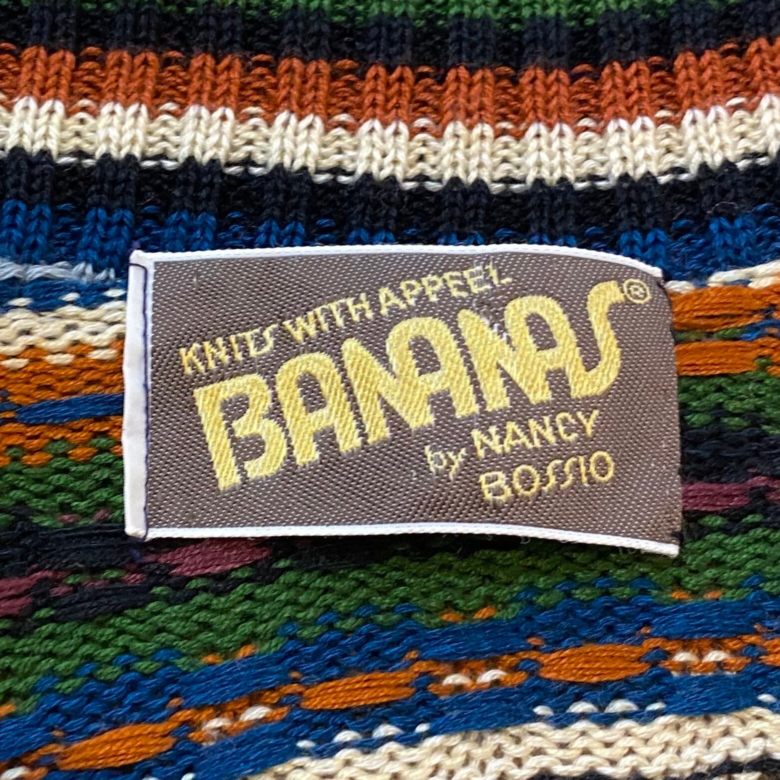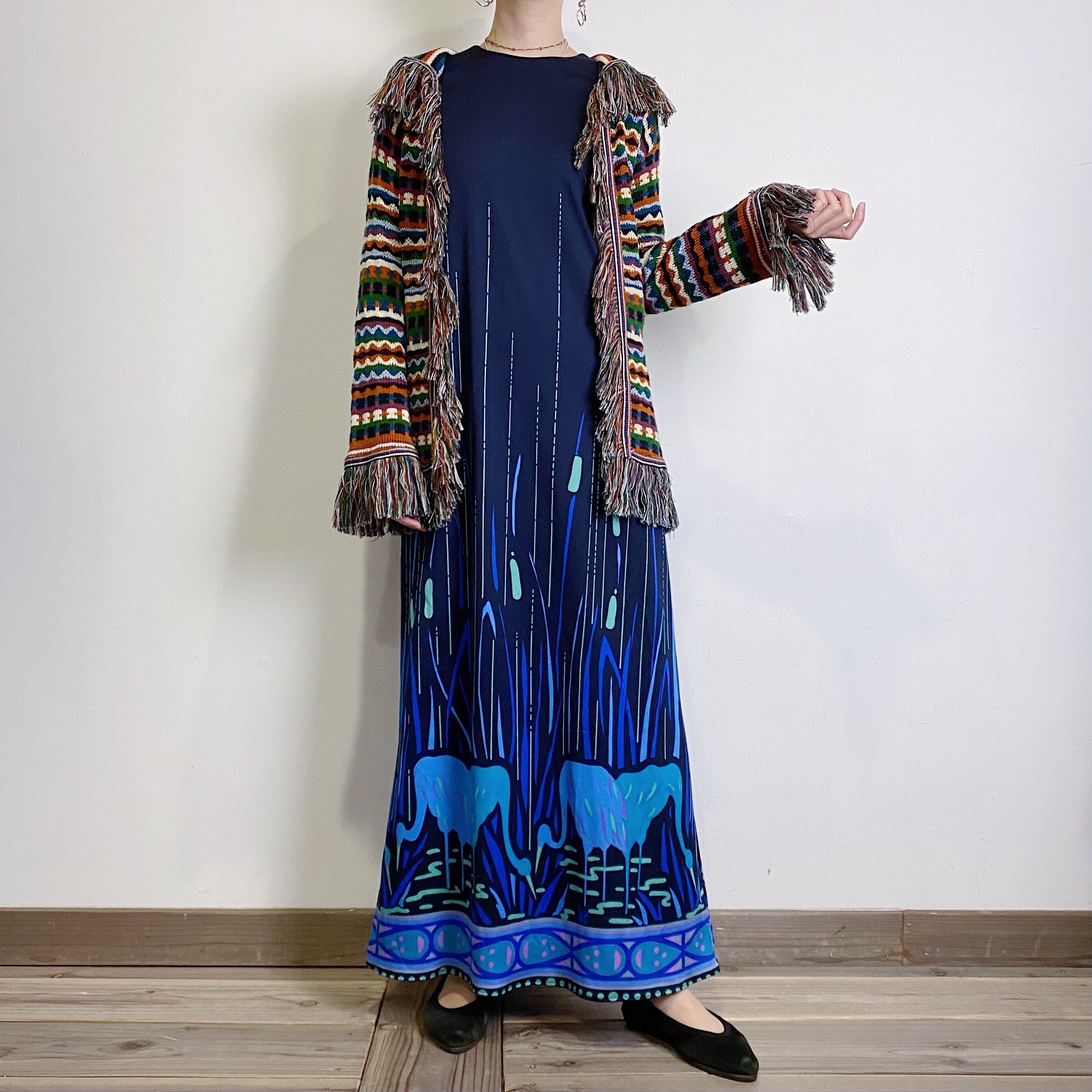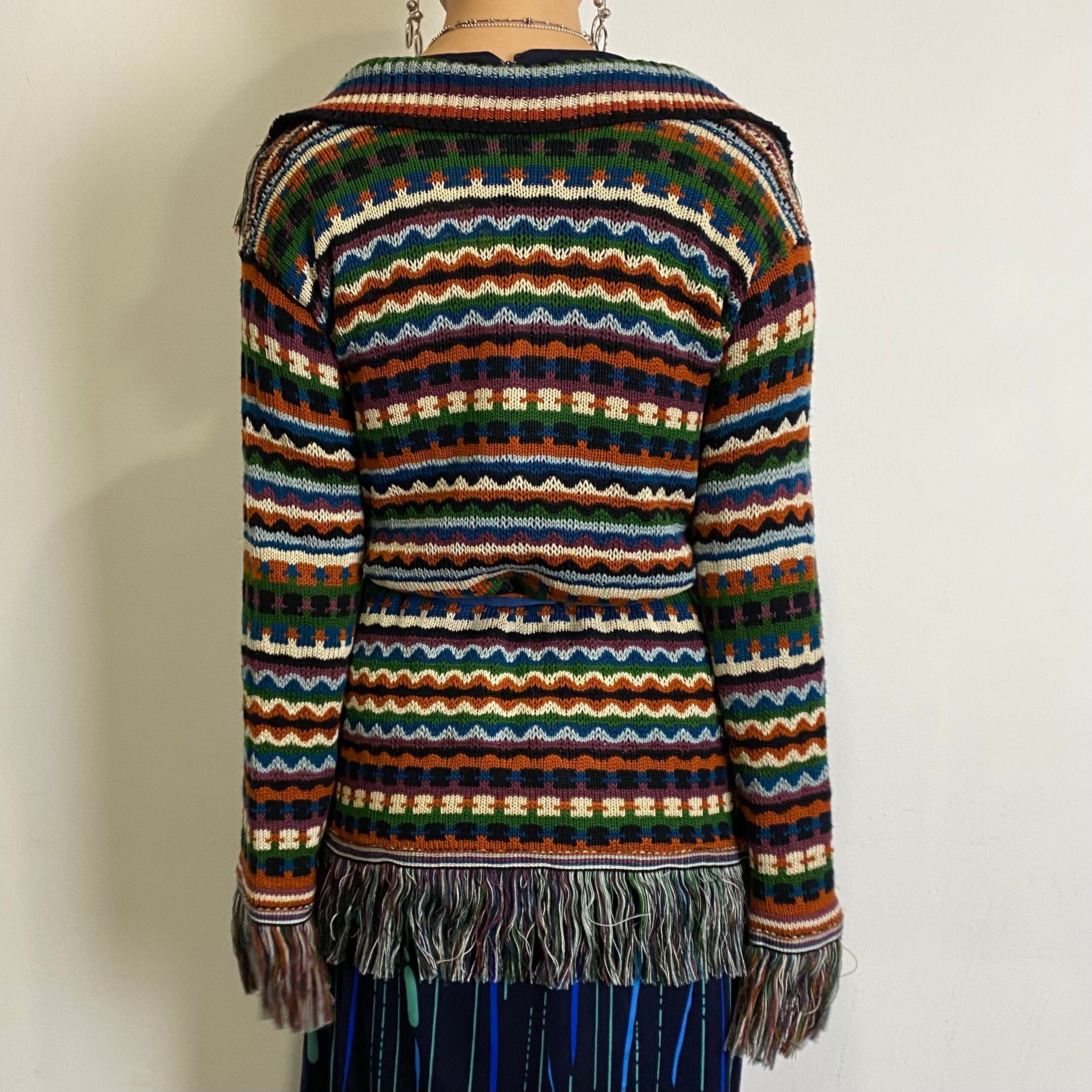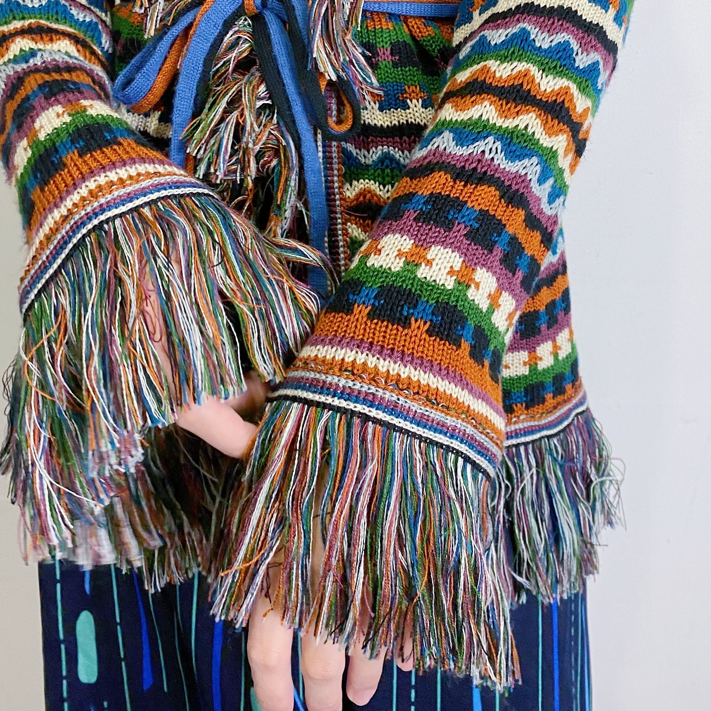 マルチカラーのボーダーにフリンジが可愛い70年代のニットカーディガンです。
