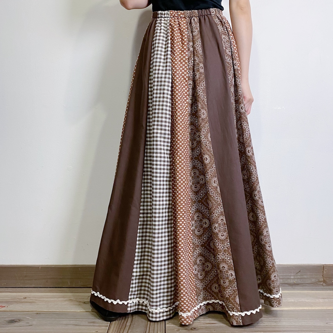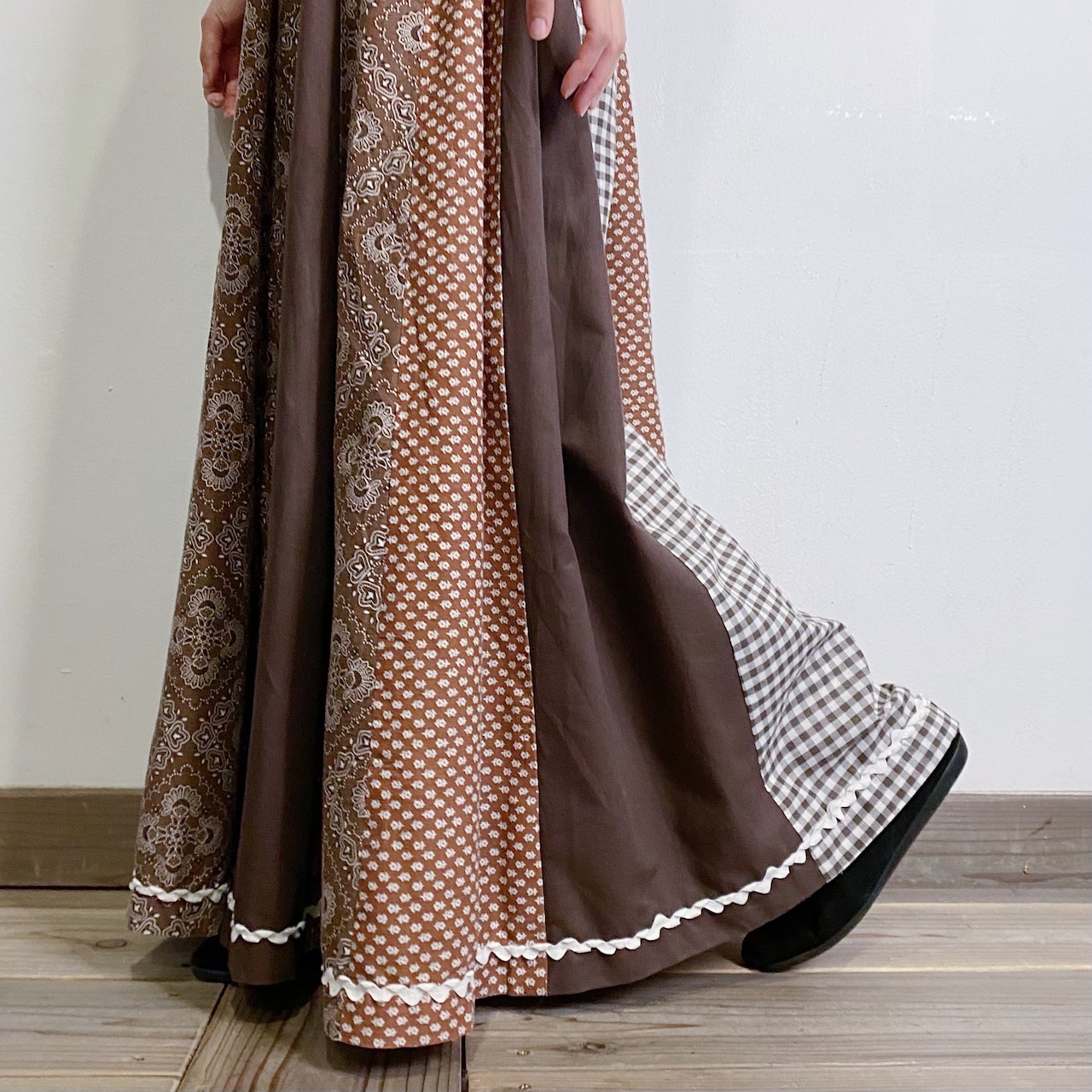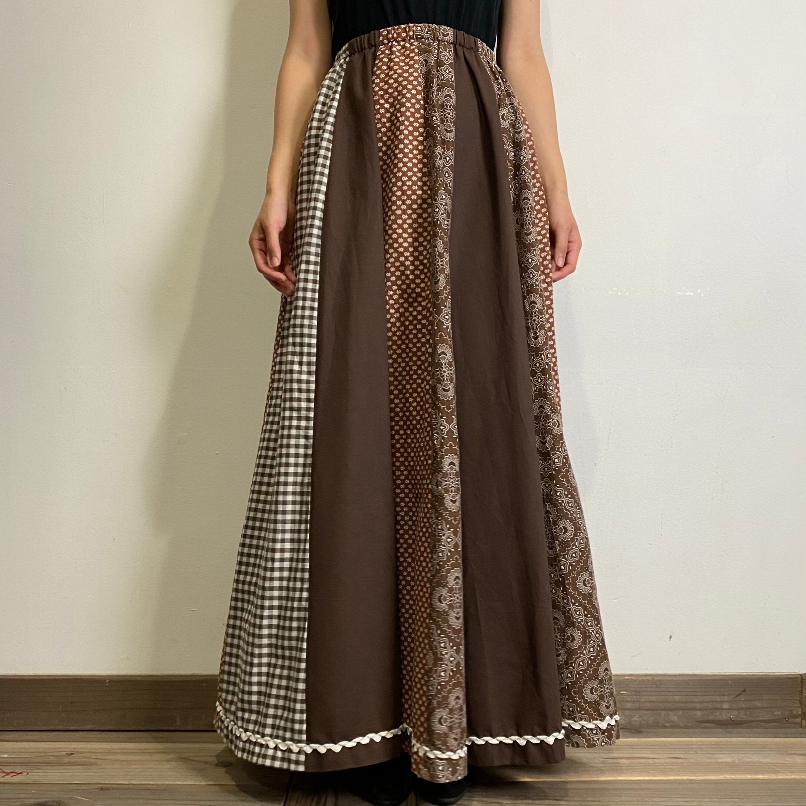 ギンガムチェックや花柄の切り替えパッチワークが可愛い70年代のロングスカートです。