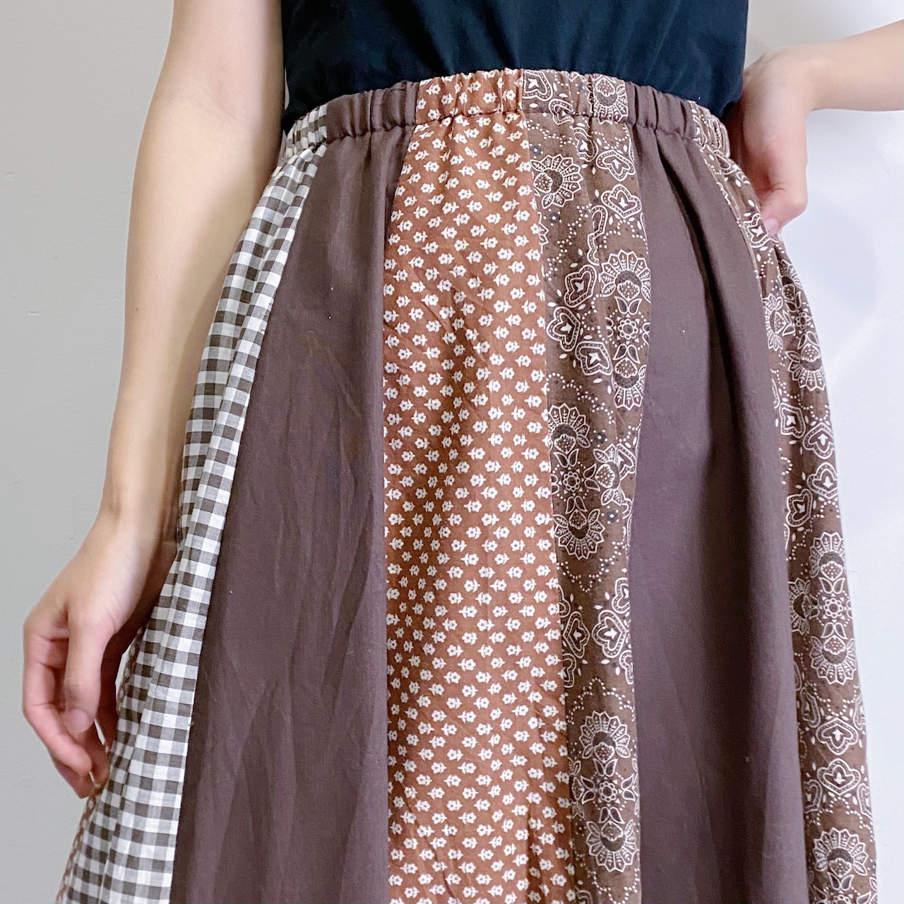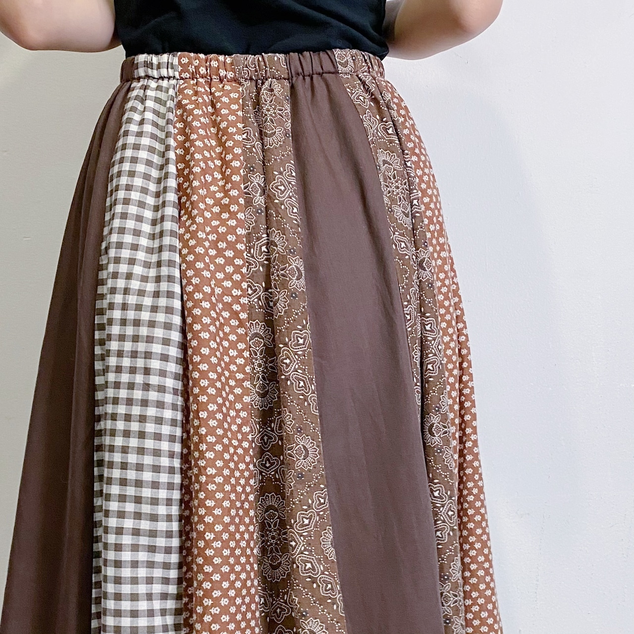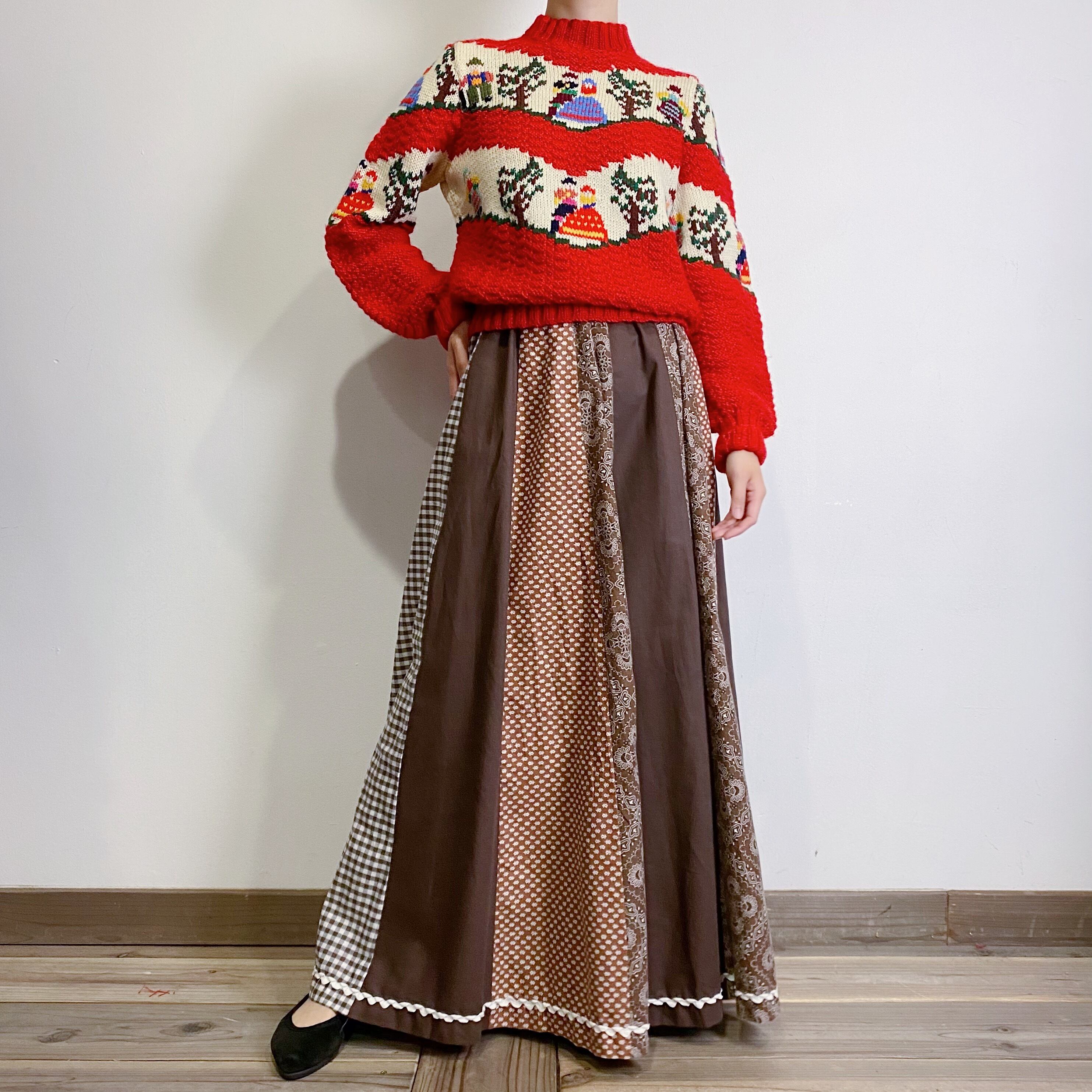 ギンガムチェックや花柄の切り替えパッチワークが可愛い70年代のロングスカートです。