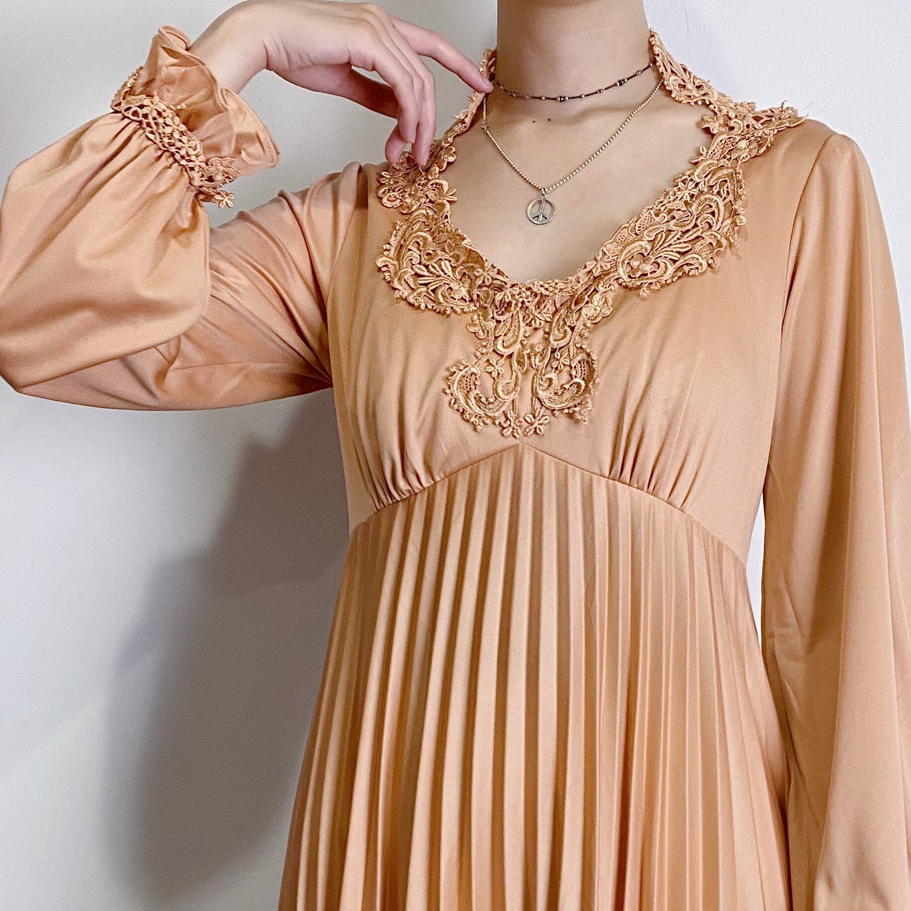 サーモンピンクにも近い色合いのオレンジとベージュの中間のような色合いが可愛い70年代のロングワンピースです。
