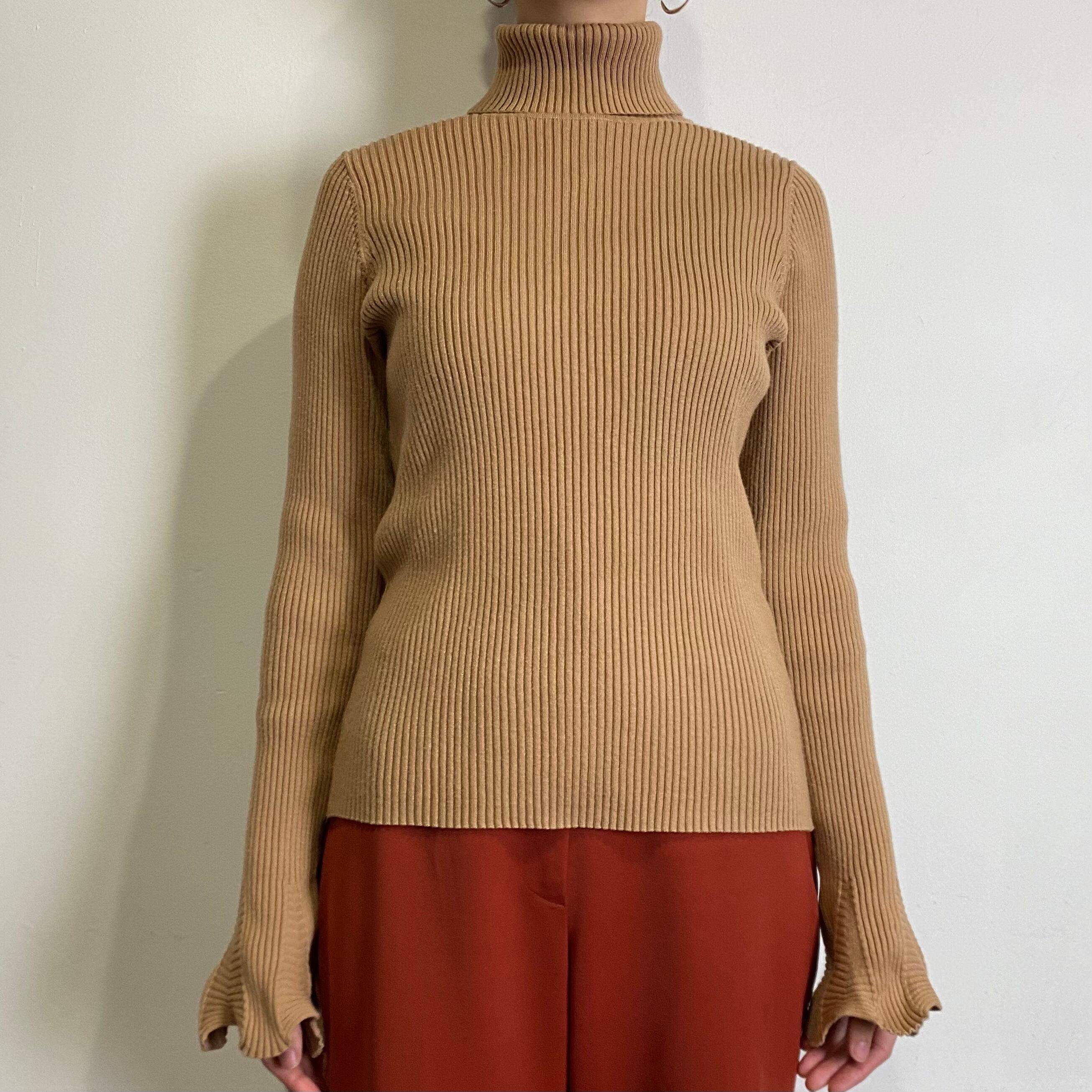 ベージュカラーにリブが可愛い、使い勝手の良さそうなタートルネックニットです。
